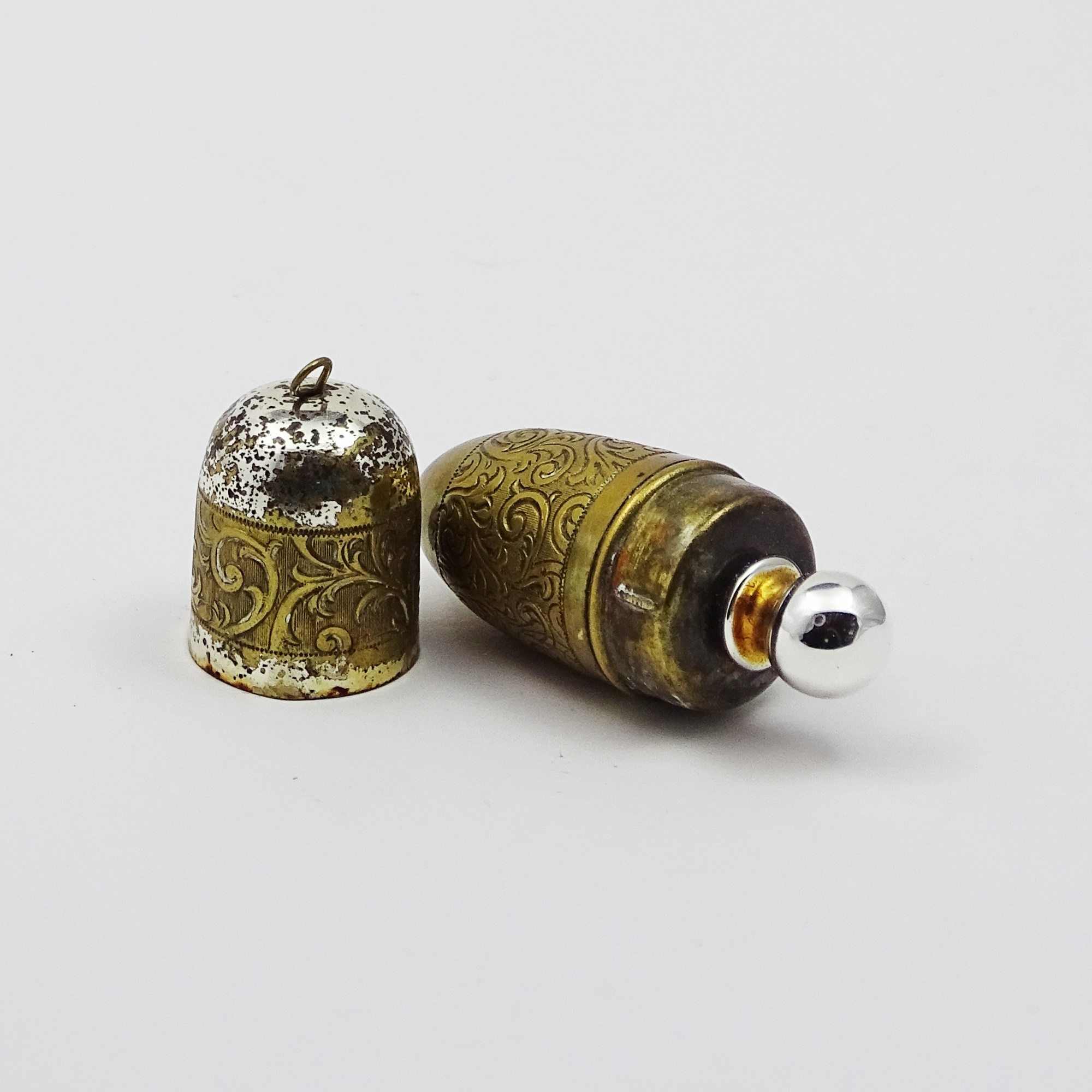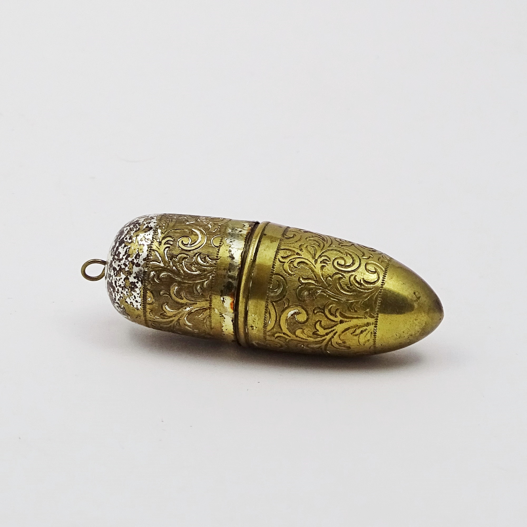 Acorn-shaped scent bottle made of richly engraved metal in two different colors. It opens to reveal a silver-plated glass stopper with a stem. Small hanging ring.