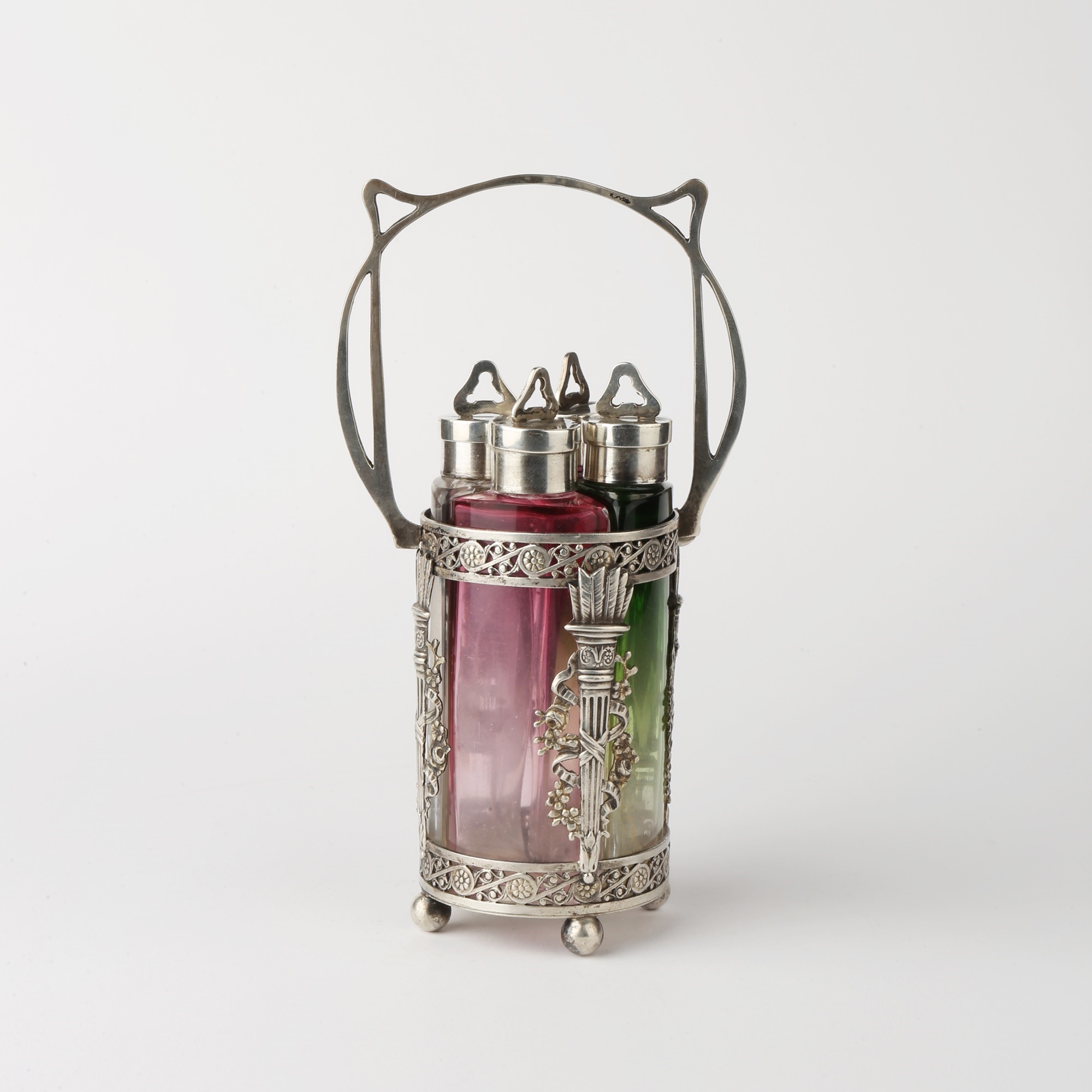 Art Nouveau set of four triangular glass scent bottles in different colors with silver frames, caps, and containers. The cylindrical stand ends with a round handle. It features a quiver-shaped decoration with arrows and four small spherical feet.