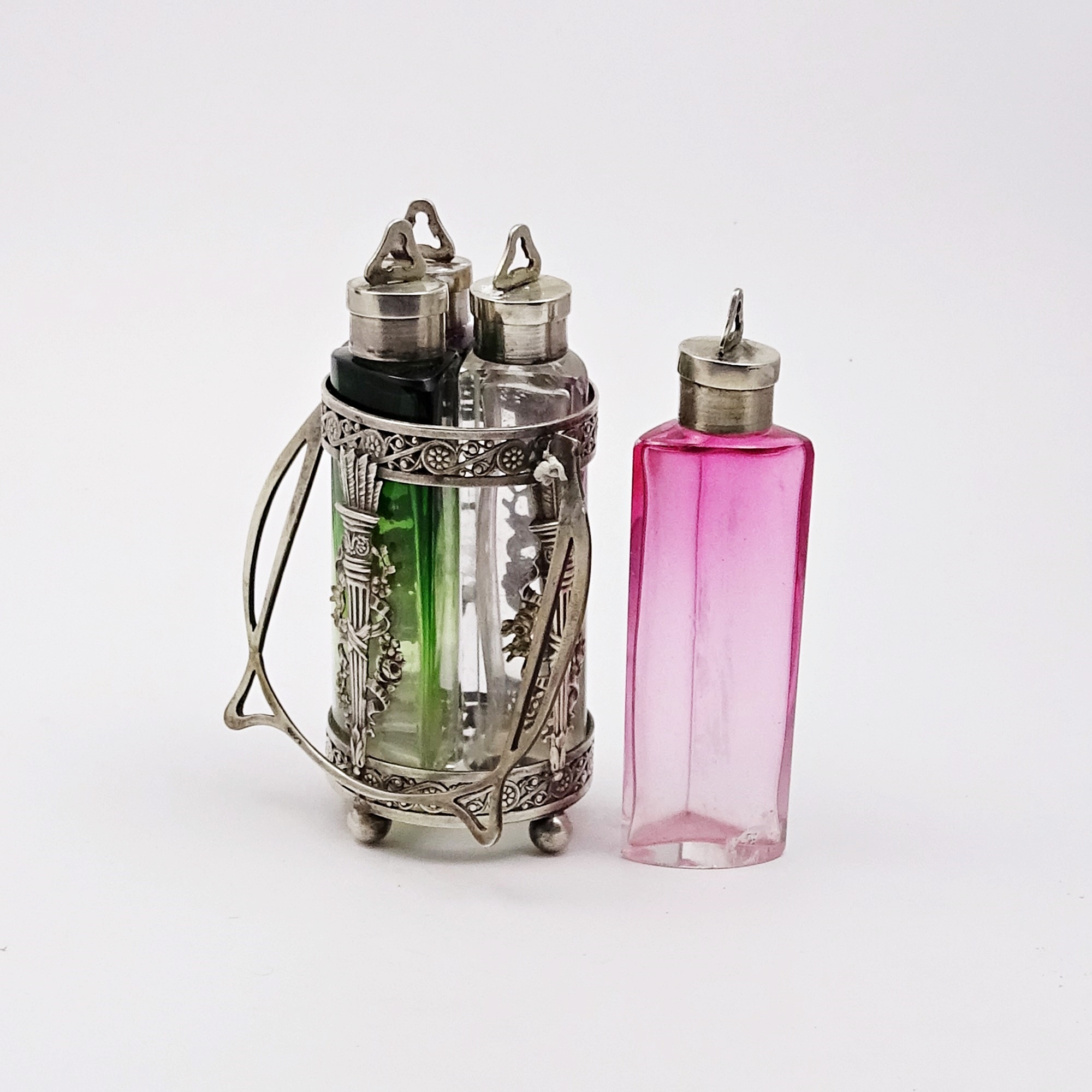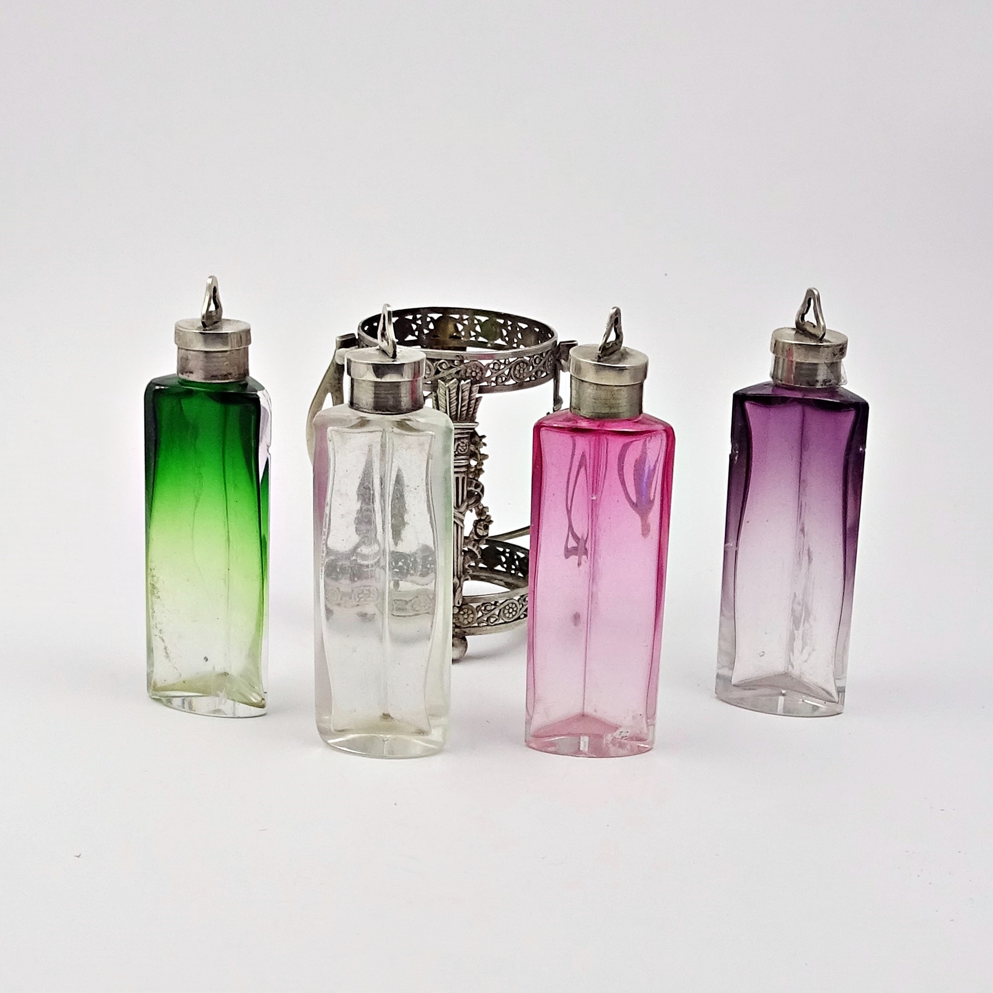 Art Nouveau set of four triangular glass scent bottles in different colors with silver stand