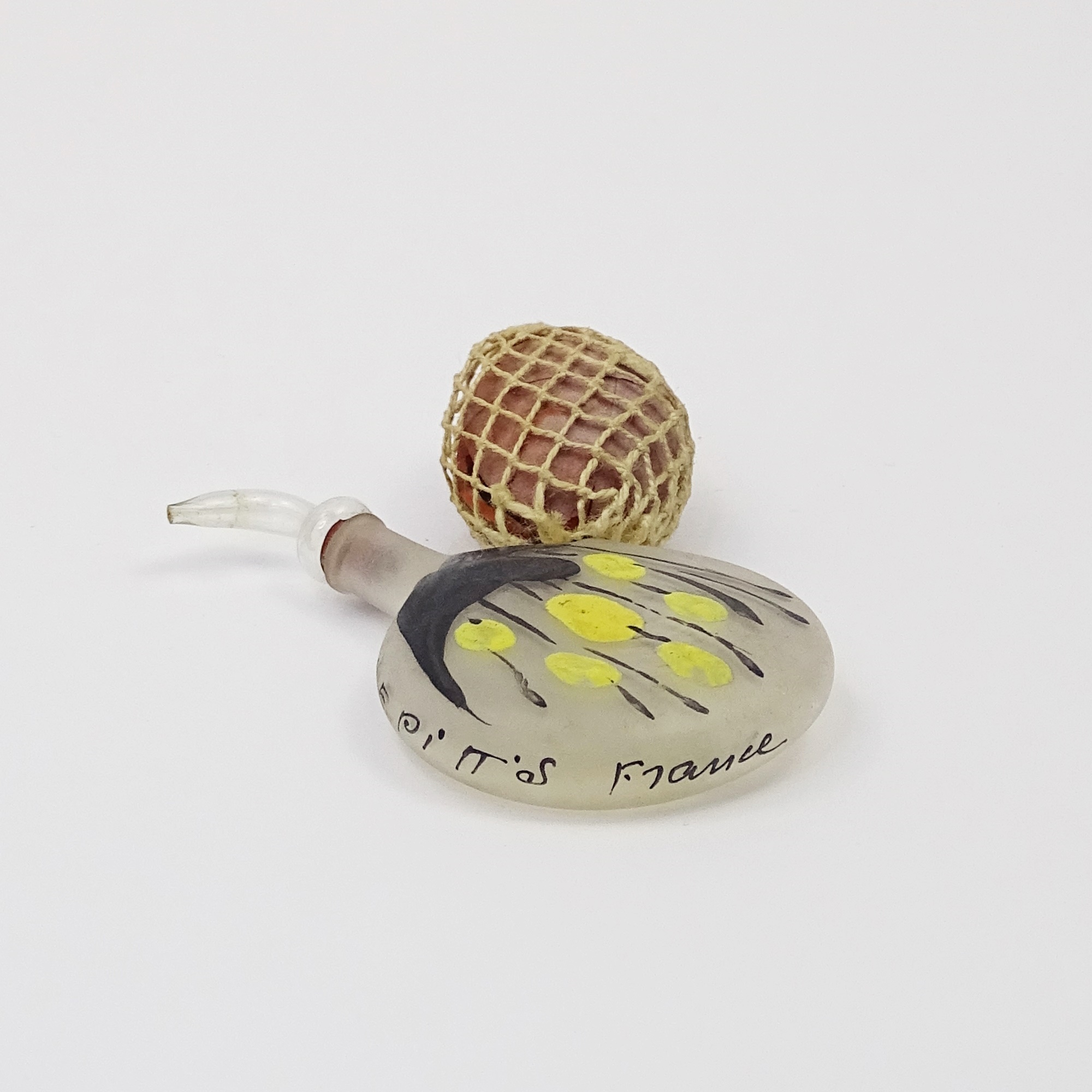 Frosted glass flat round scent bottle hand-painted in yellow and black. Along the rim the words:” LE PI IT’S France”. The glass stopper is very peculiar: a little alembic with a long wand, sealed with a rubber ring. It retains the original rubber atomize bulb.
