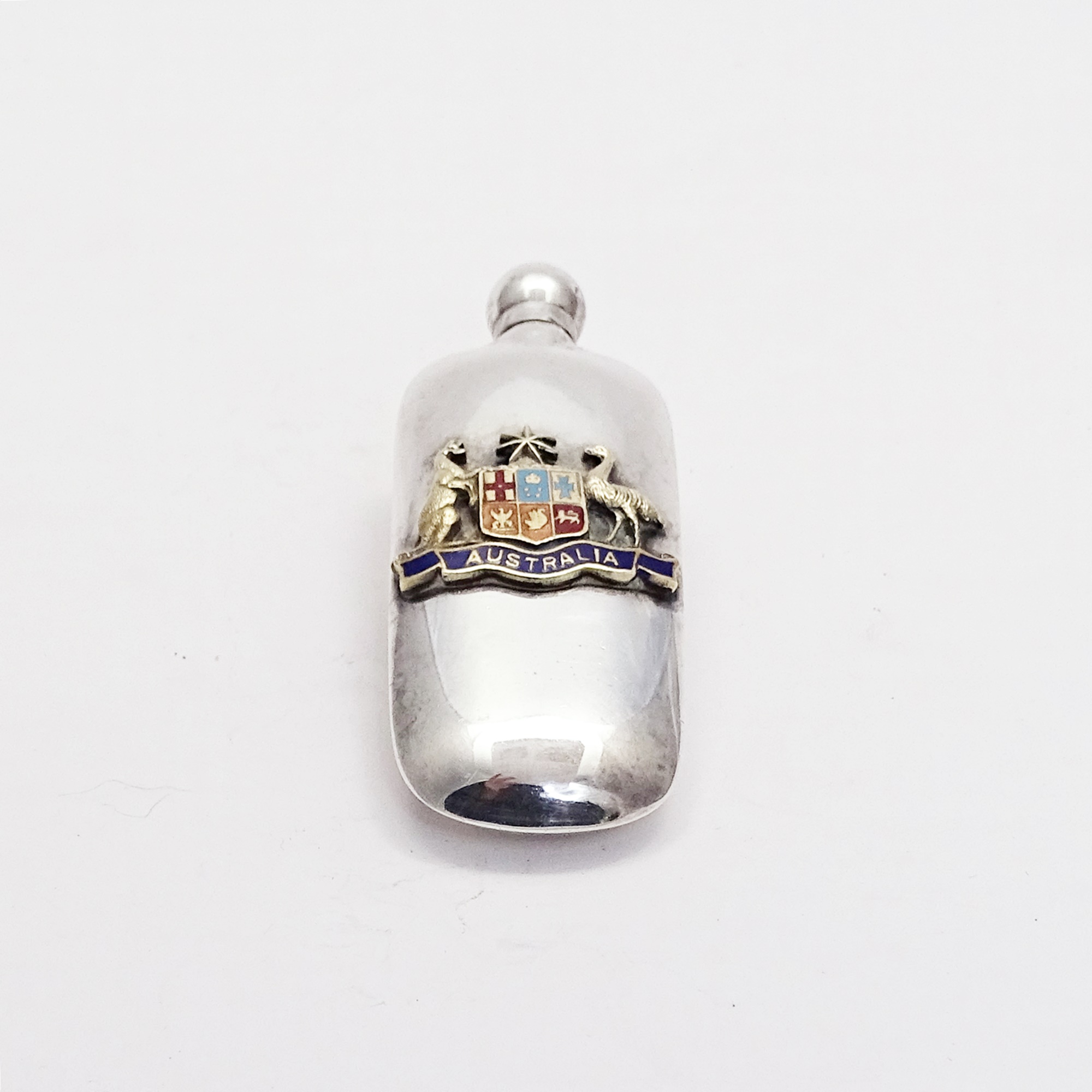 Flask-shaped crested scent bottle in metal, bearing an enamel badge coat of arms stating Australia. Marked EPNS on the back for “electroplated nickel silver”. Little screw top.