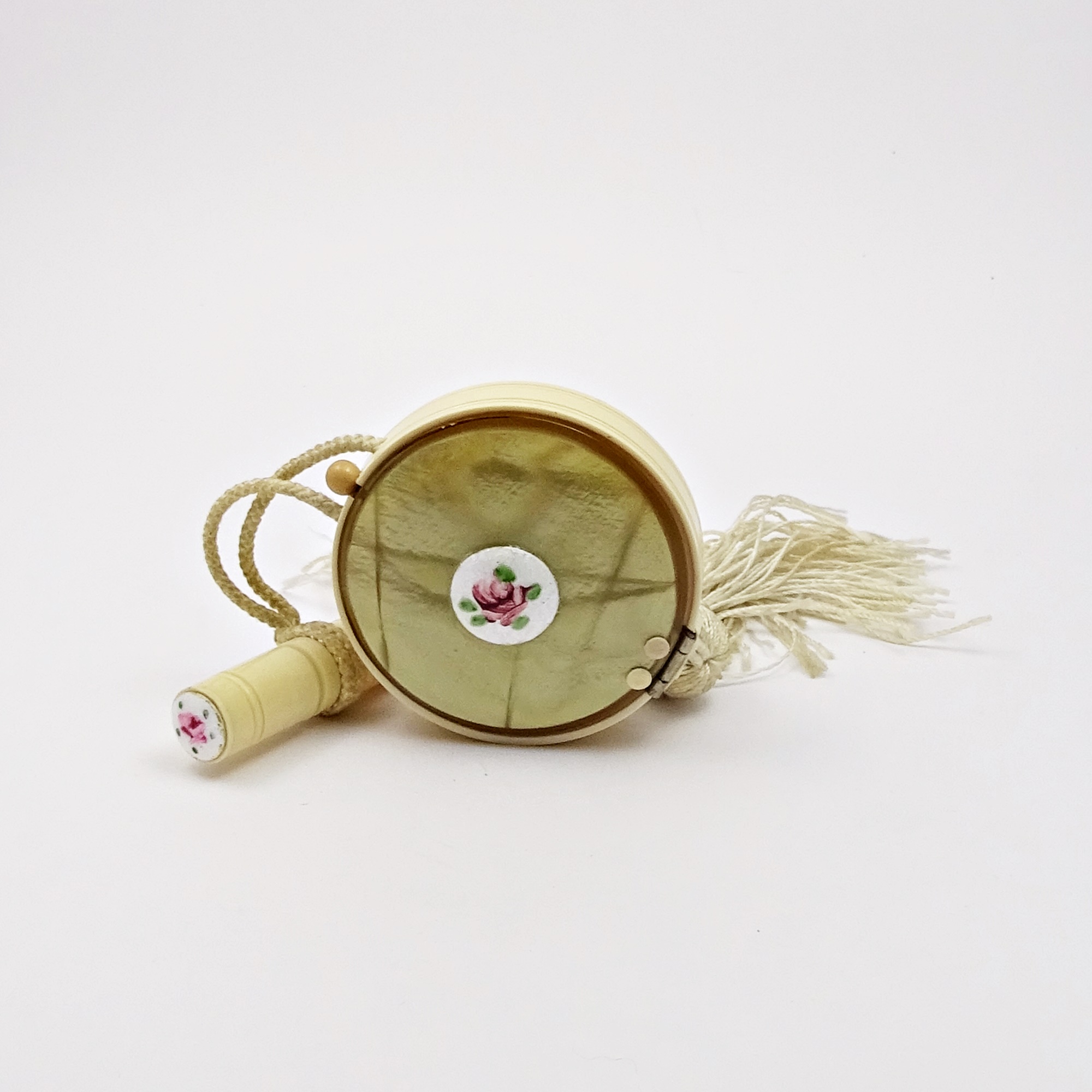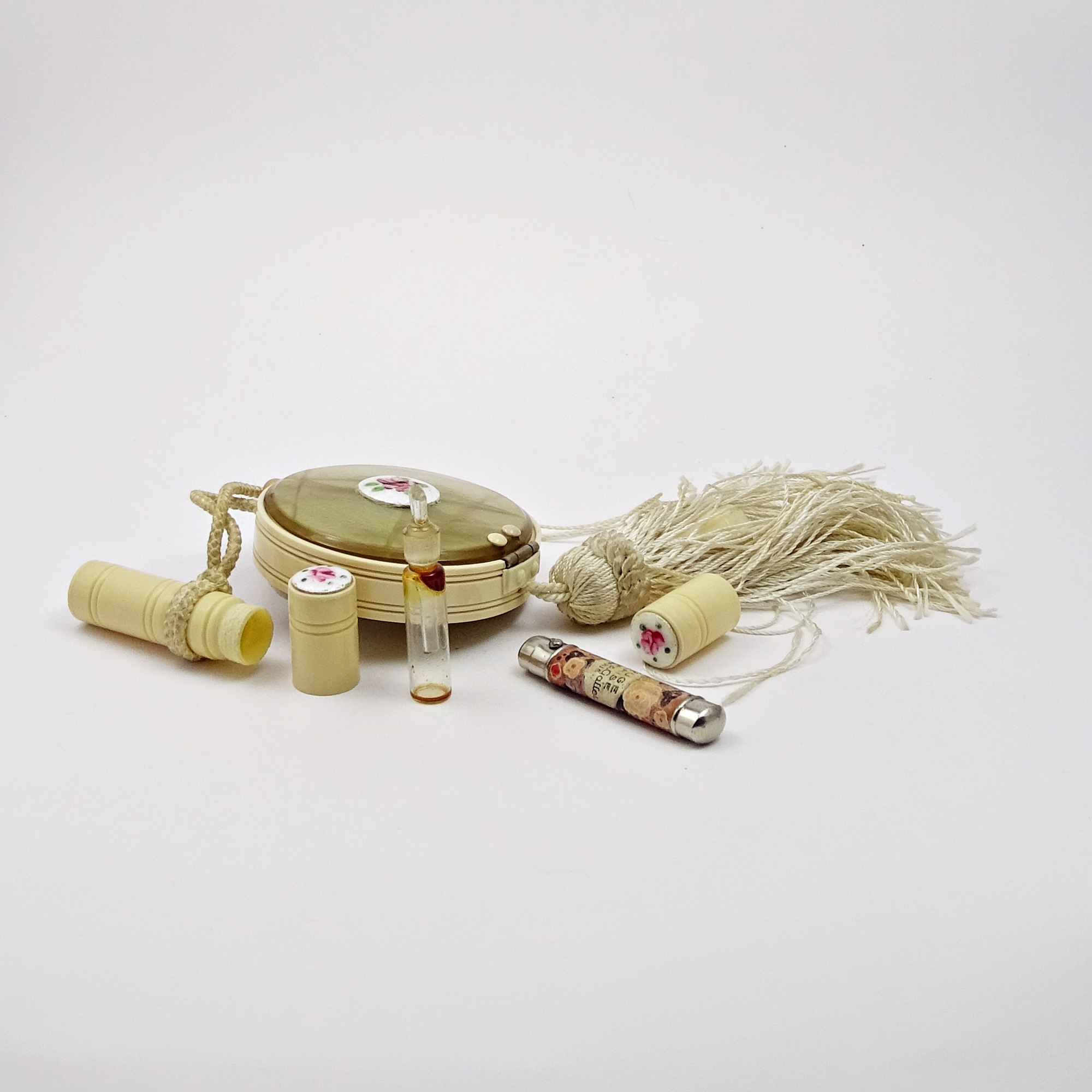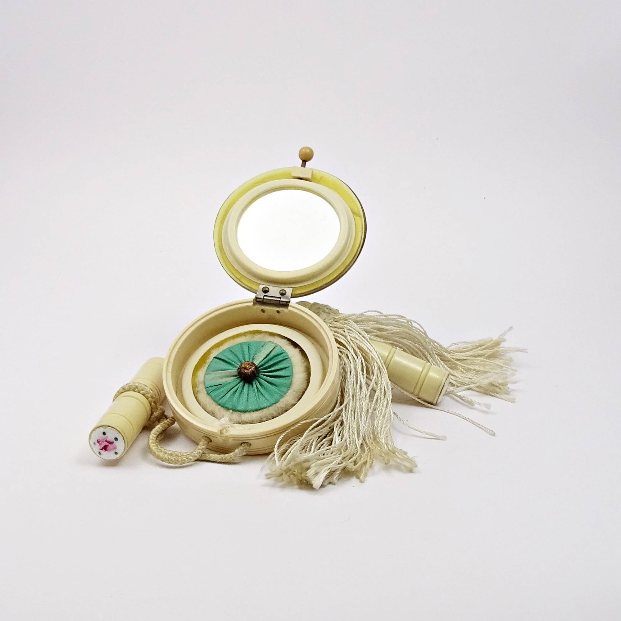 Bakelite set with guilloche enamels. The three containers – linked by a string- retain a little perfume vial, a powder compact with mirror and pouff and a empty lipstick by Roger & Gallet (Rouge Cerise) covered by a white tassel.