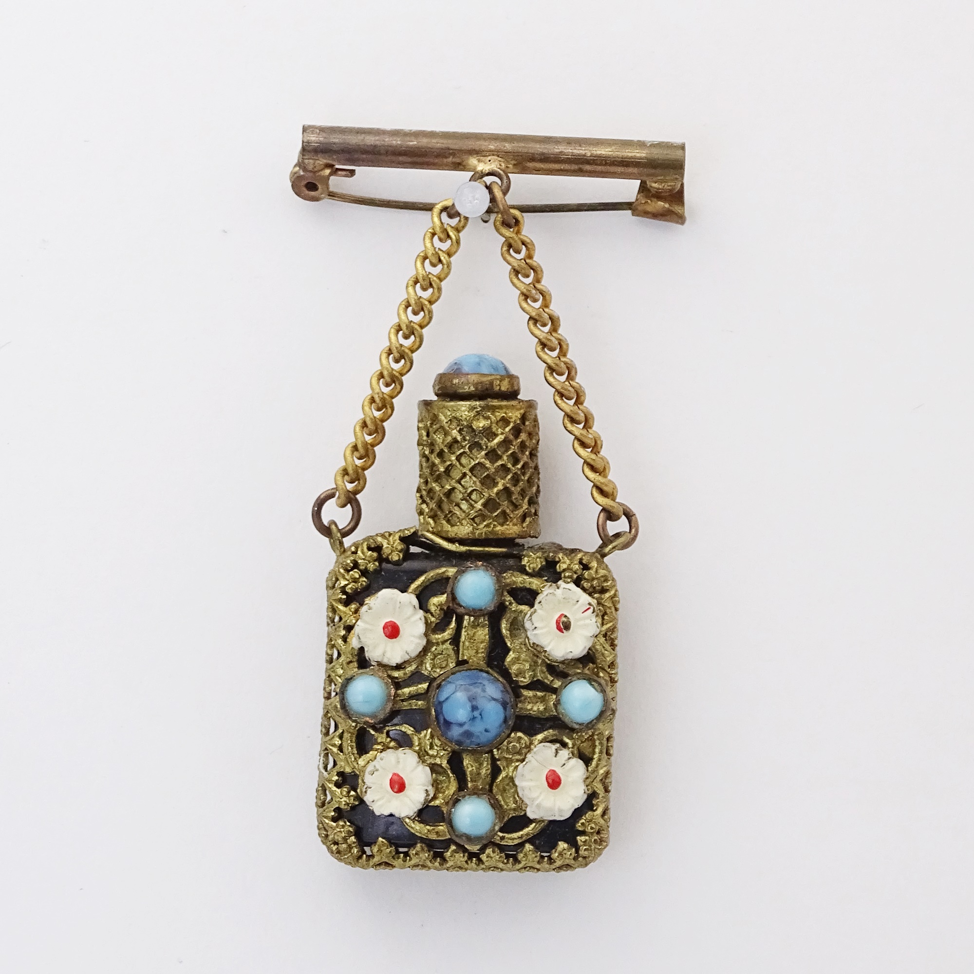 Bar brooch with square glass scent bottle in a metal cage with turquoise and white enamel flowers