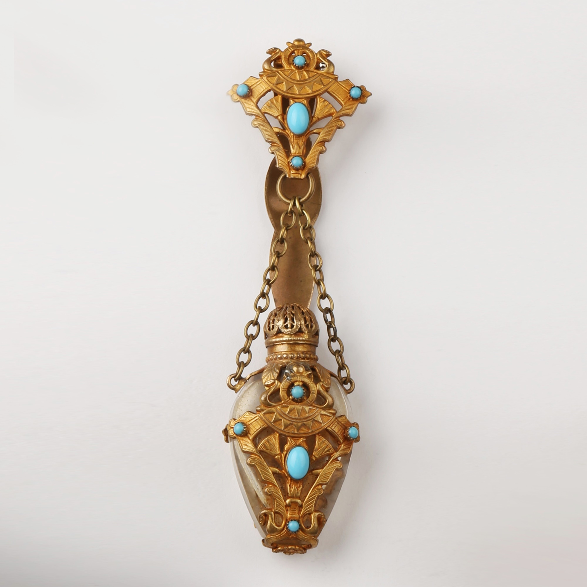 Belt-chatelaine scent bottle in cut crystal enclosed in a gilt metal cage with fake turquoises featuring a decor in Egyptian Revival Style, probably following the public attention of ancient Egyptian monuments generated by Napoleon’s conquest of Egypt. matching belt clip and hinged cap with inner glass stopper.