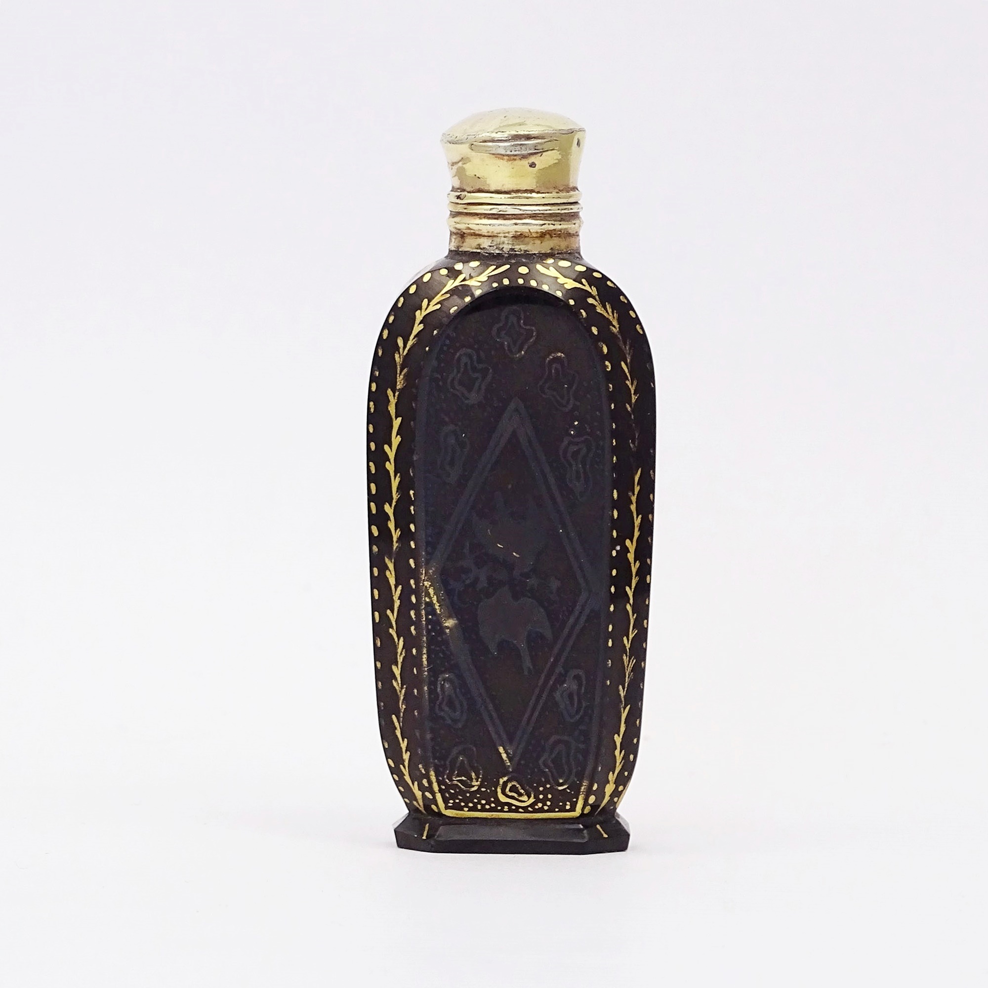 Black glass scent bottle with very faded gold painted decorations. Vermeil hinged cap with marks and inner glass stopper.