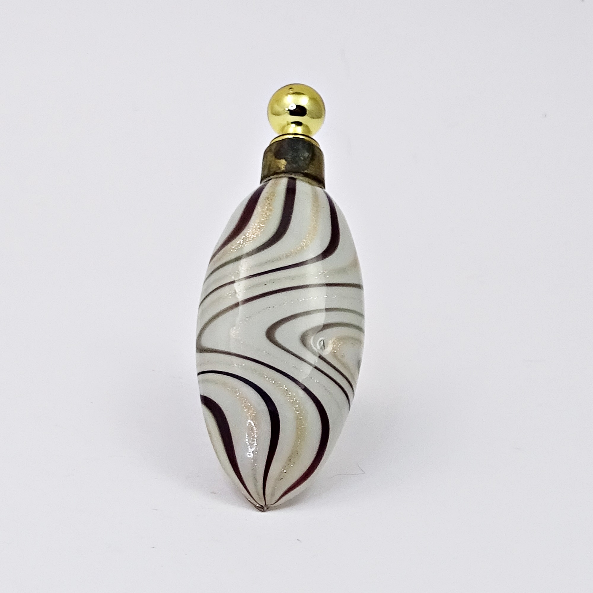 Home » Collection » Ovoid scent bottle in mercury glass with black and gold swirles on white ground