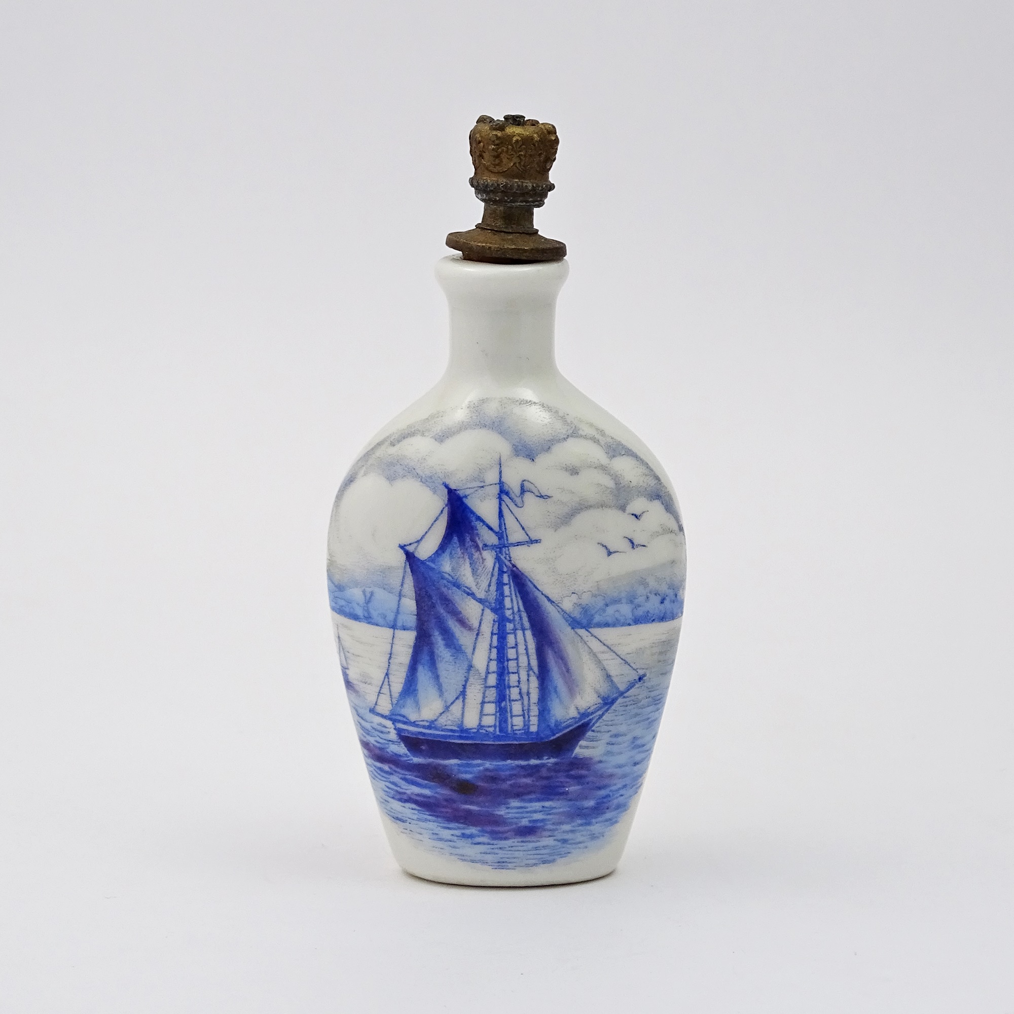 Blue and white porcelain scent bottle showing a sailing boat on the front. The back side is white. Gilt metal crown top. It could have been used by the Boldoot Company of Amsterdam for their colognes.