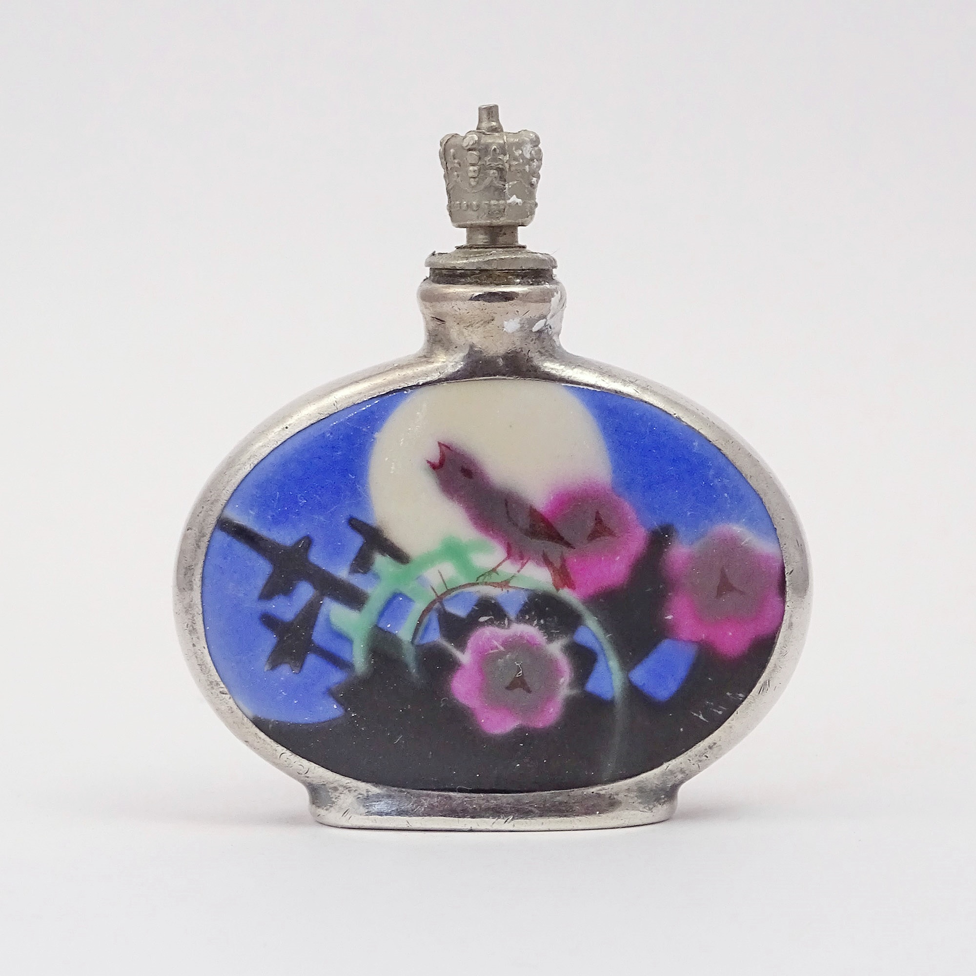 White enameled porcelain scent bottle with a nocturnal scene where a nightingale sings at the moon. Silver rimmed. Metal crown cap.