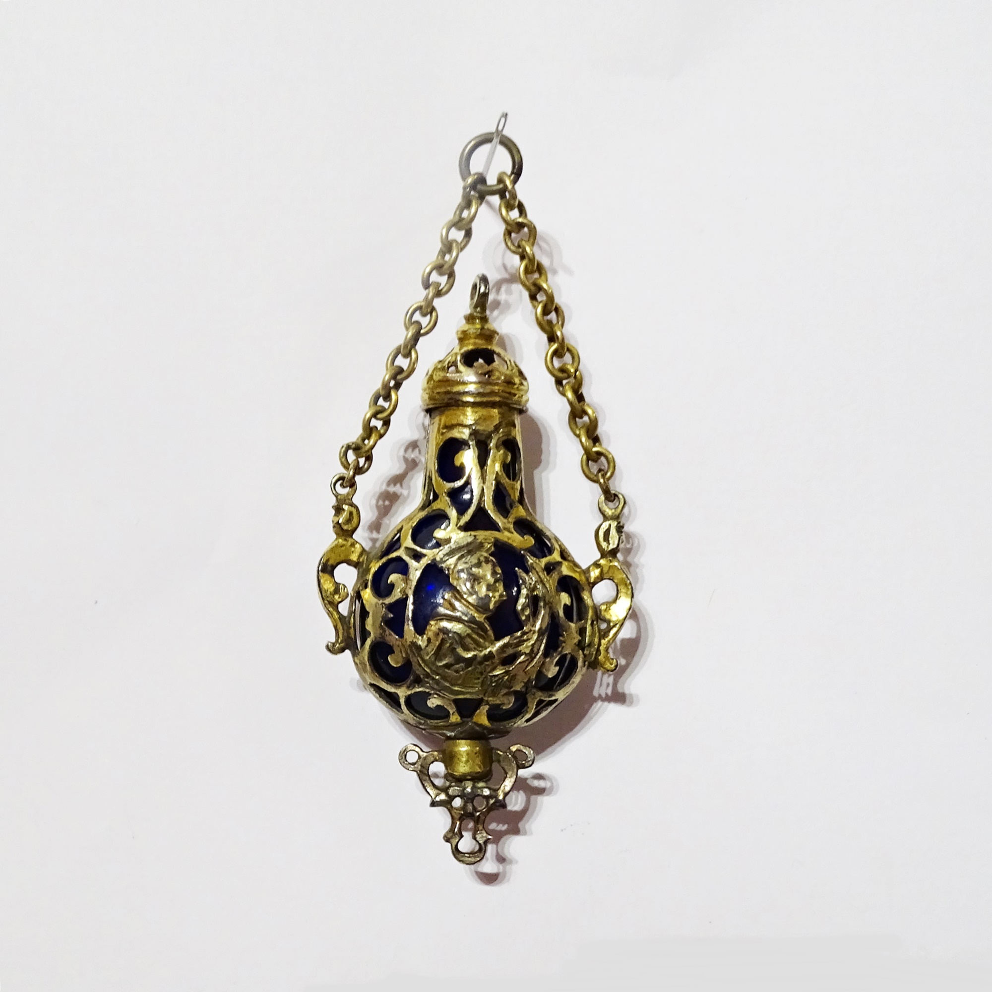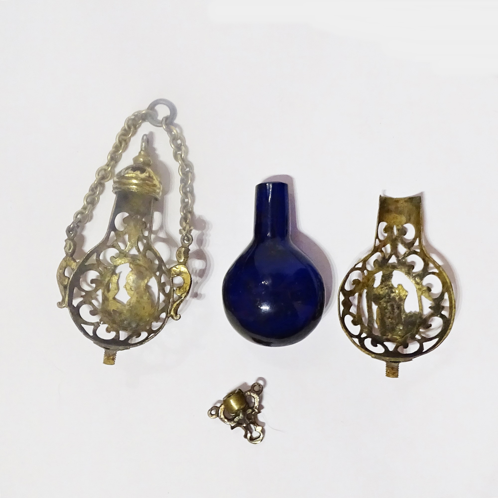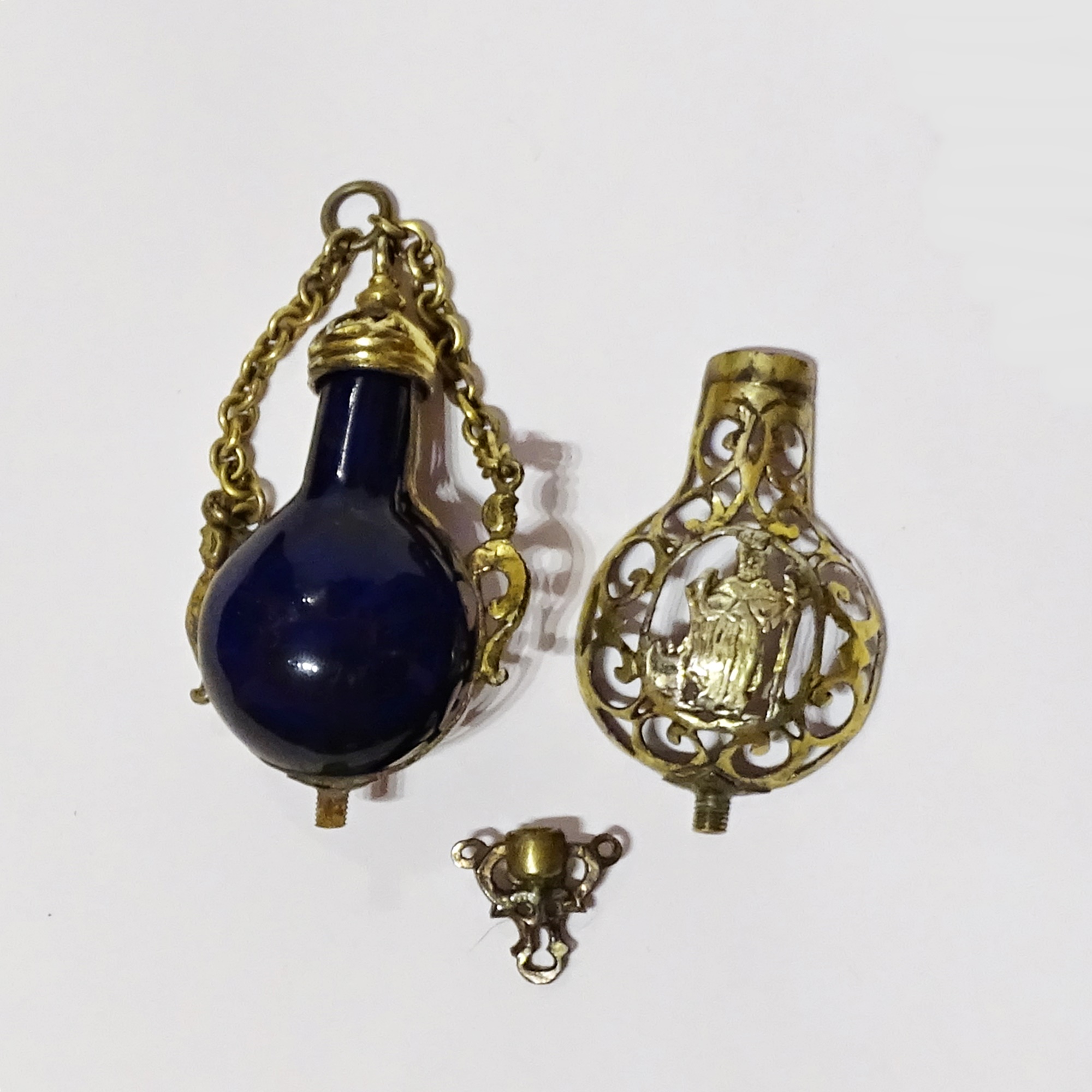 Blue glass flat-round scent bottle enclosed in a gilded silver openwork cage showing on the front Saint Ulrich (identified by the fish – protector of the city of Augsburg) and on the other one Saint Francis of Assisi praying on front of the crucifix. The peculiarity of this bottle is in the opening method: the cap is welded to the cage and allows the sprinkling of the liquid contained, but to fill the bottle it is necessary to unscrew the pin that holds the two parts in which it is enclosed. Short suspension chain. In my opinion, probably a vessel for sacred scent oil.