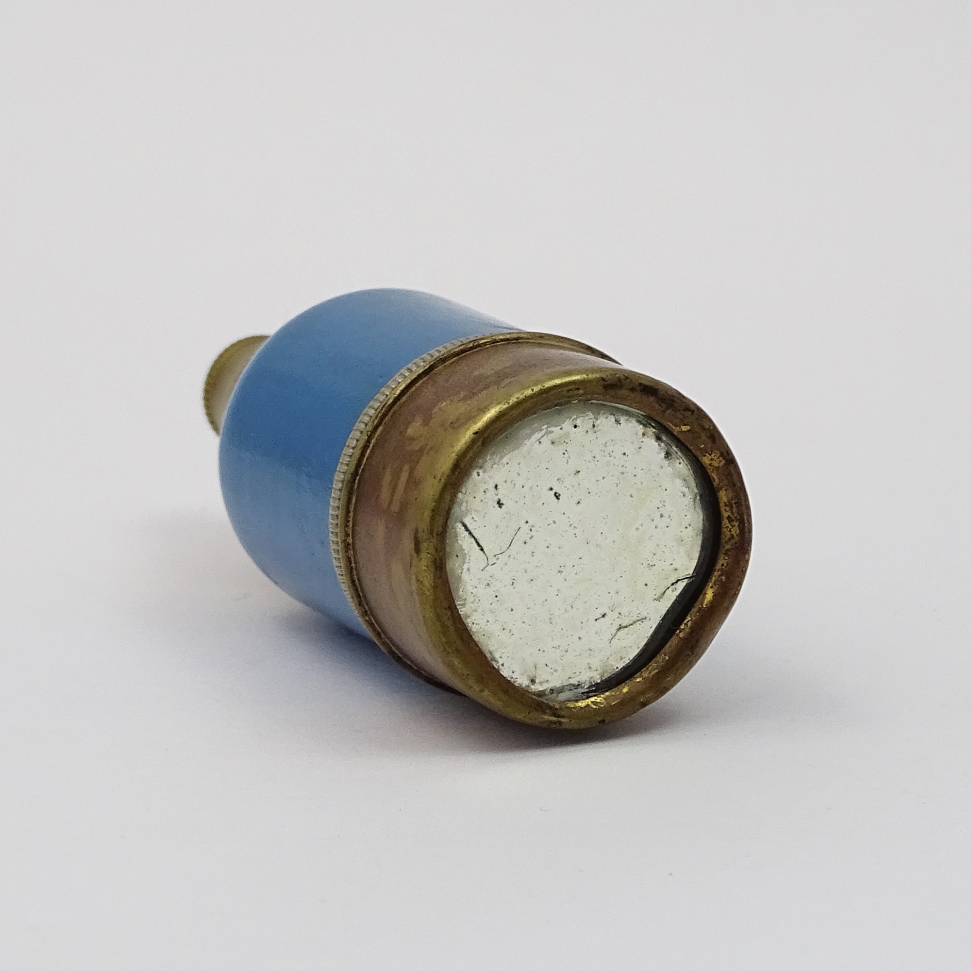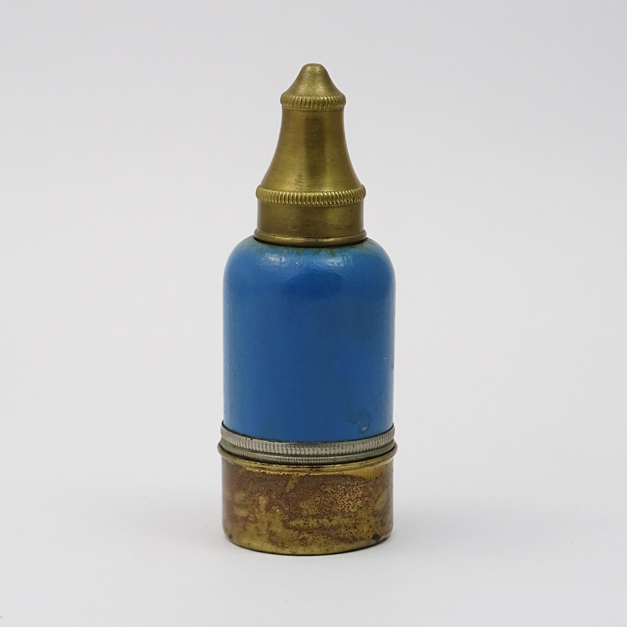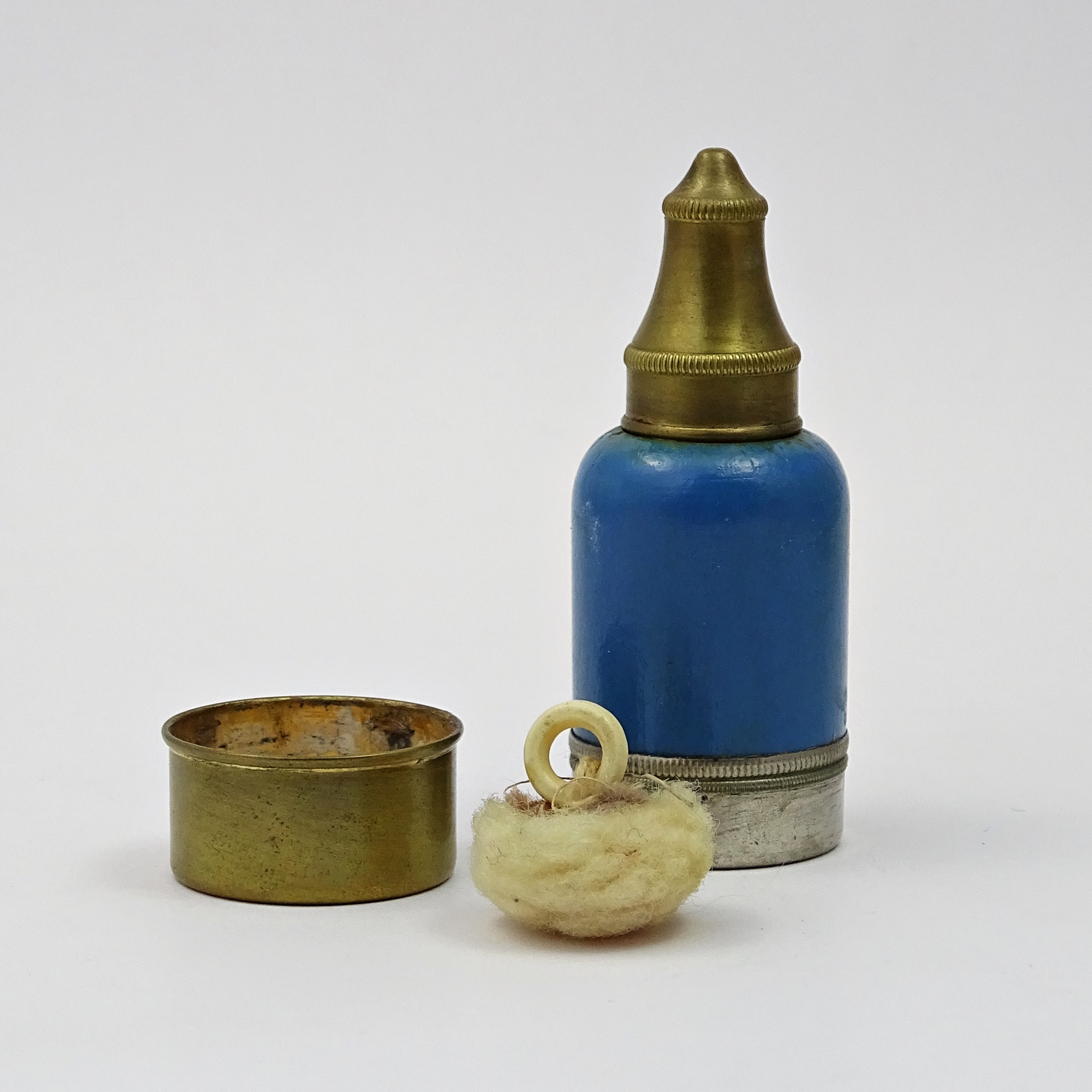 Blue-painted wood scent bottle with screw brass cap and bottom container, ending with a mirror, that retains a compact pink powder and a powder puff with little plastic or bone ring.