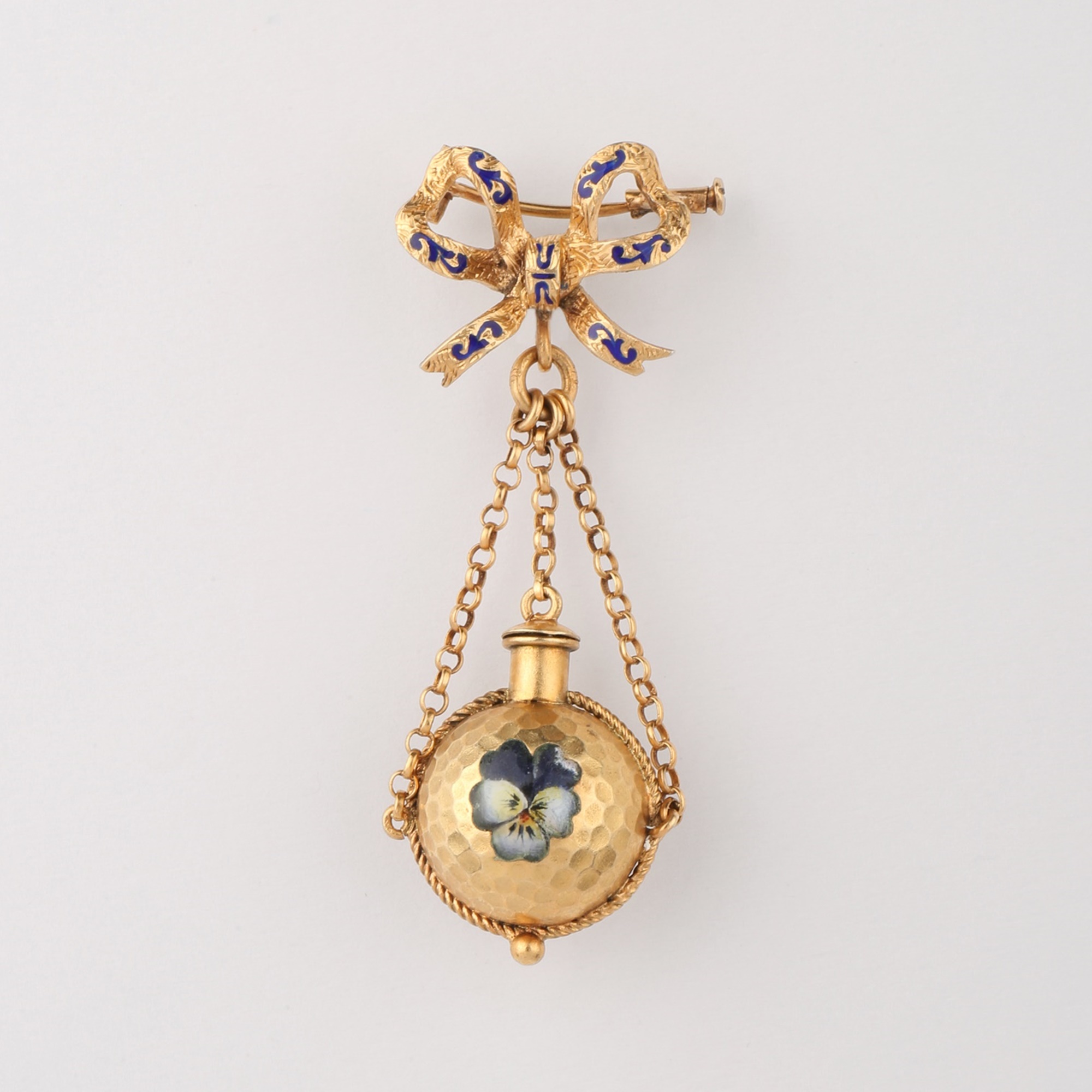 Brooch scent bottle in gold and enamel: globular hammered body with an enamelled pansy. Tiny screw cap with triple suspension chains. Ribbon shaped brooch with touches of blue enamel. Tiny illegible marks.