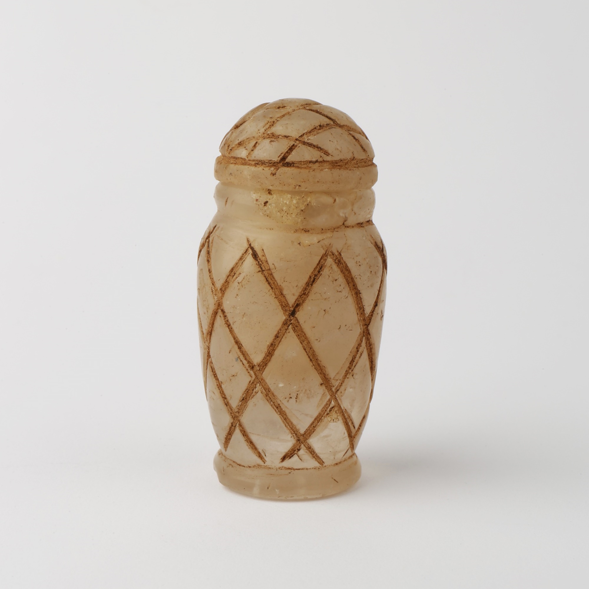 Unguentarium made of alabaster, carved and painted to made a diamonds decor. Matching hemispherical stopper.