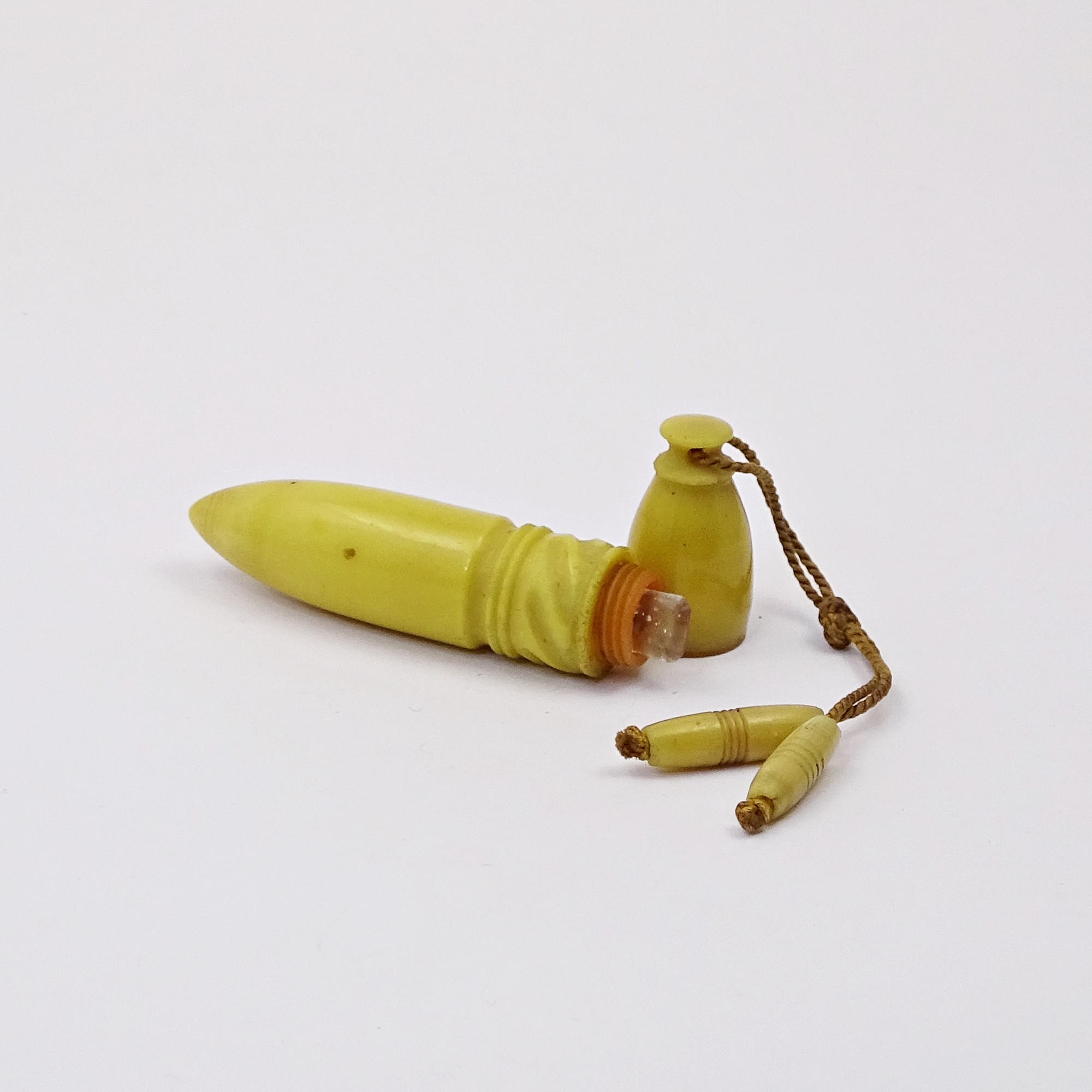 Home » Collection » Carved bakelite case with tangles containing a clear glass vial