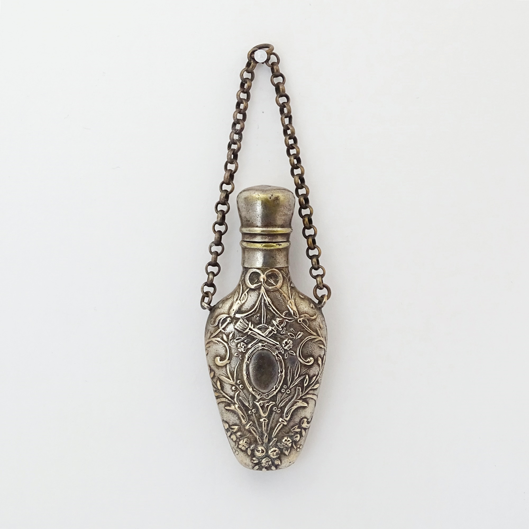 Chatelaine scent bottle in metal alloy with a rich Rococo Revival motif