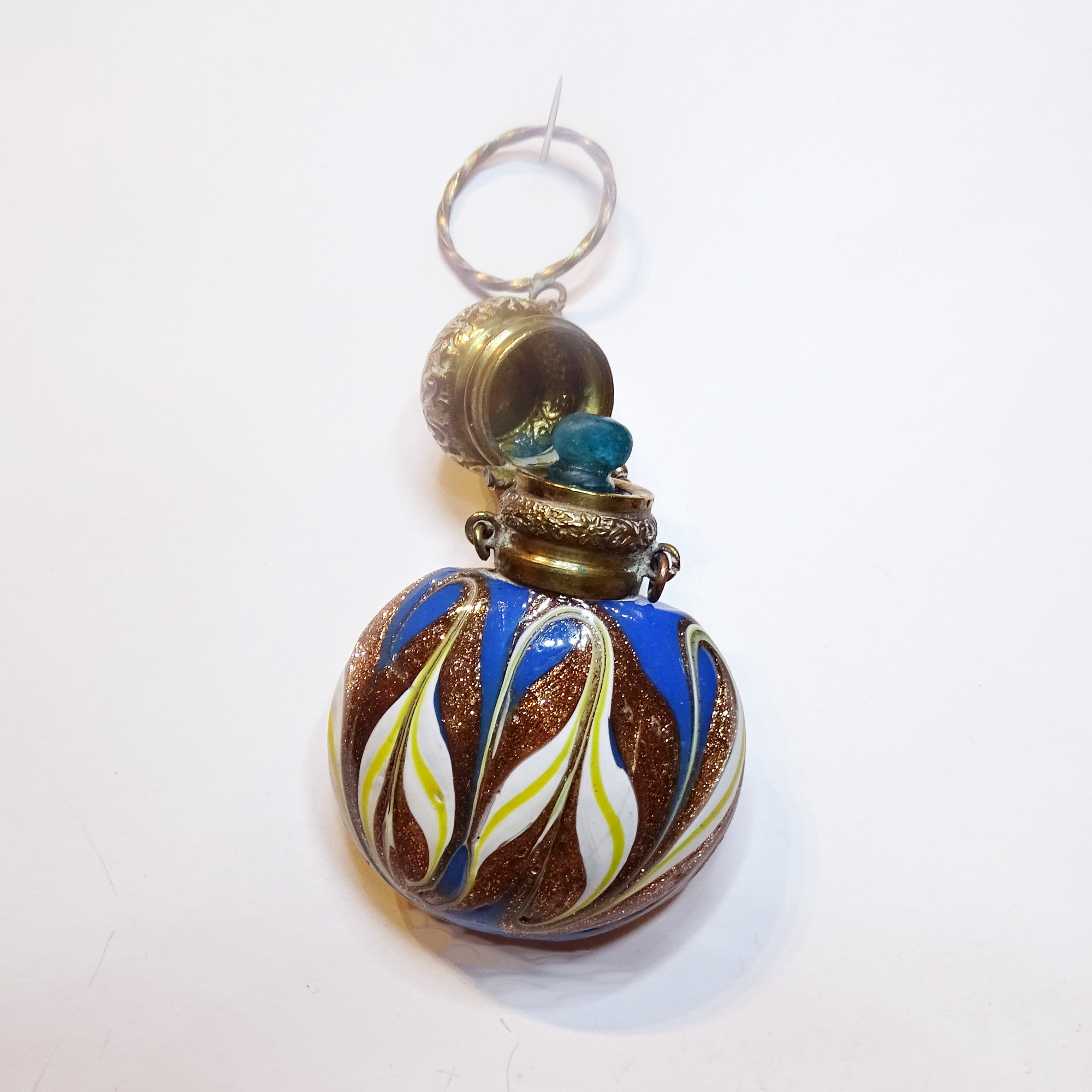 Scent bottle made with three type of glass: blue glass, aventurine and “lattimo” (milk glass)-, forming a feathers decor. Brass-mounted and hinged cap turbant-shaped. Inner blue glass stopper. Suspension chain and ring. Possibly by Salviati.