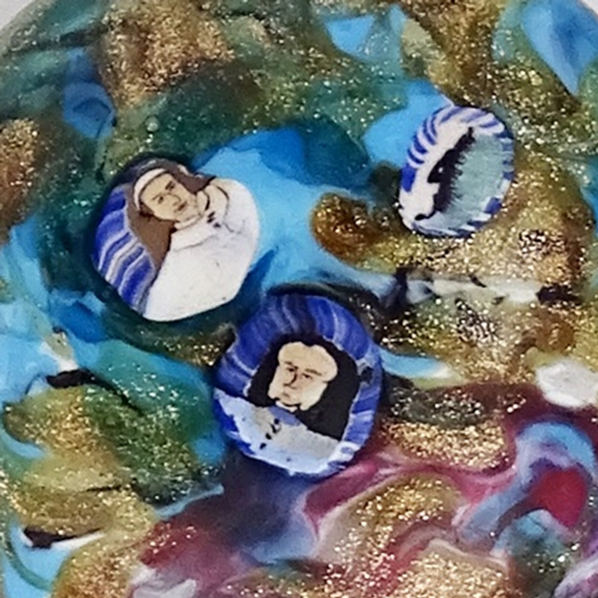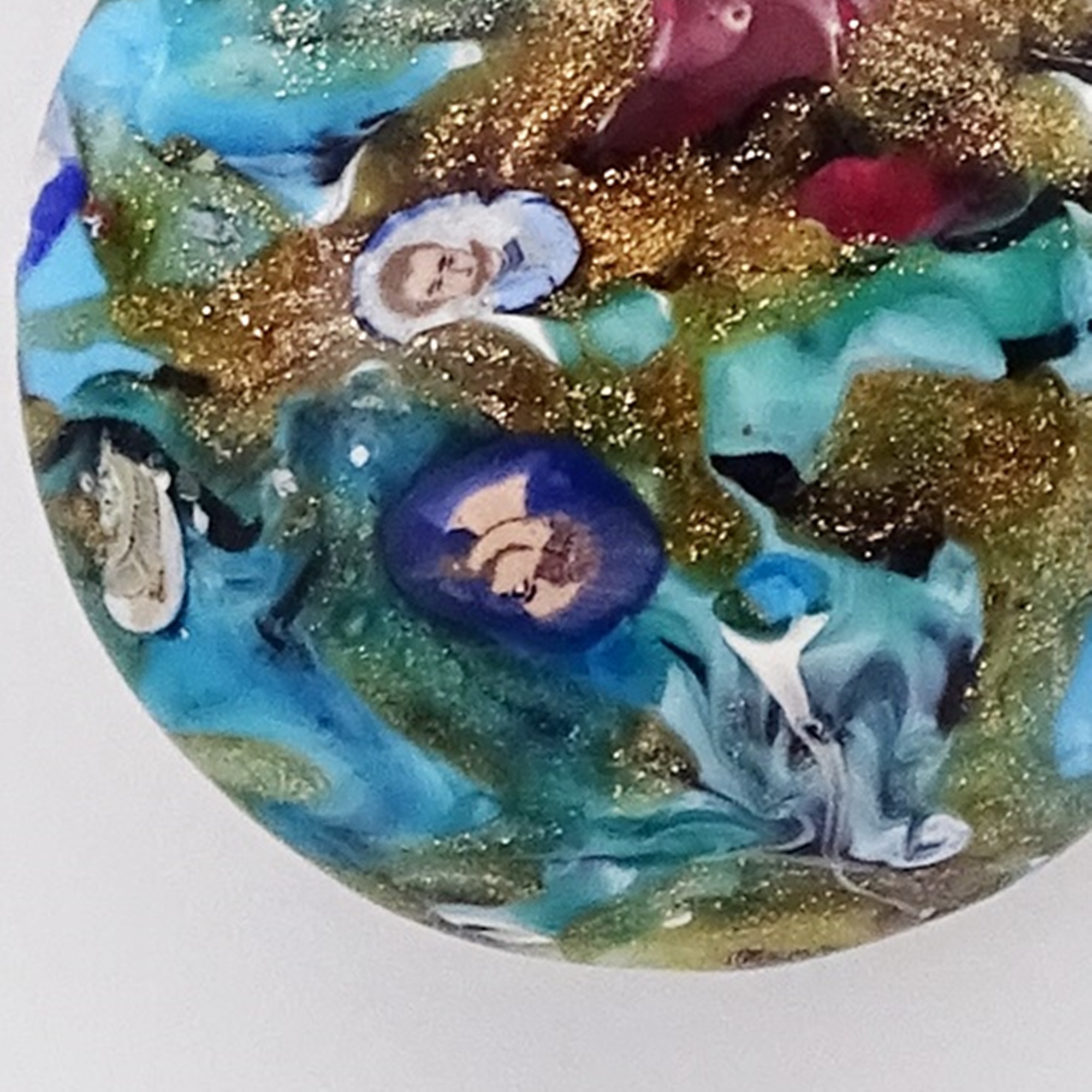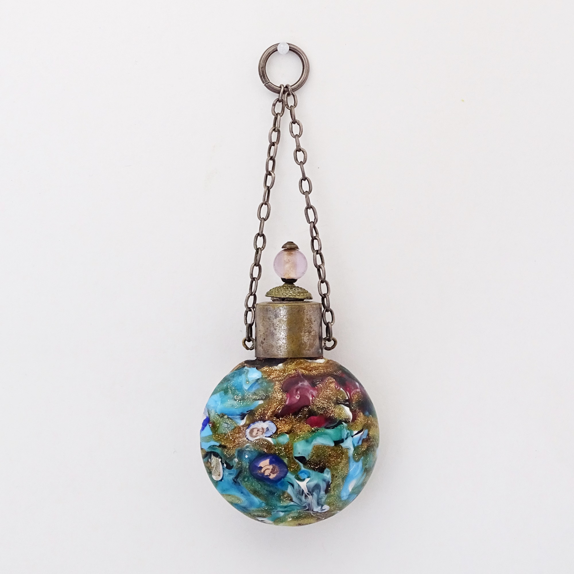 Murano glass and specks of gold aventurine scent bottle with five murrine portraits: the Pope Pio IX, Francesco Giuseppe, the Austrian Emperor and his brother Maximilian (2); Vittorio Emanuele II, first king of Italy. Also two other murrine: a little black gondola and the Rialto bridge. Metal mount. Original stopper in metal and cork with a tiny pink glass bead. Suspension chain with little ring.