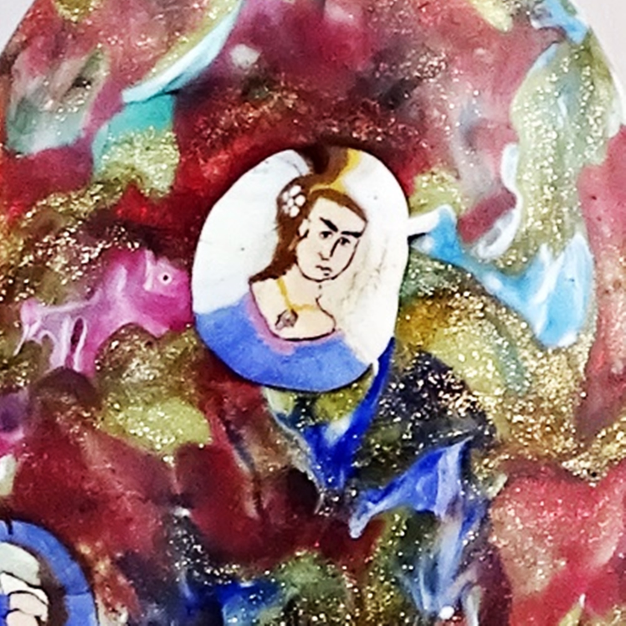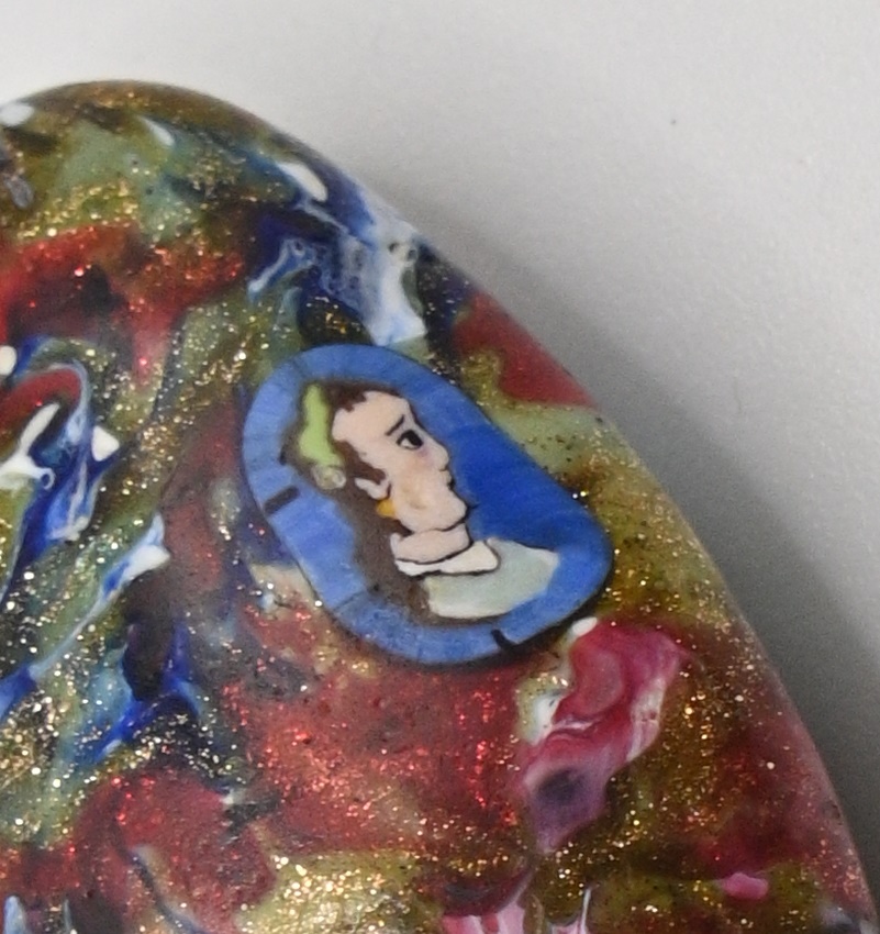 Obsidian glass and specks of gold aventurine scent bottle with figurative murrine canes featuring three portraits of exceptional quality: Napoleon (the rarest portrait in this kind of bottles) and his nephew Napoleon the 3rd with his wife Eugenia de Montijo. Brass mount and hinged lid with repousse foliate decoration. Suspension chain with ring.