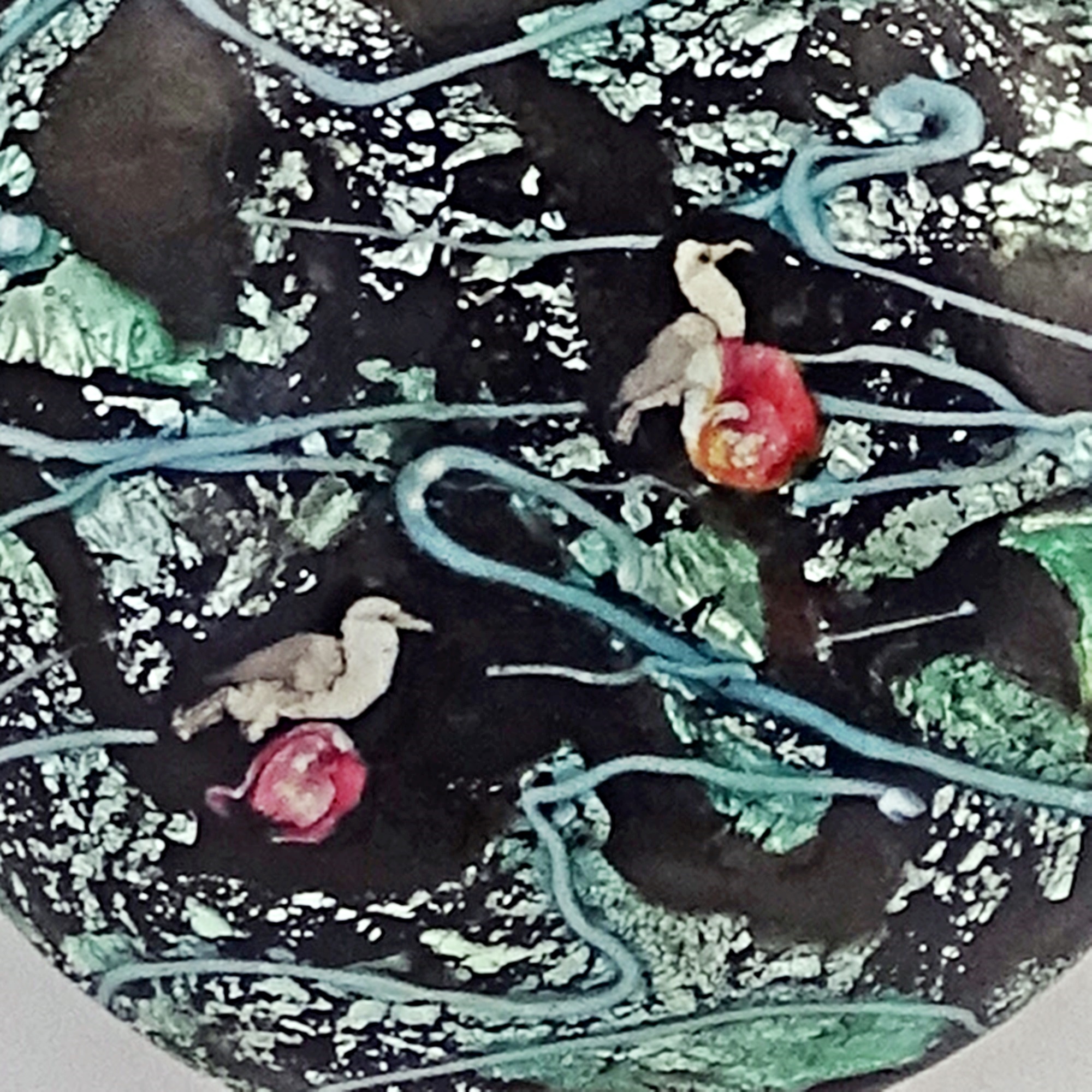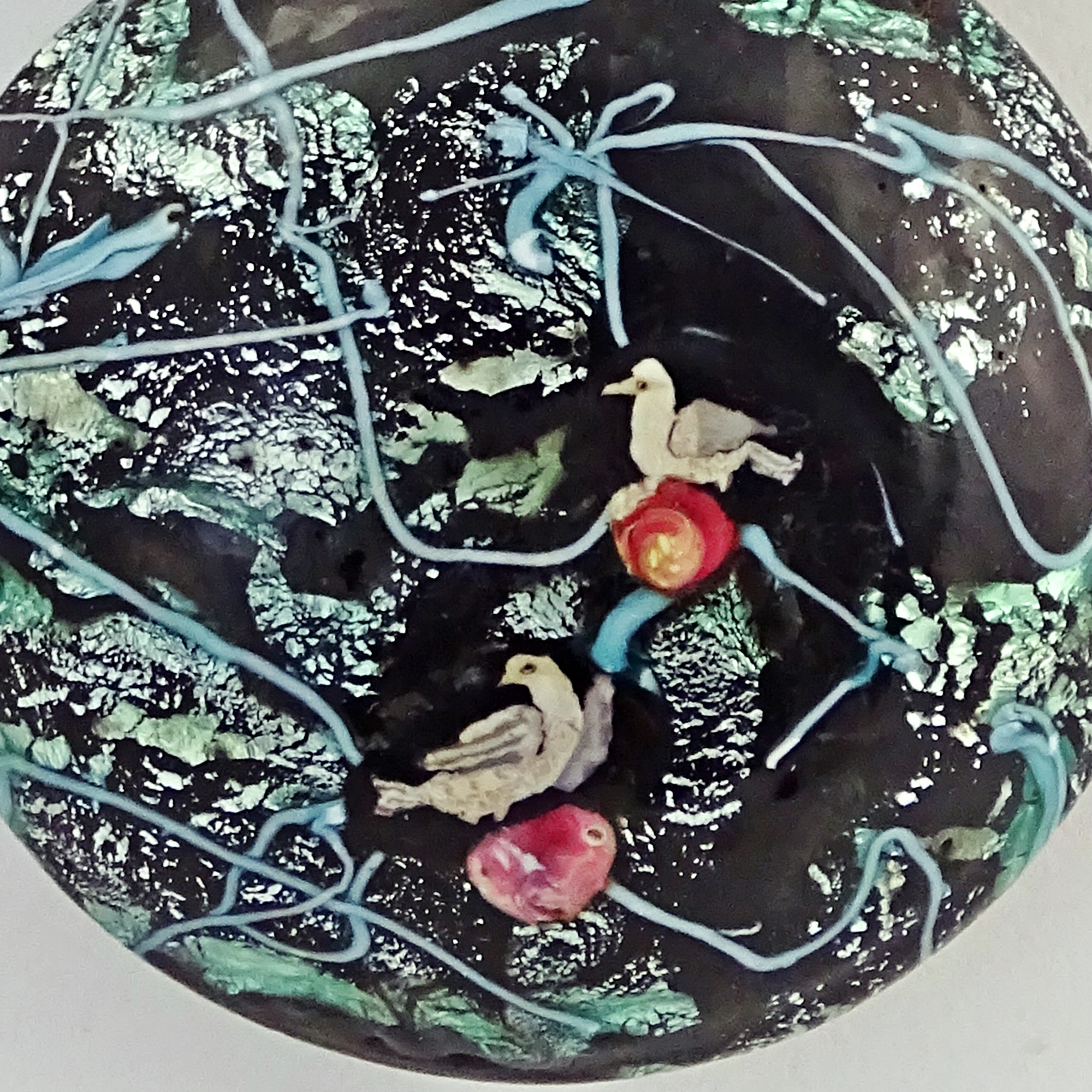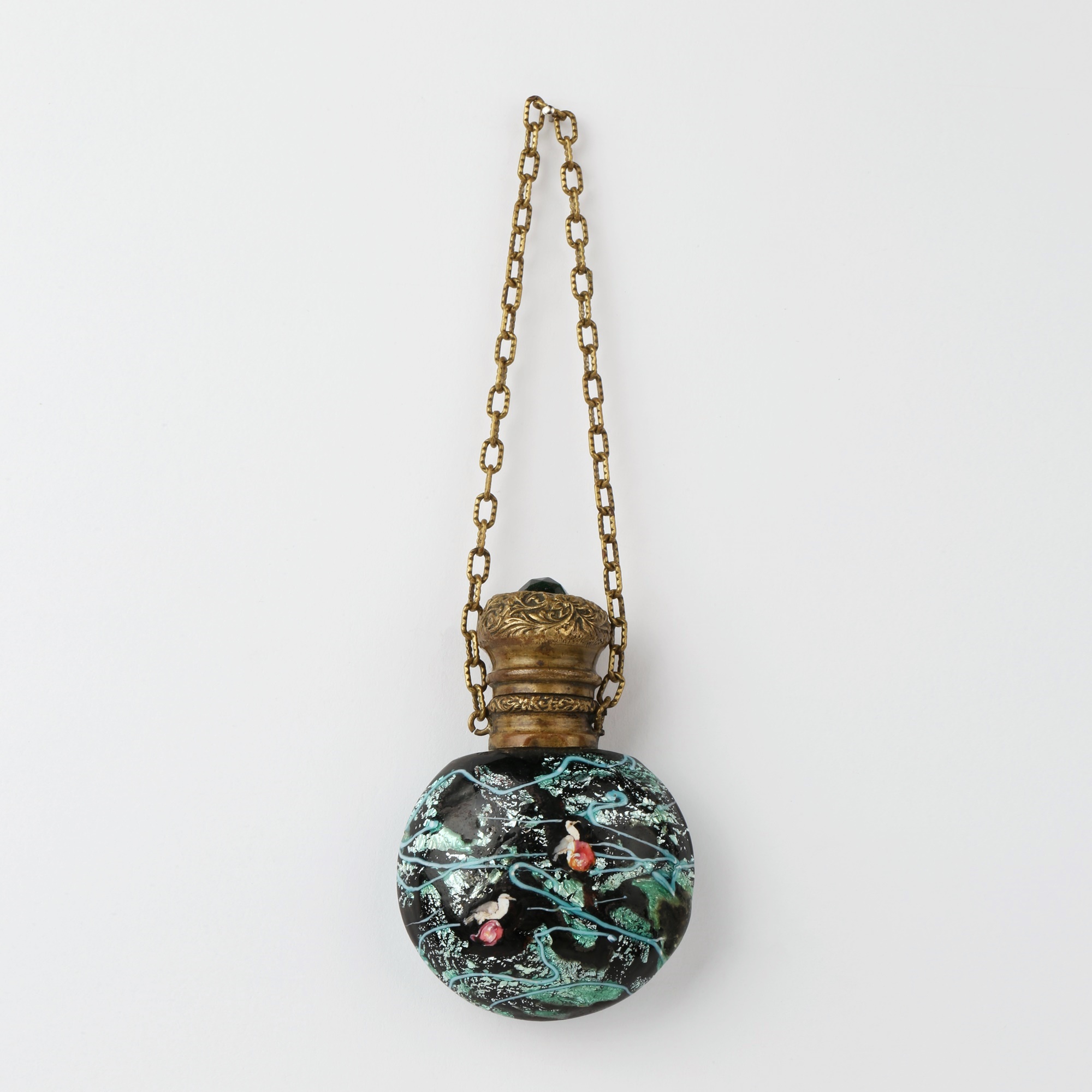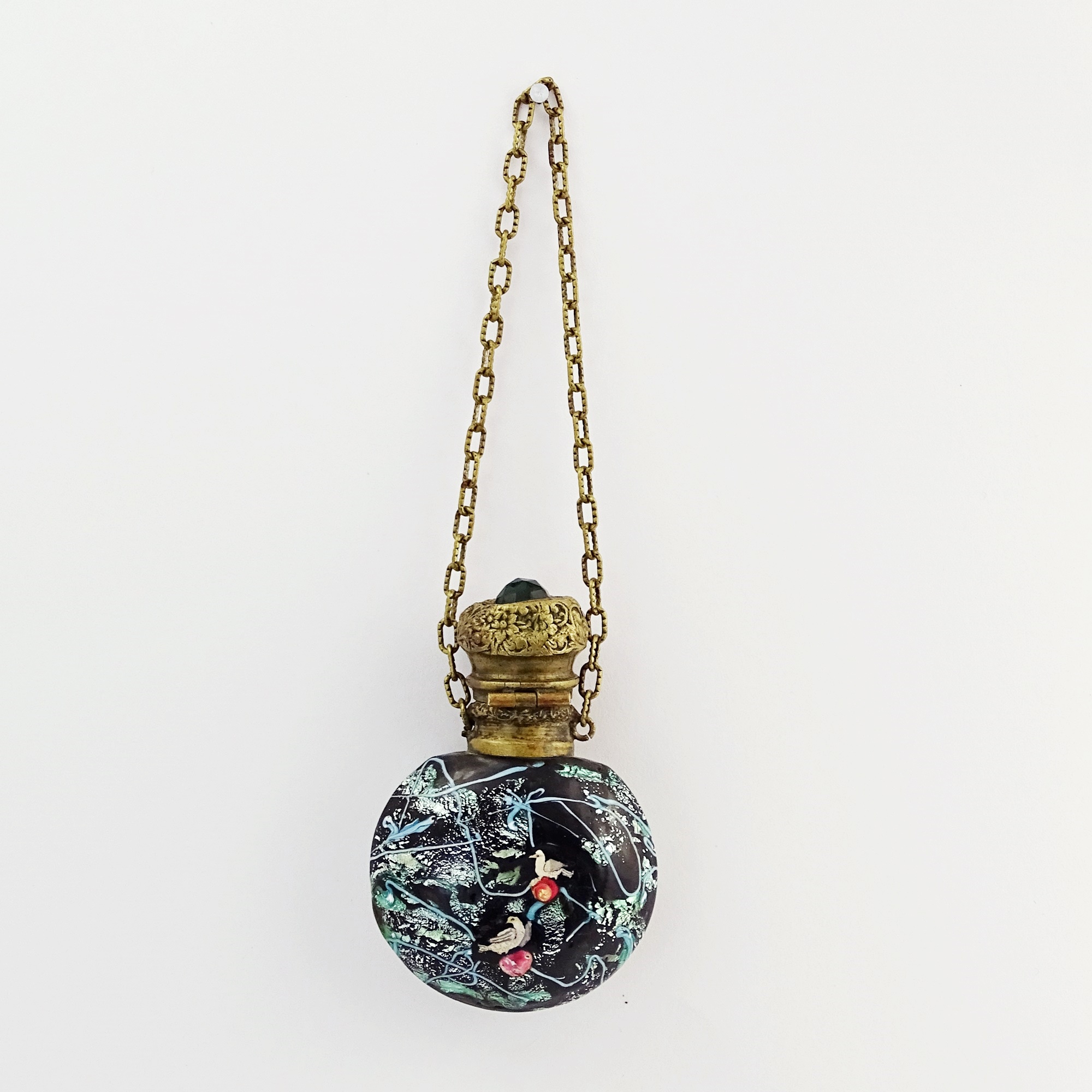 Black glass and silver aventurine scent bottle with canes featuring white birds and pink roses, surrounded by spiraling threads of iridescent aqua. Brass mount and hinged lid with a repousse foliate decoration and a faceted green paste stone set into the top. Suspension chain.