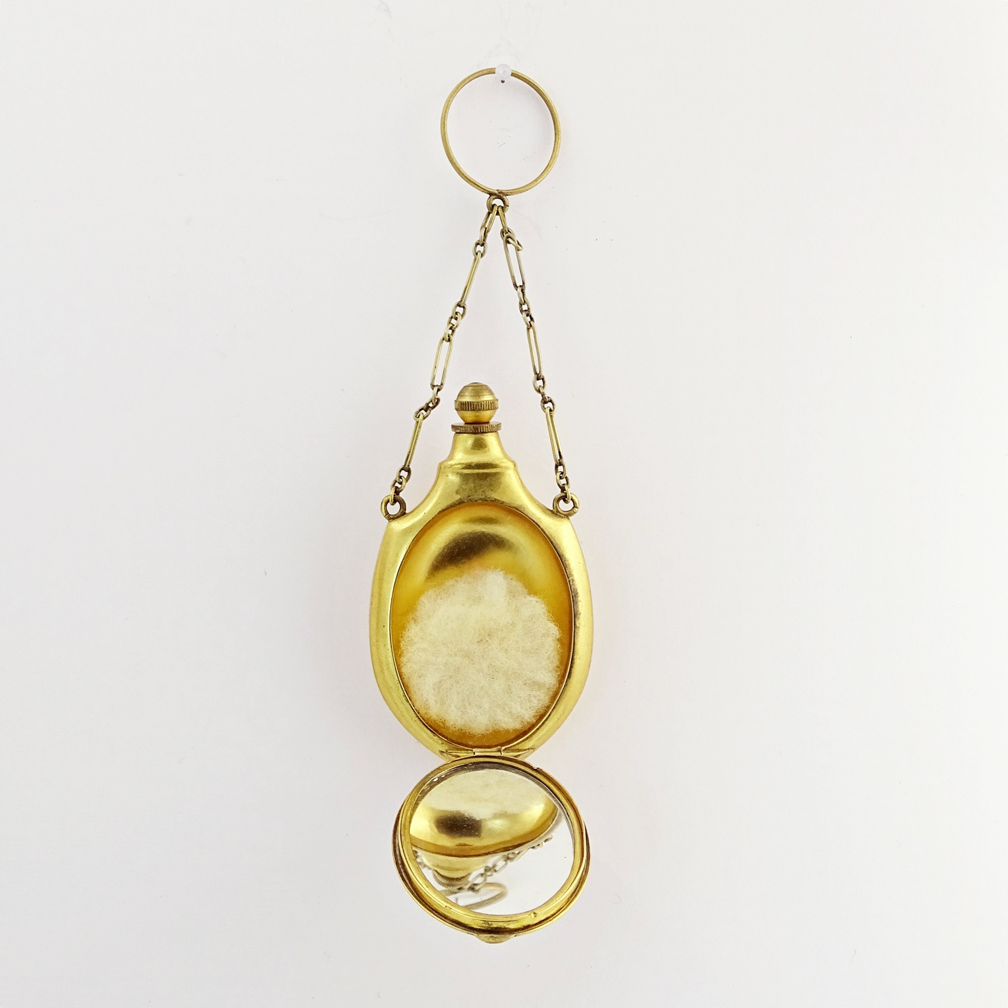 Flat ovoidal chatelaine scent bottle in vermeil with white and blue enamels marking a oval hinged cover on a compartment with powder puff. Tiny screw cap and suspension chain.
