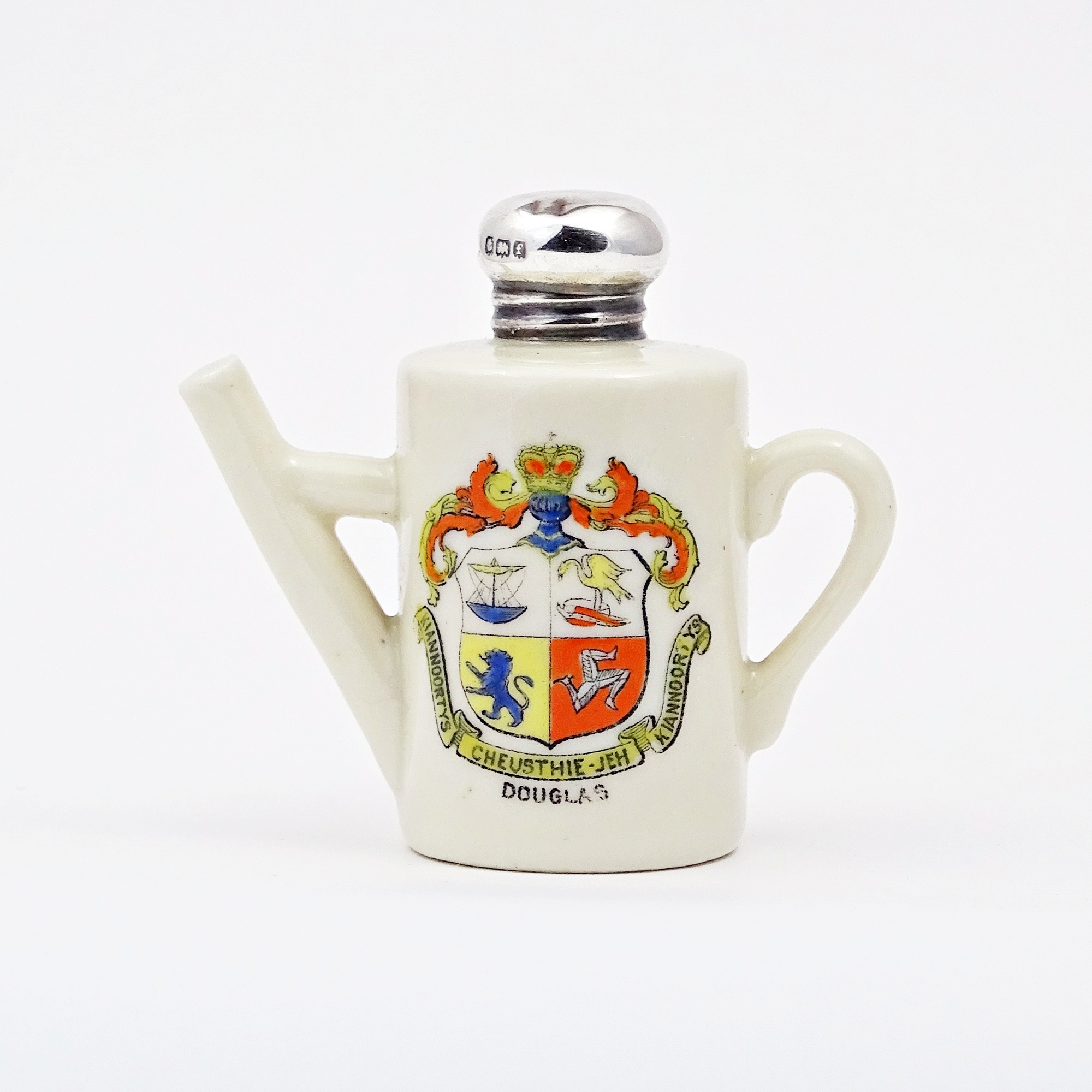 Crested porcelain scent bottle in the form of a watering can of the City of Douglas (Isle of Man) bearing the motto “Kiannoortys Cheusthie-Jeh Kiannoortys”, words in Manx, meaning Government within a Government, from the Latin Imperium in Imperio. Silver screw cap full hallmarked for Birmingham 1905, AB&C for A. Bromet & Co silversmith.