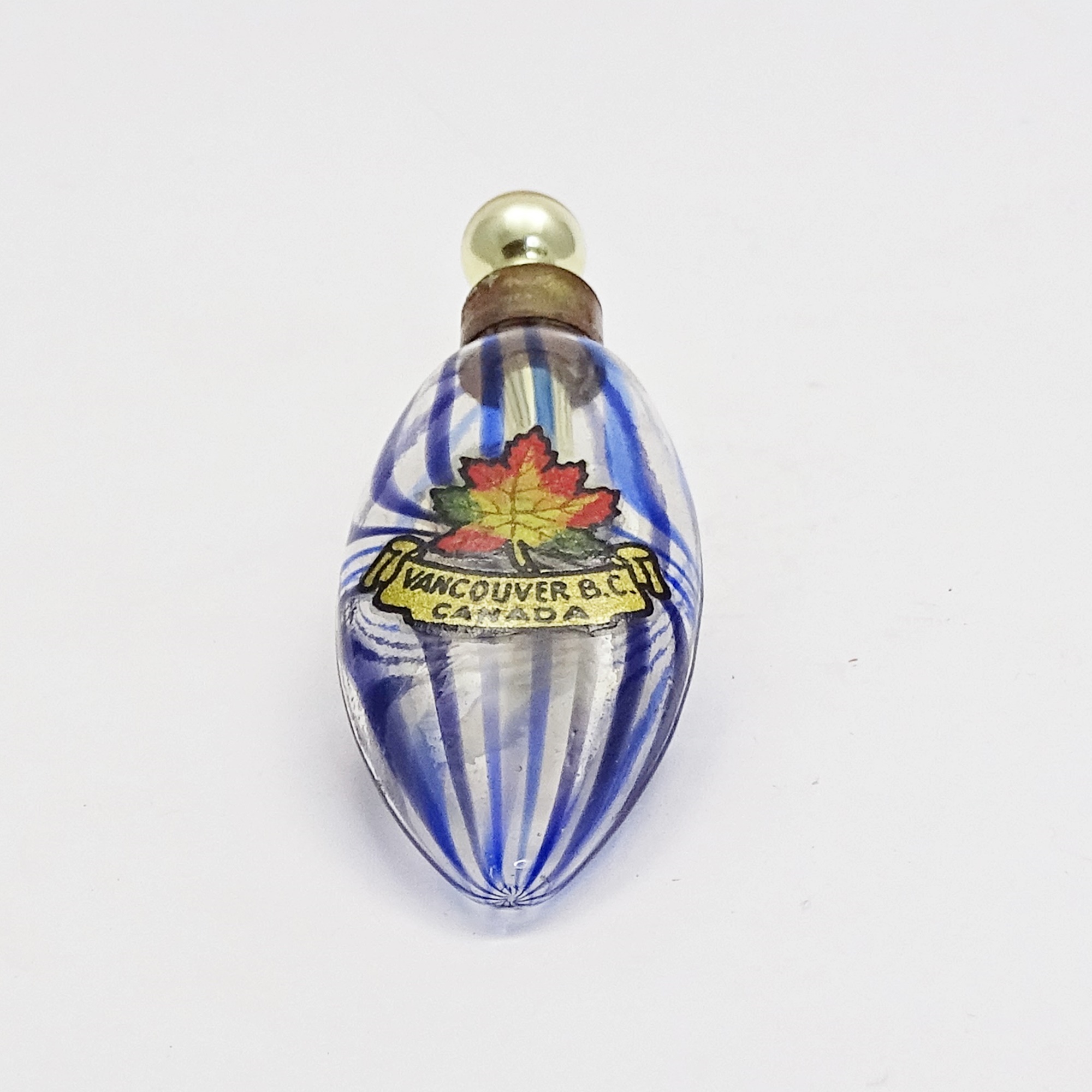 Clear blown glass scent bottle, striped in blue. On the front a paper label says “Vancouver B.C. Canada”. Metal collar and round gold mercury glass cap with wand.