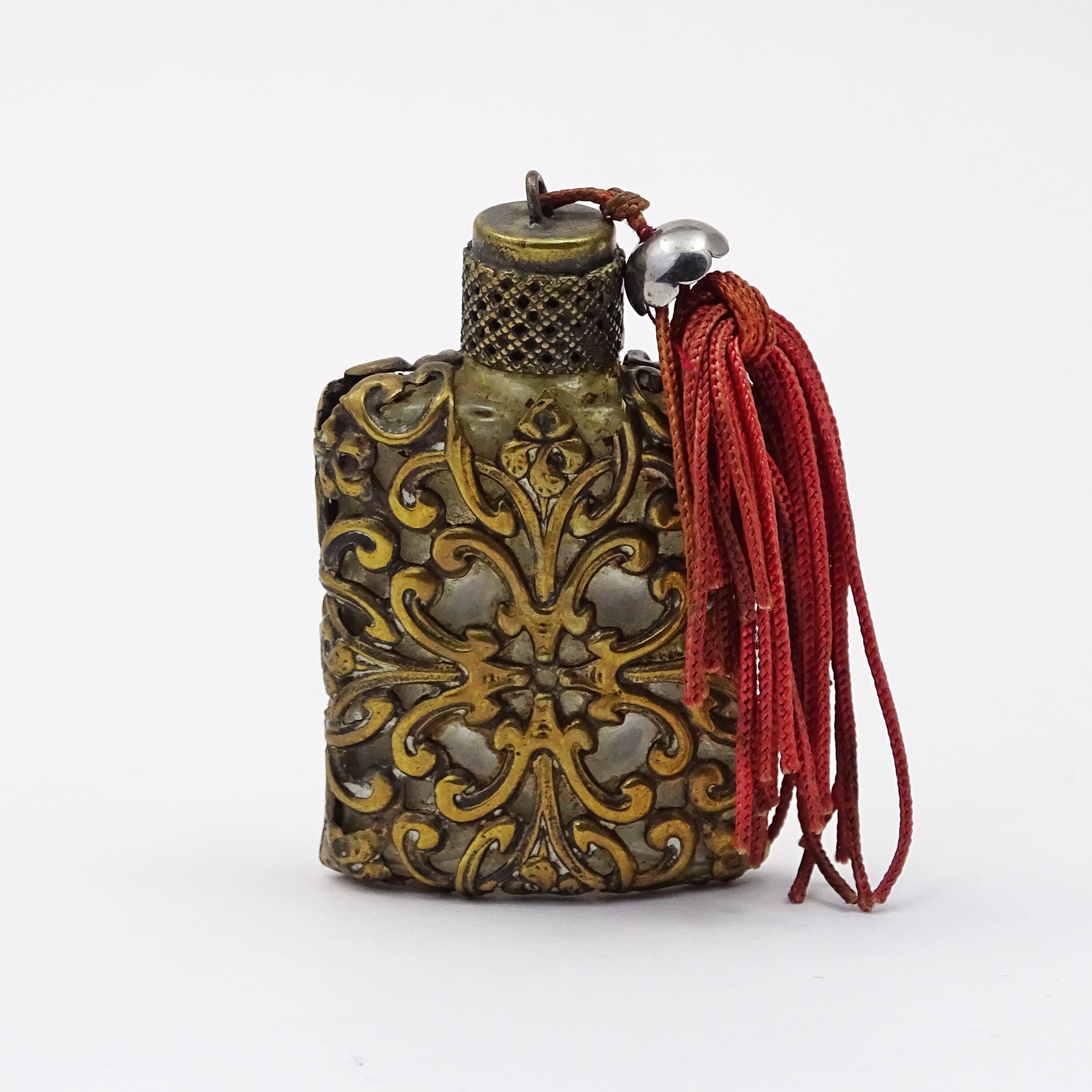 Home » Collection » Clear glass scent bottle enclosed in a intricate pattern metal cage