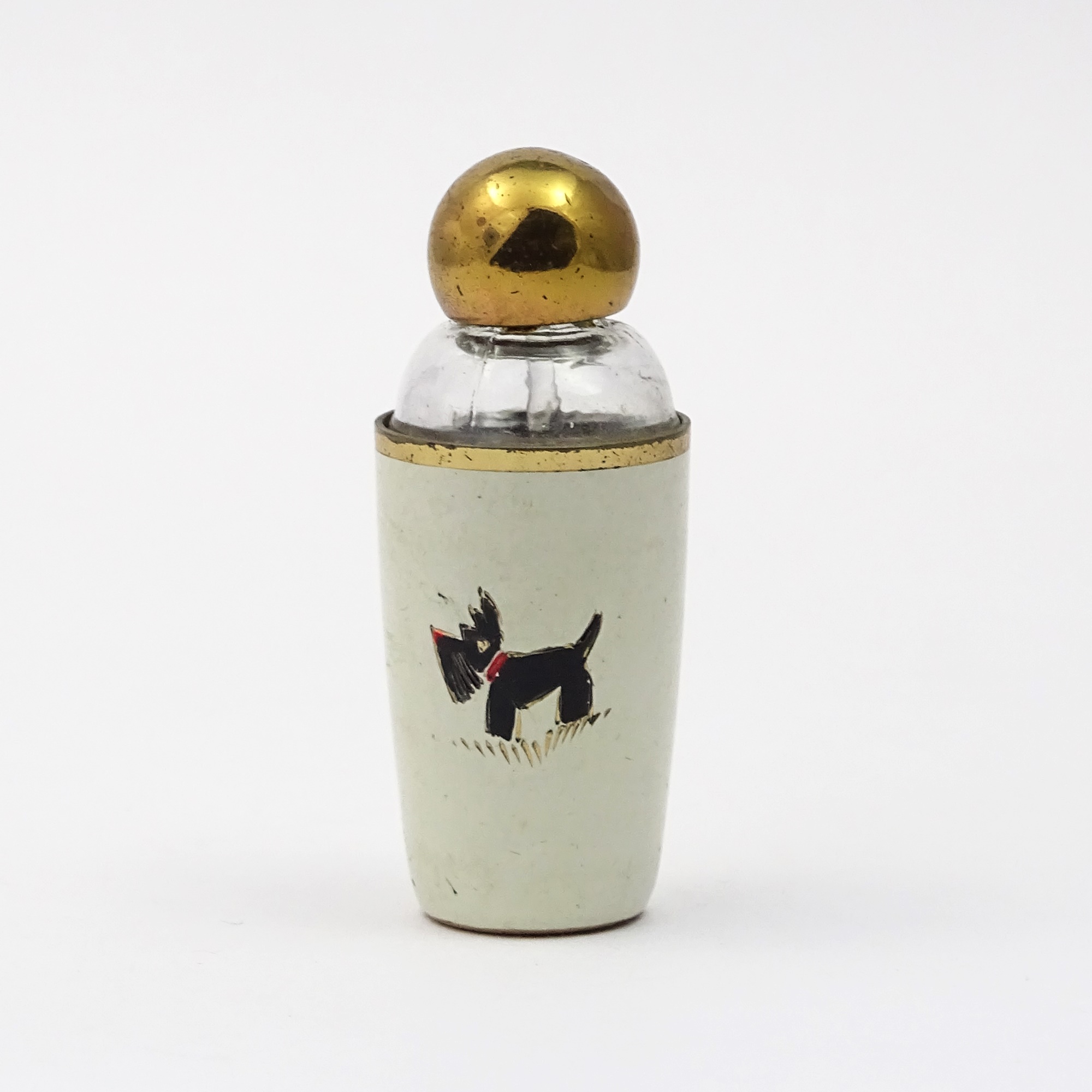 Home » Collection » Clear glass scent bottle in a metal case enamelled in white with a funny black terrier