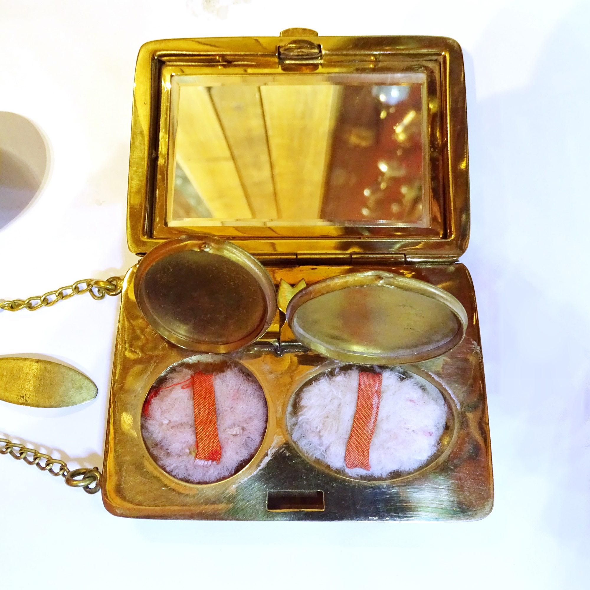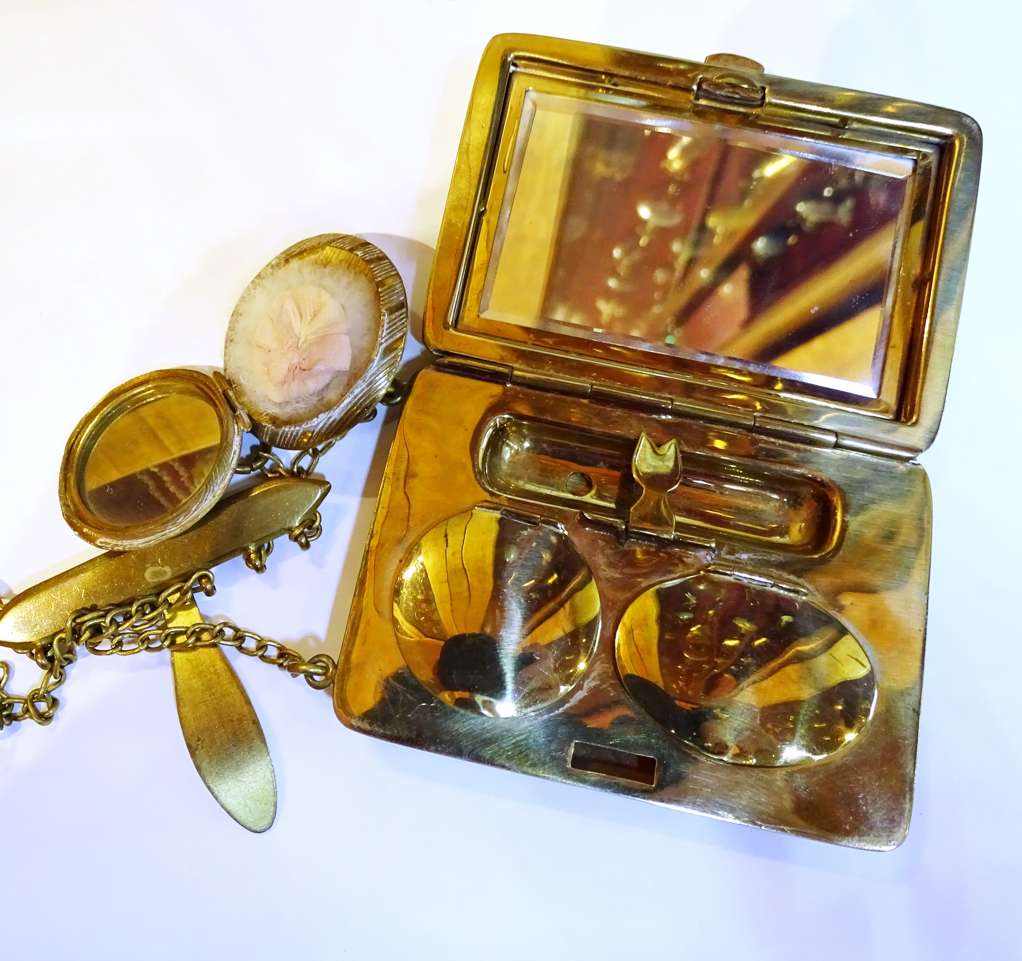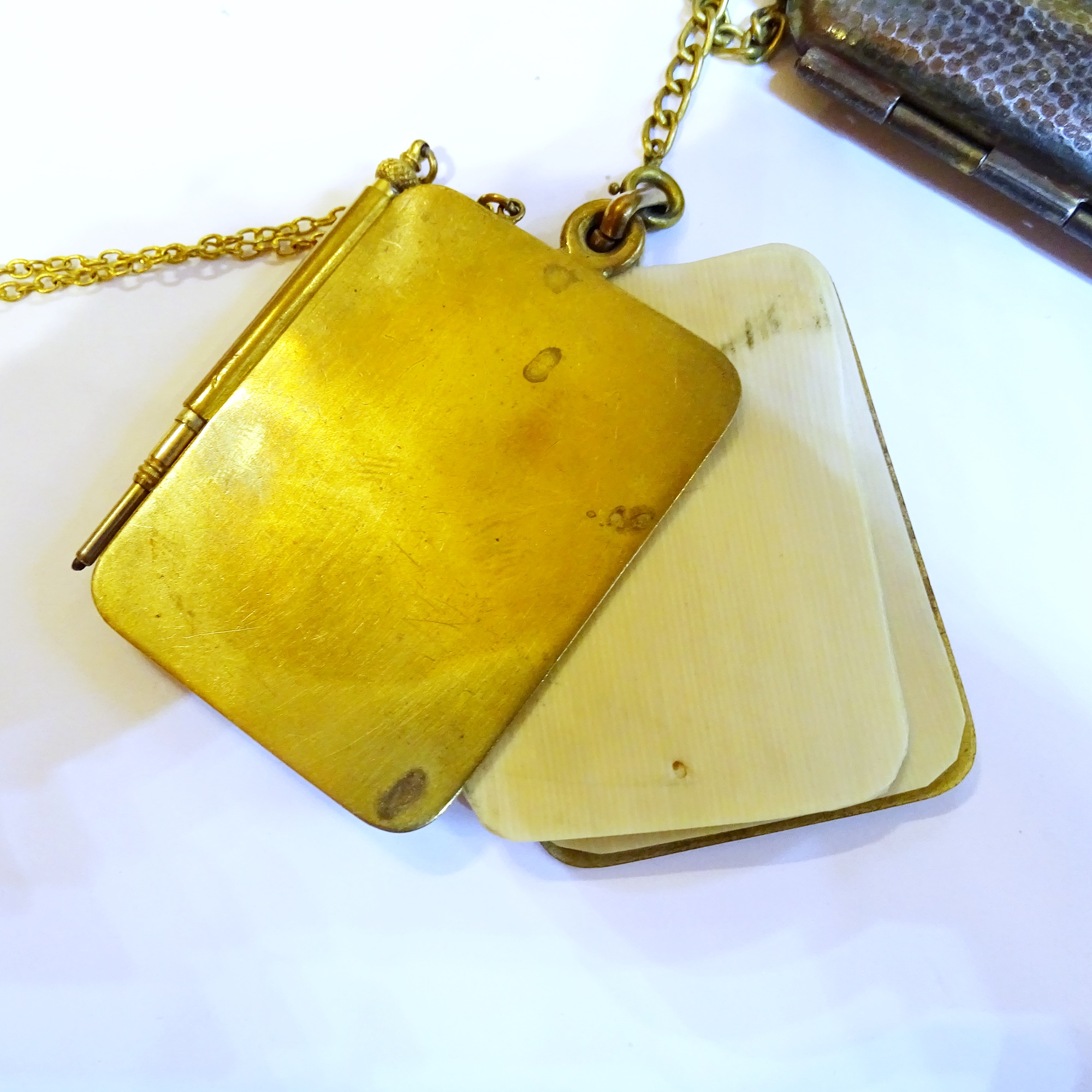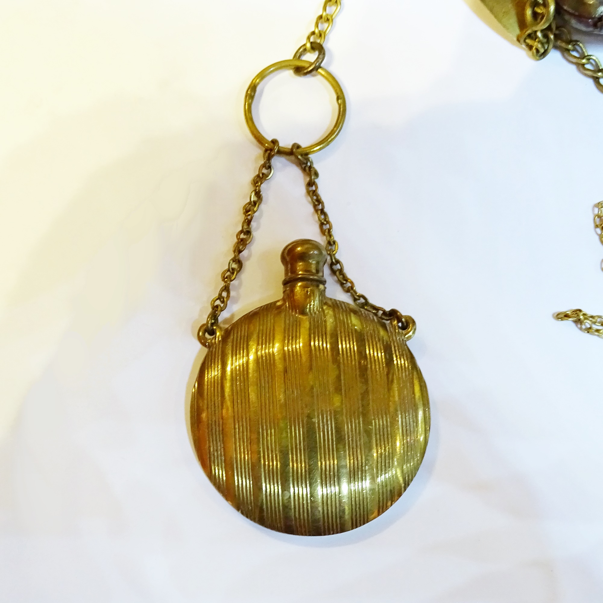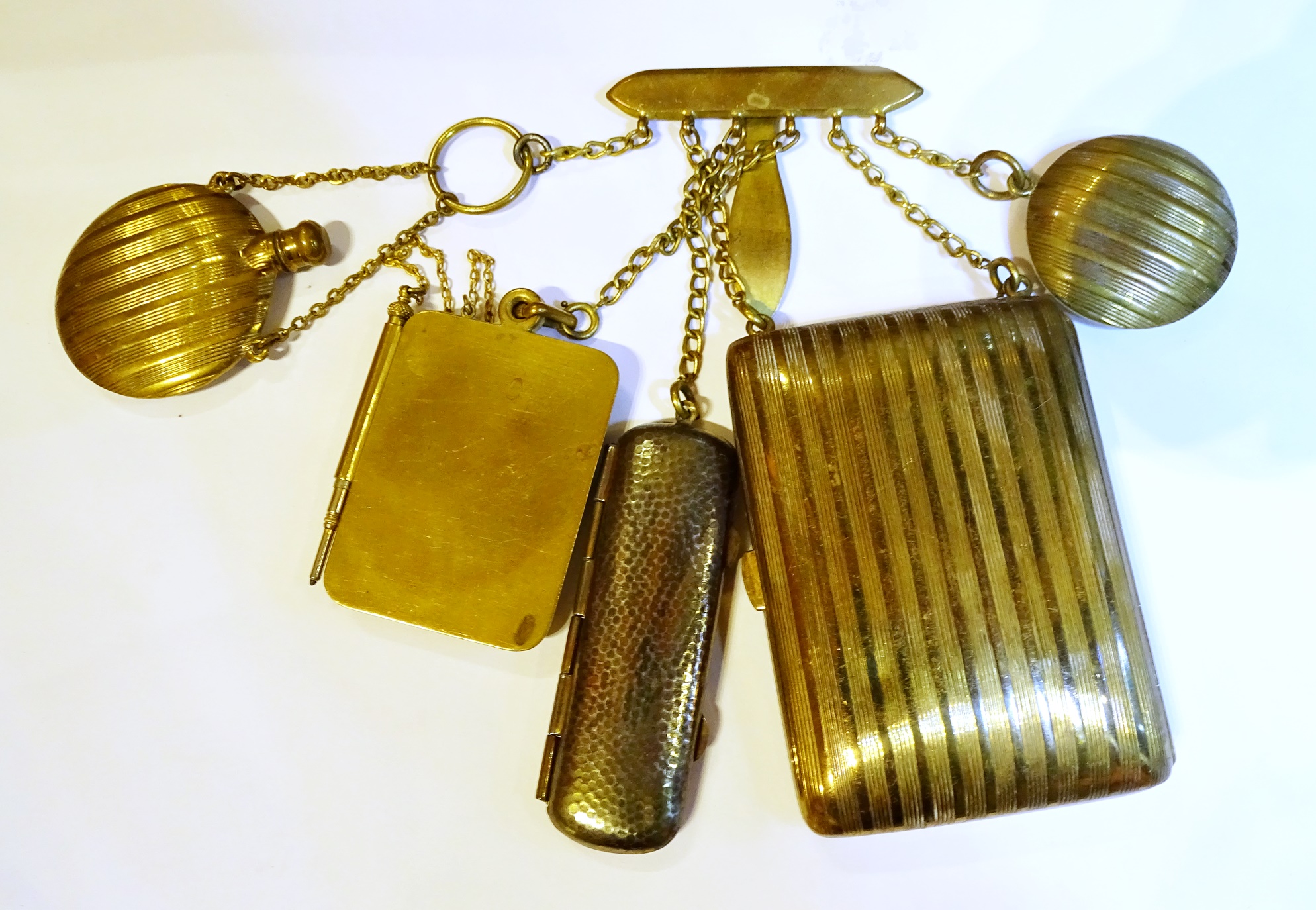 Complete chatelaine with five objects in engine turning brass: a round flat scent bottle with screw cap and a similare powdwer pouf container with mirror; an aid memoire with pencil; a big square maquillage trousse and an other case, perhaps for gnornette.