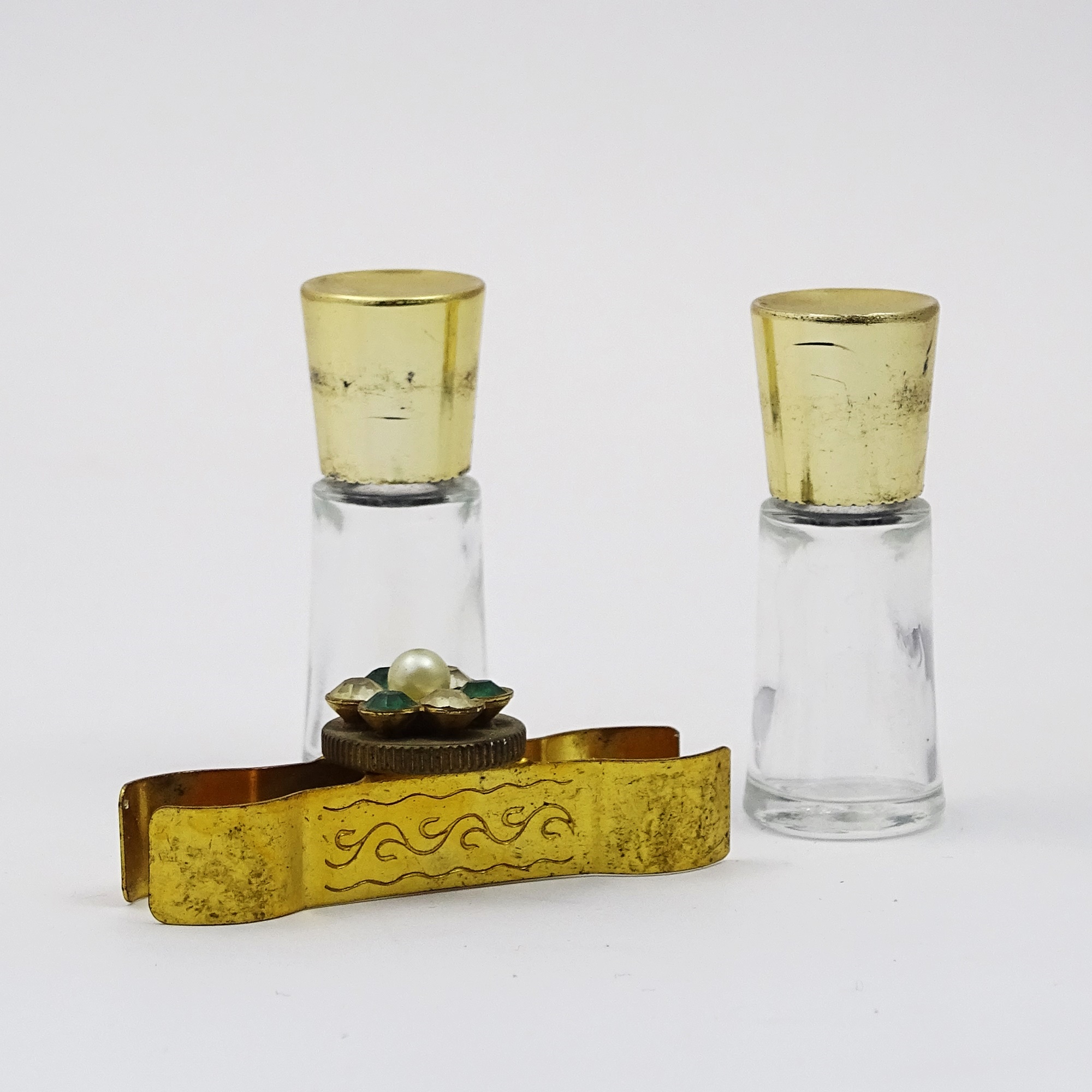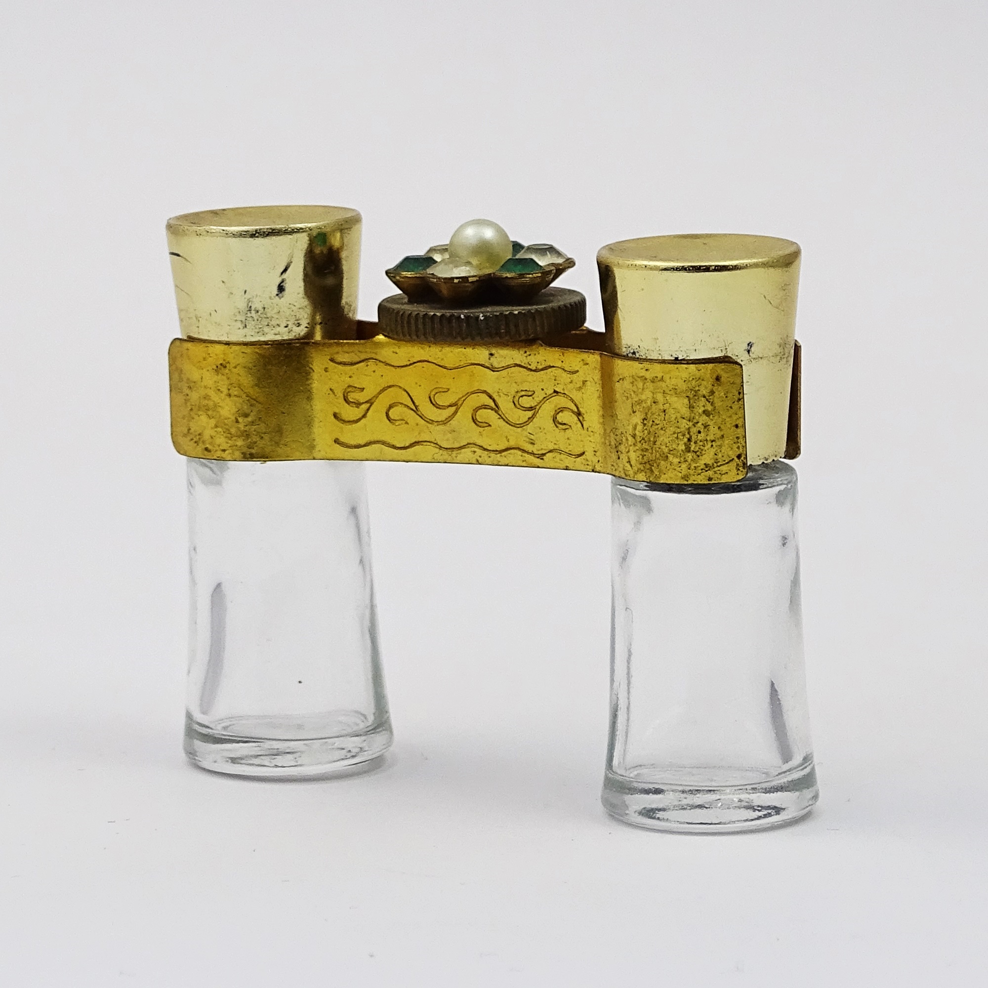 Couple of clear glass scent bottles forming an opera glasses. The two bottles are joined by a gilded metal band and the focus wheel is a “flower” with a central pearl and a corolla of white and green rhinestones. Gilded metal caps.