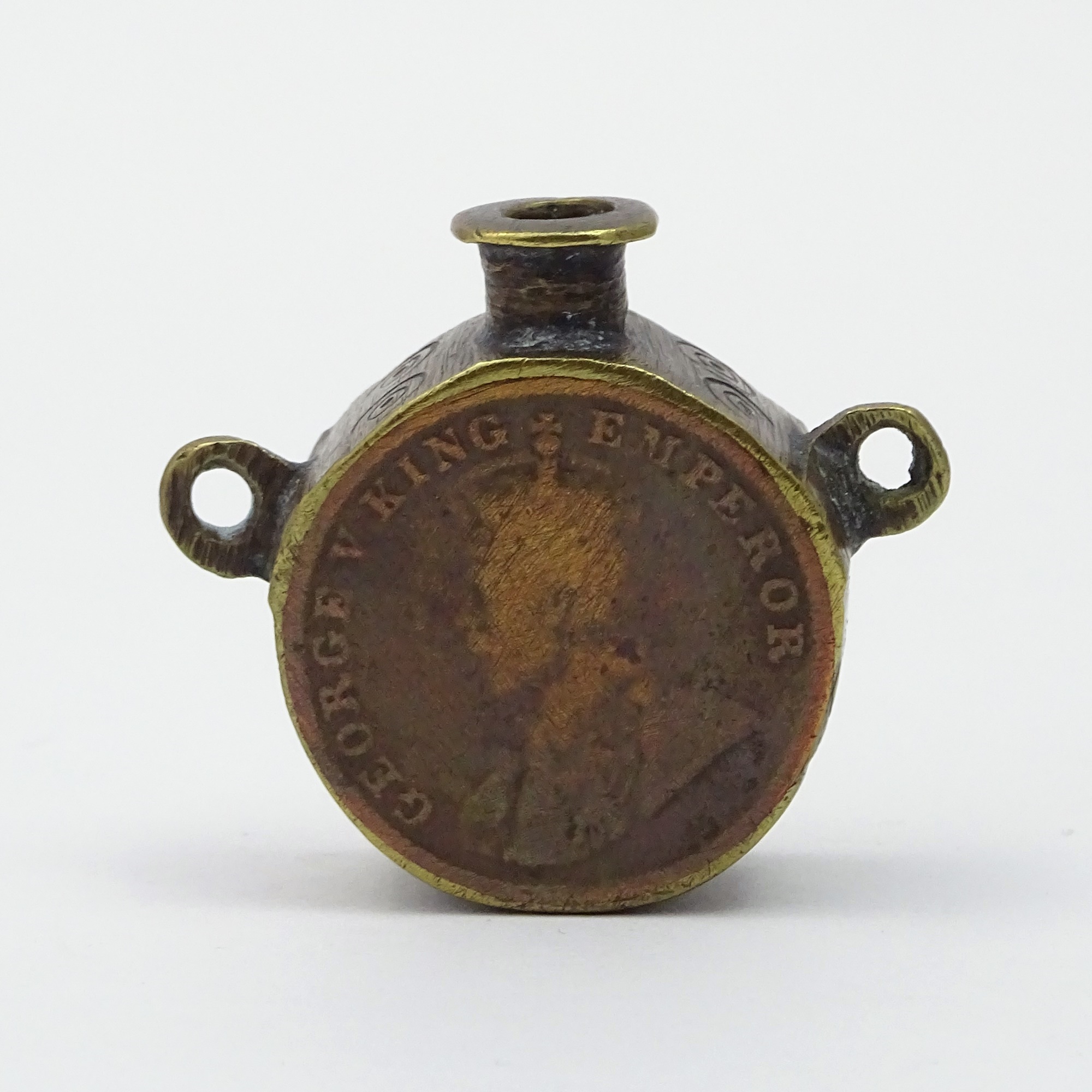 Craft scent bottle made with two coins showing George V King and Emperor, coming from Kabul.