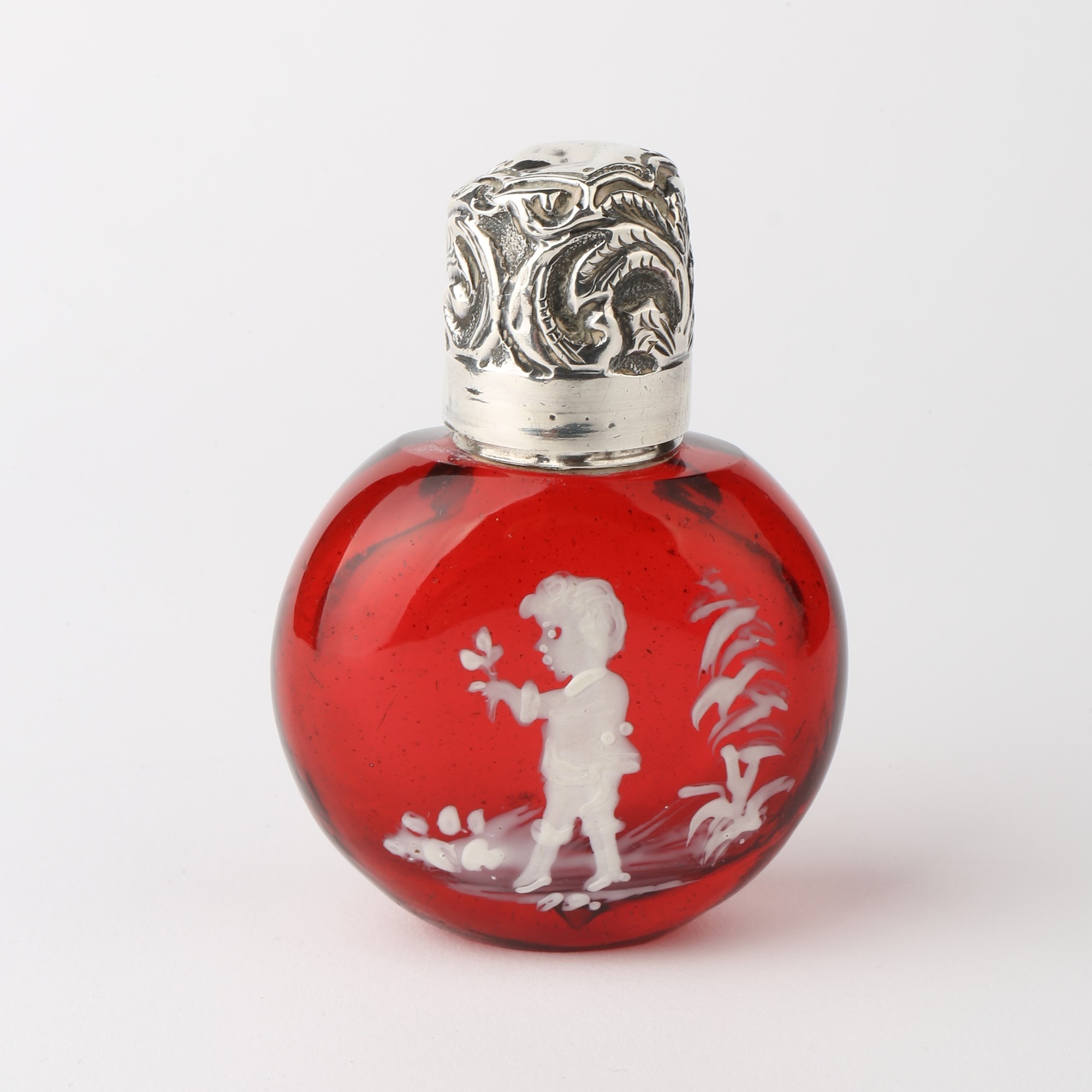Cranberry glass scent bottle in “Mary Gregory” style (Bohemian production) showing a boy holding a flower in white enamel. Silver mount and embossed screw top full hallmarked for Birmingham, 1897, Sydenham Brothers, silversmiths.