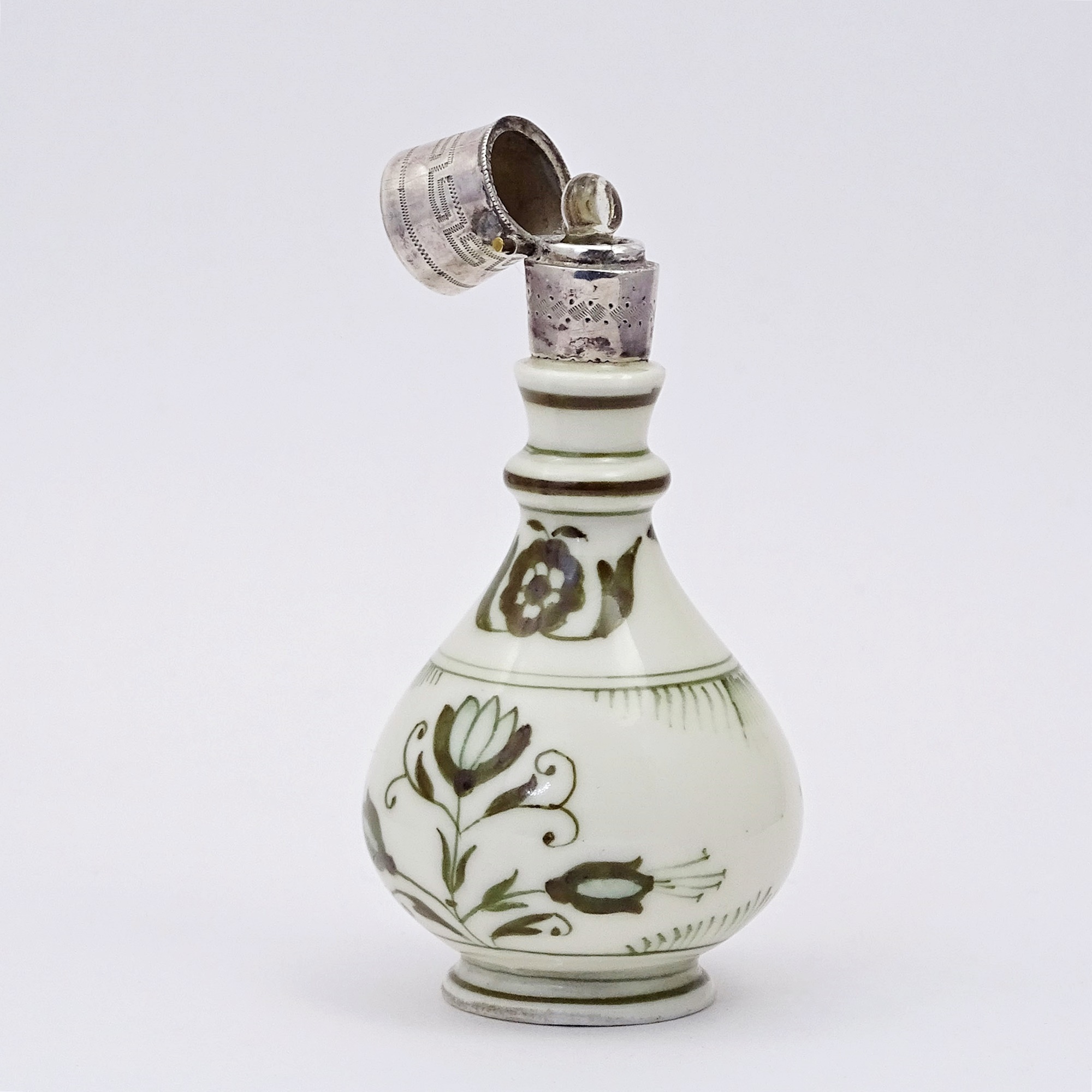 Cream porcelain scent bottle with the so called “Meissen onion pattern” decor in green, probably a Delft imitation; silver mount and hinged cap with Dutch marks.