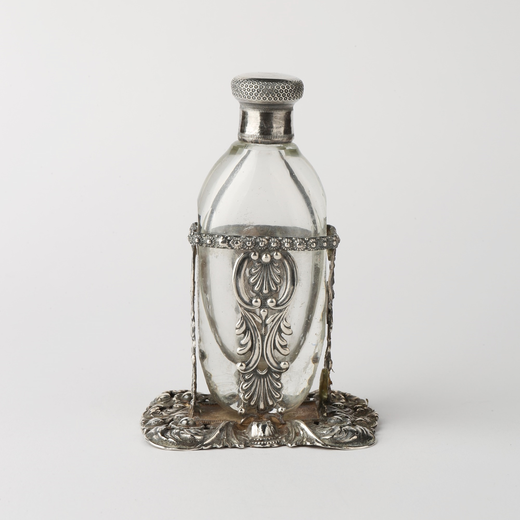 Thick cut crystal bottle supported by a stand with a base and pedestal in embossed silver. Screw cap, unmarked.