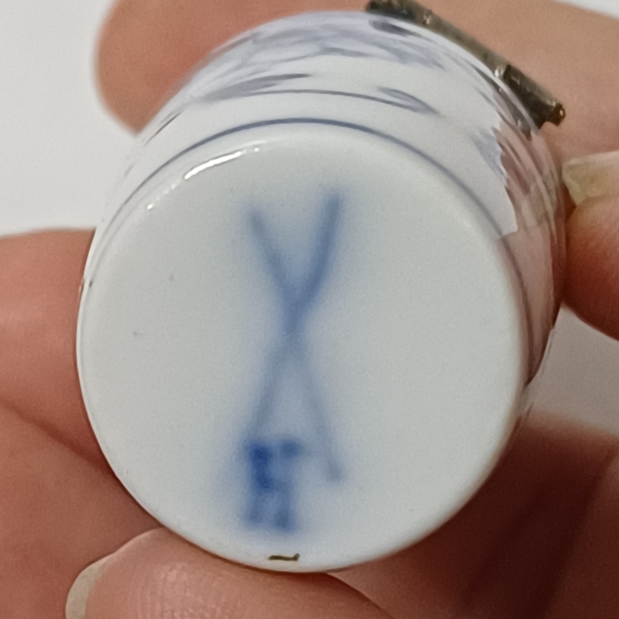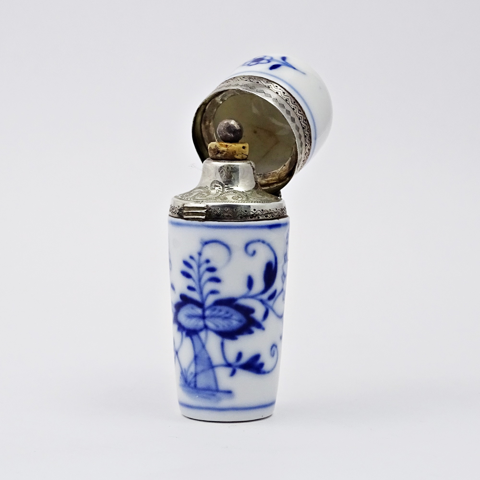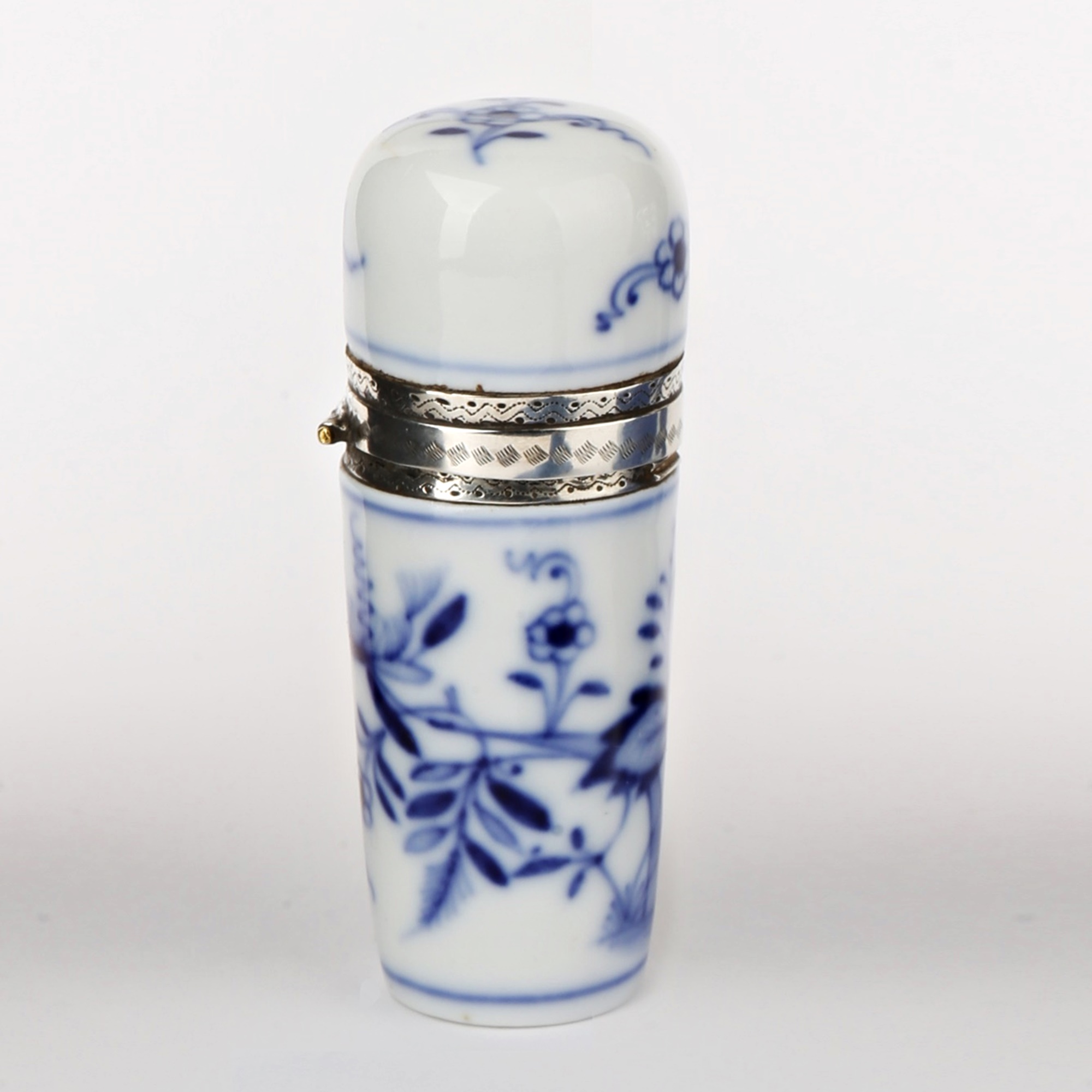 Cylindrical blue and white porcelain scent bottle showing the so called onion pattern. Silver mount and closure. The inner stopper is a cork with a silver pellet. On the bottom blue cross with letter H, for Meissen .
