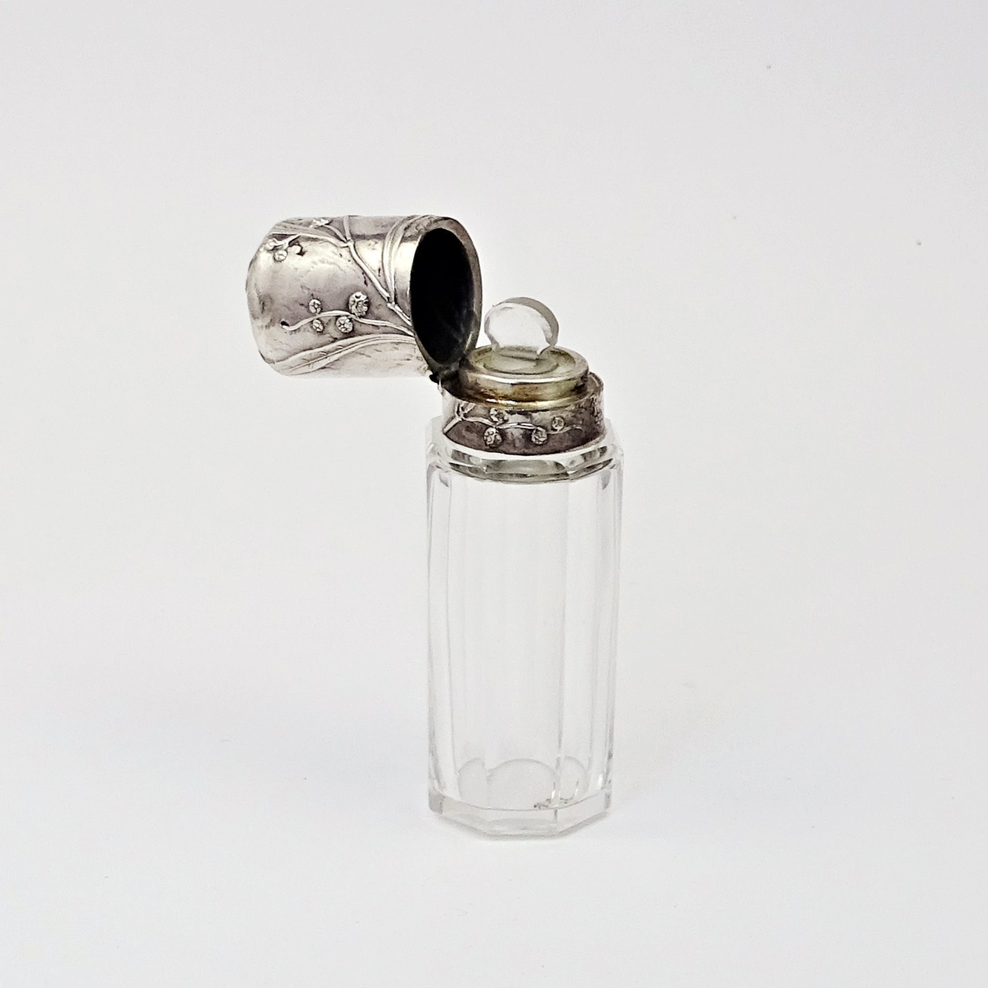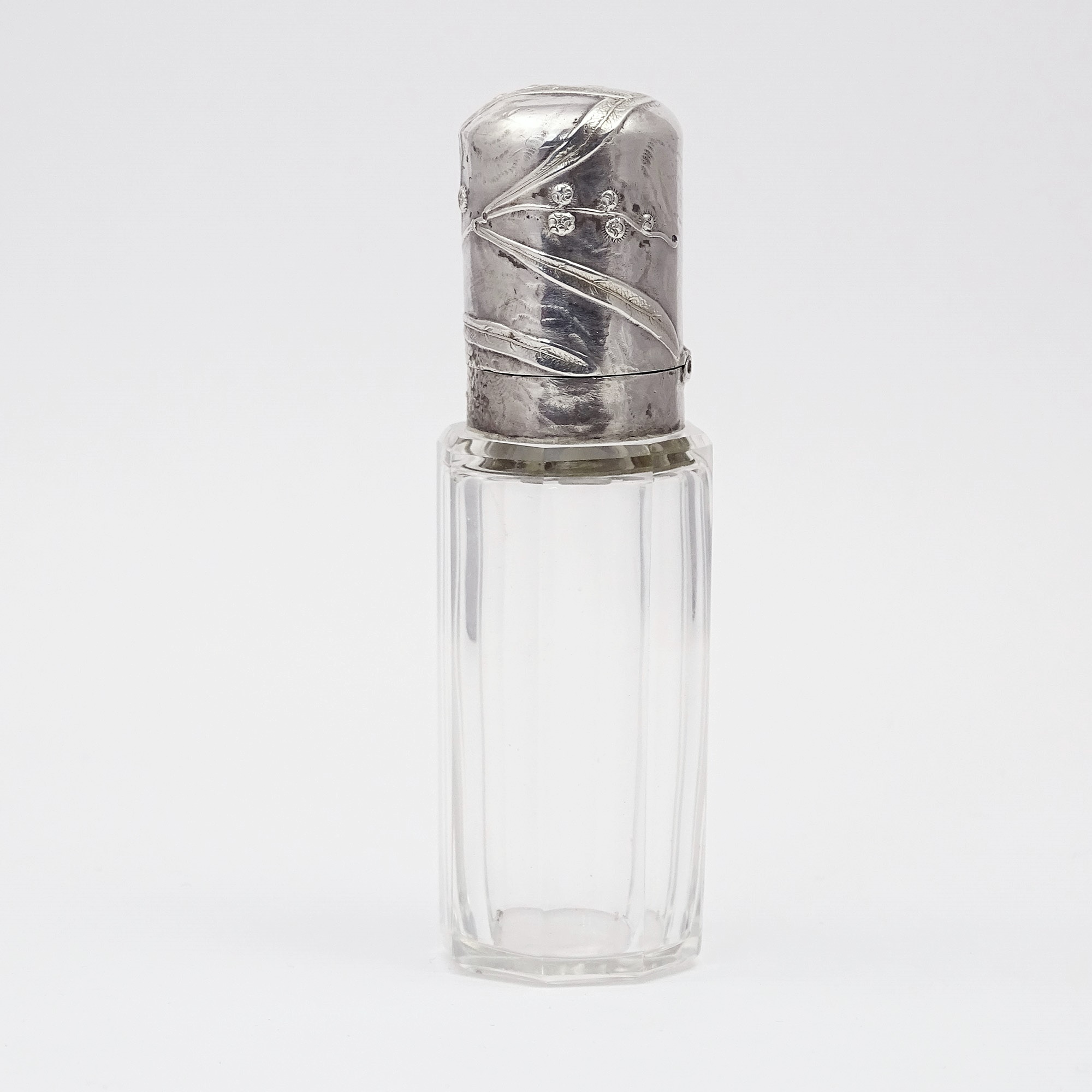Home » Collection » Cylindrical cut crystal scent bottle with silver hinged cap with light floreal decor