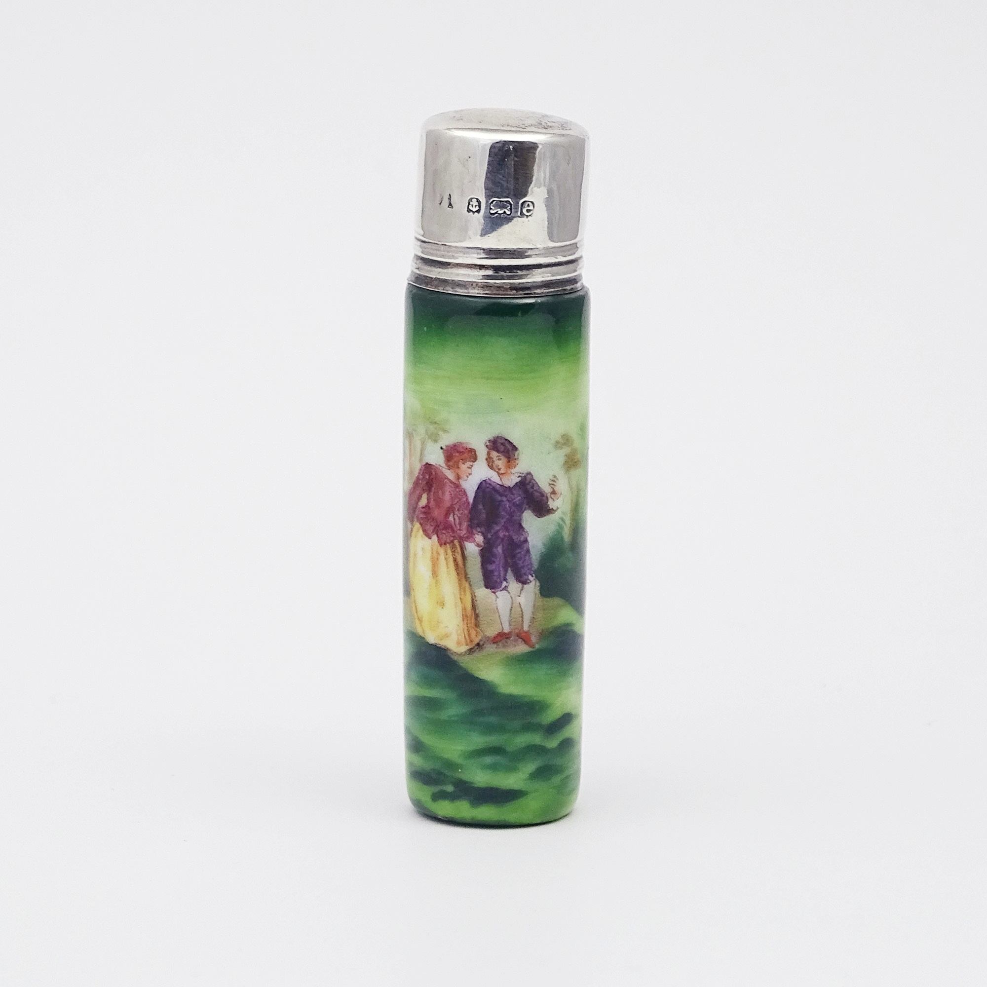 Cylindrical porcelain scent bottle painted with a gallant scene in a verdant landscape. Screw silver cap marked for Birmingham, 1904, illegible silversmith.