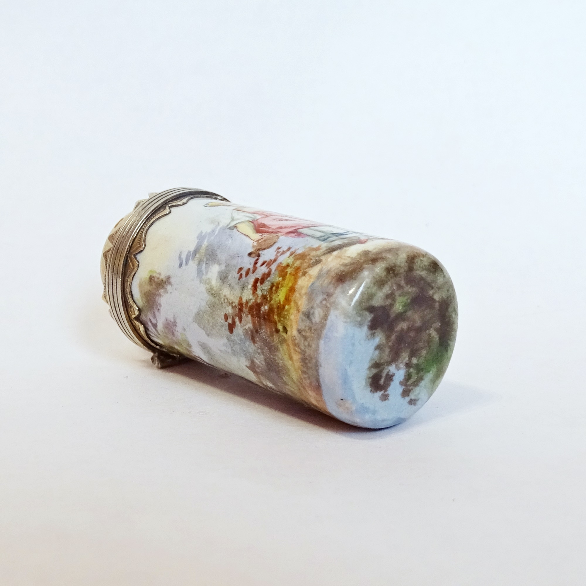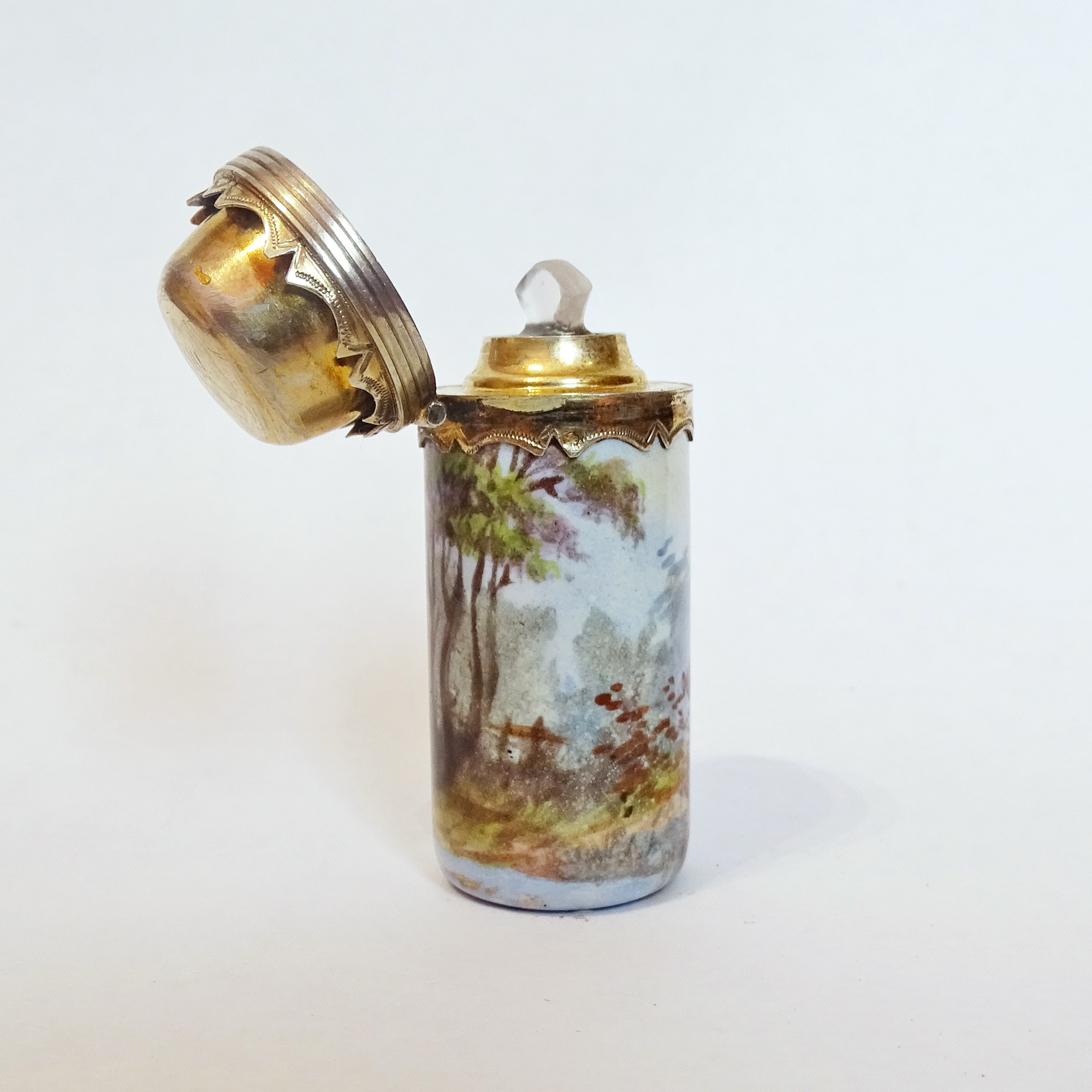 Cylindrical scent bottle in enamelled silver, painted with the image of a young shepherdess in a pastoral scene all around. Mount and hinged dome cap in vermeil, stamped with French hallmarks. Inner glass stopper.