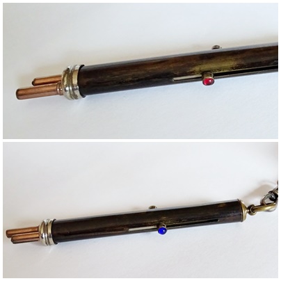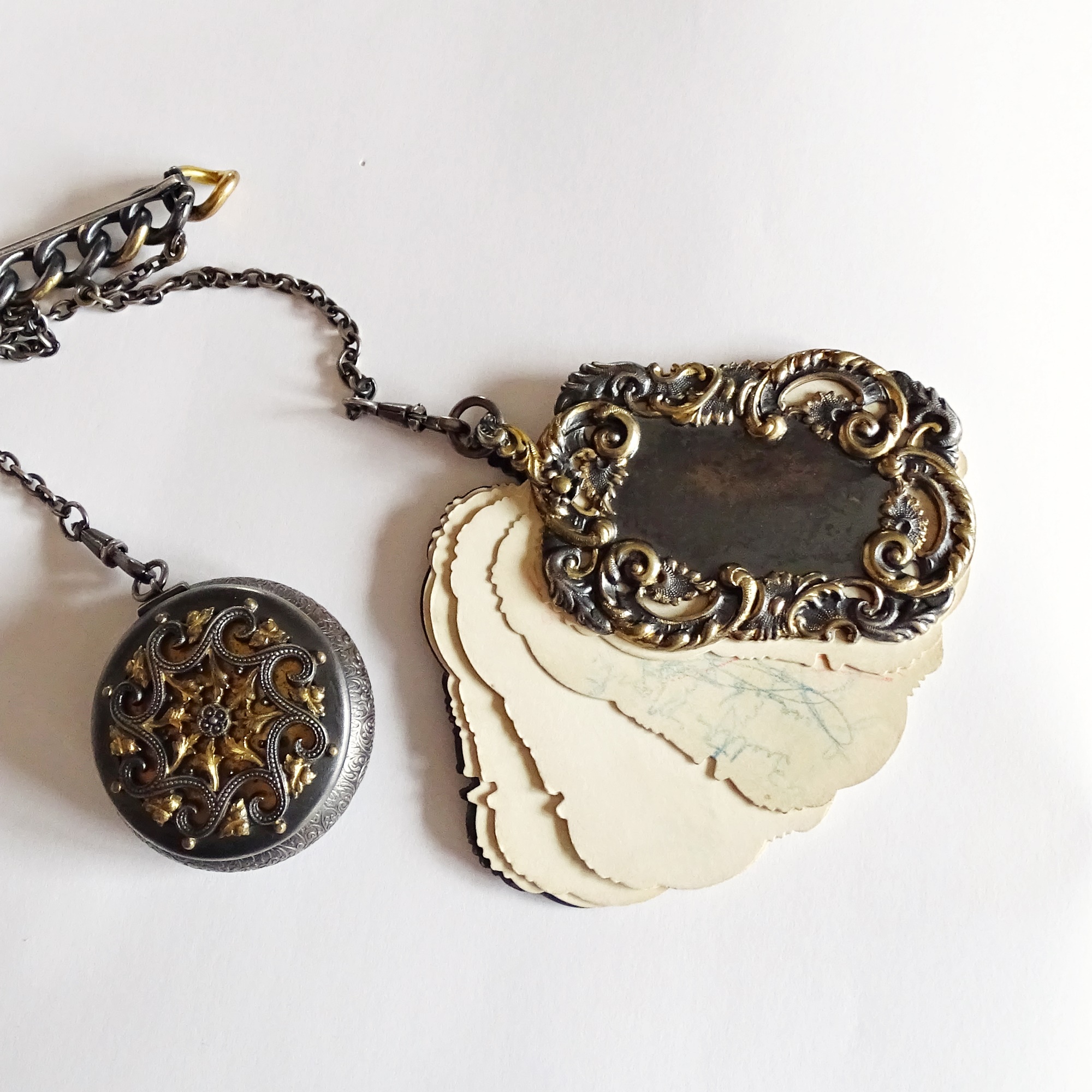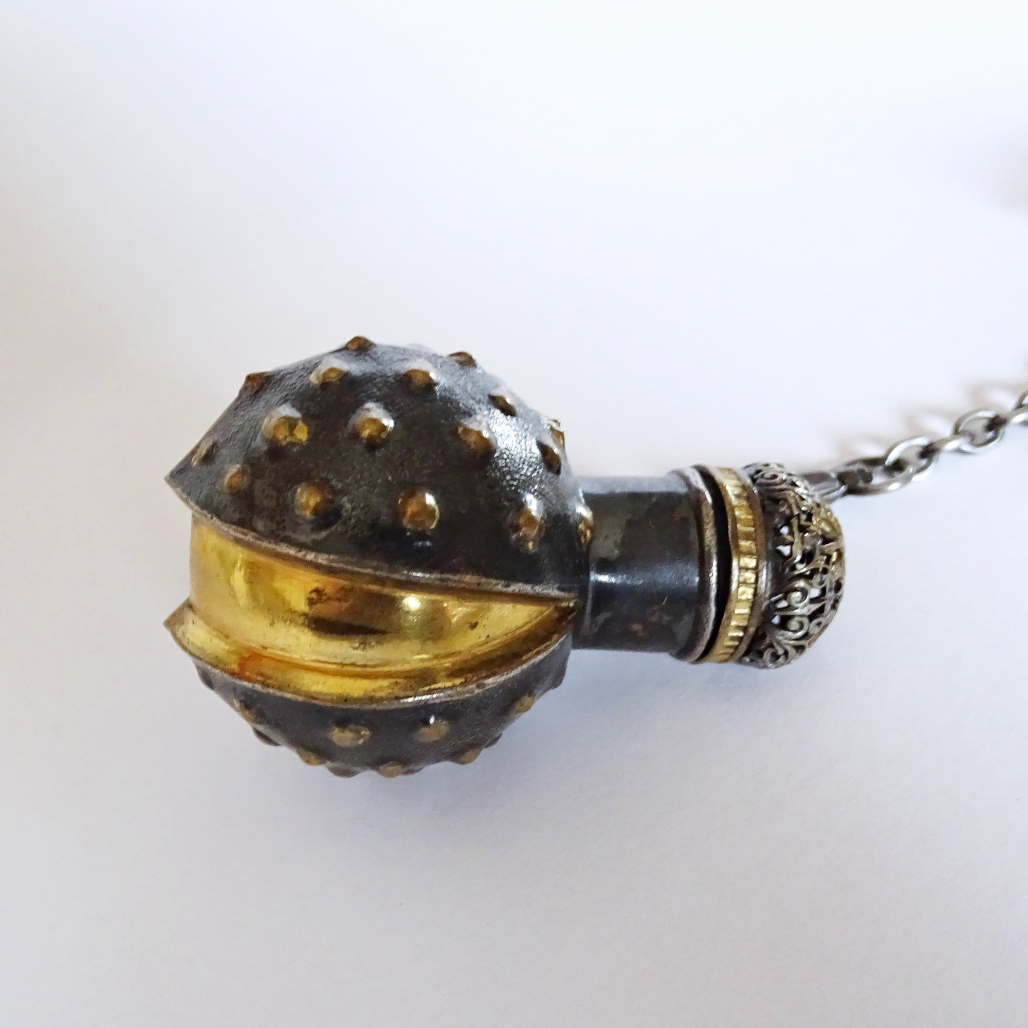Dance chatelaine on a stick brooch with alternate rings in gold and burnished silver, probably a mourning jewels. The alternance of the two colour characterized all the four attached items in different ways: a metal scent bottle, shaped as an open chestnut with a hinged perforated cap, an aide-memoire with ornate cover, a retractile pencil and a little round box for pills or make up.