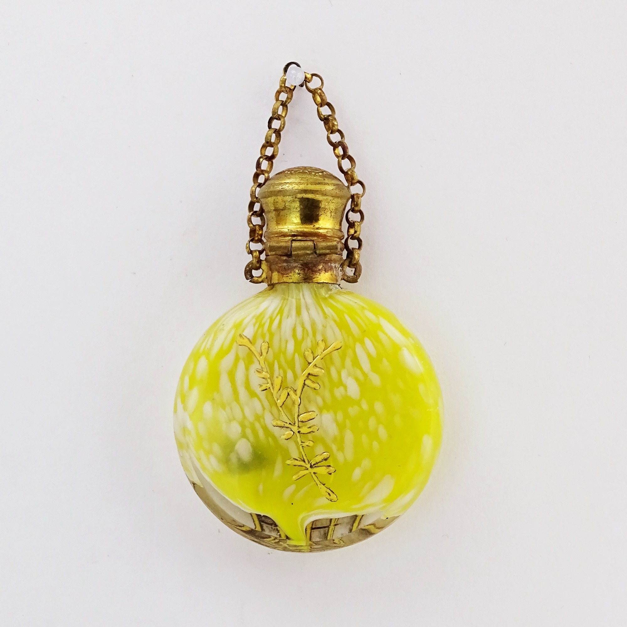 Double glass scent bottle in clear and yellow with gold decor of flowers on the front and of a little branch on the back; hinged brass cap.
