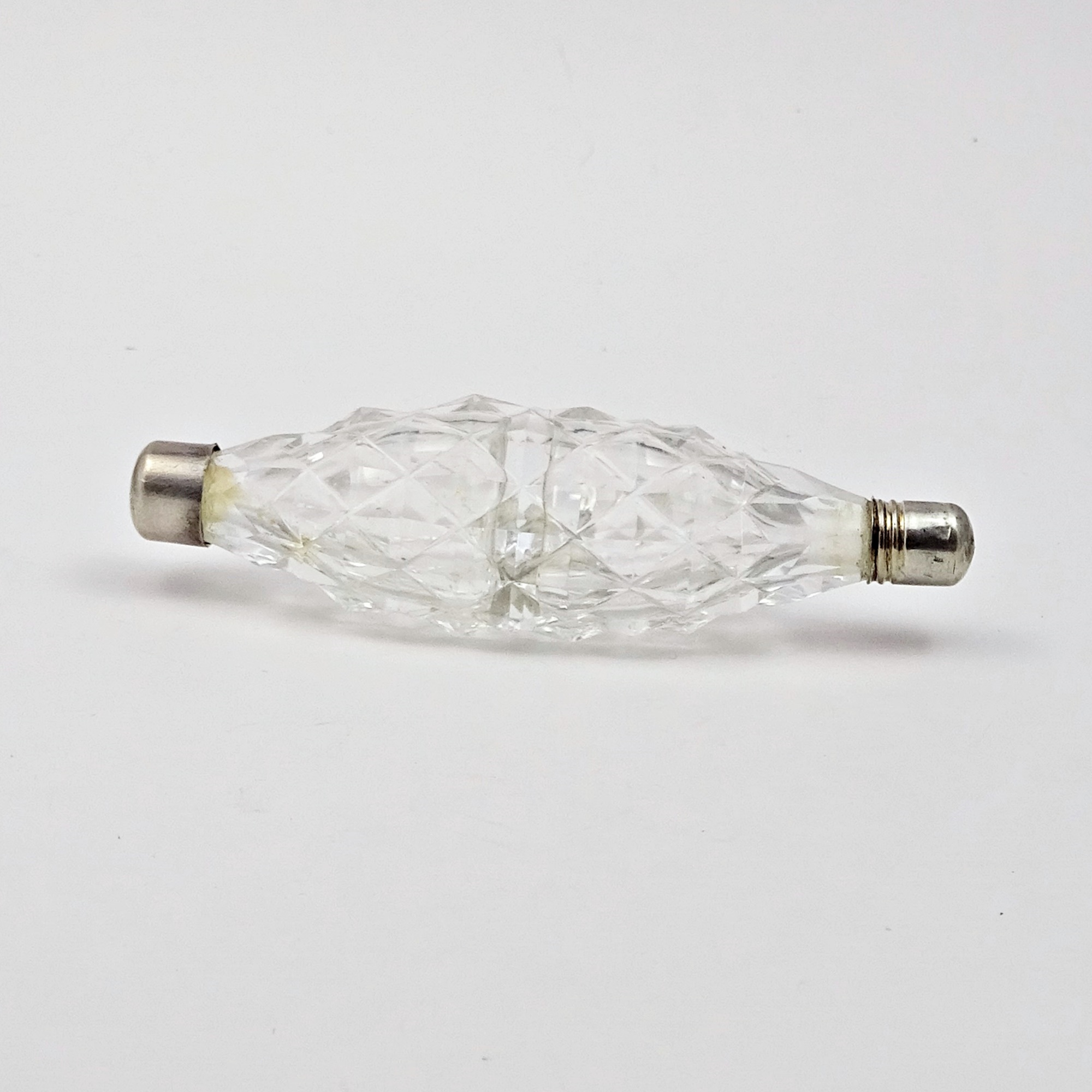 Double scent bottle in diamond faceted clear glass.