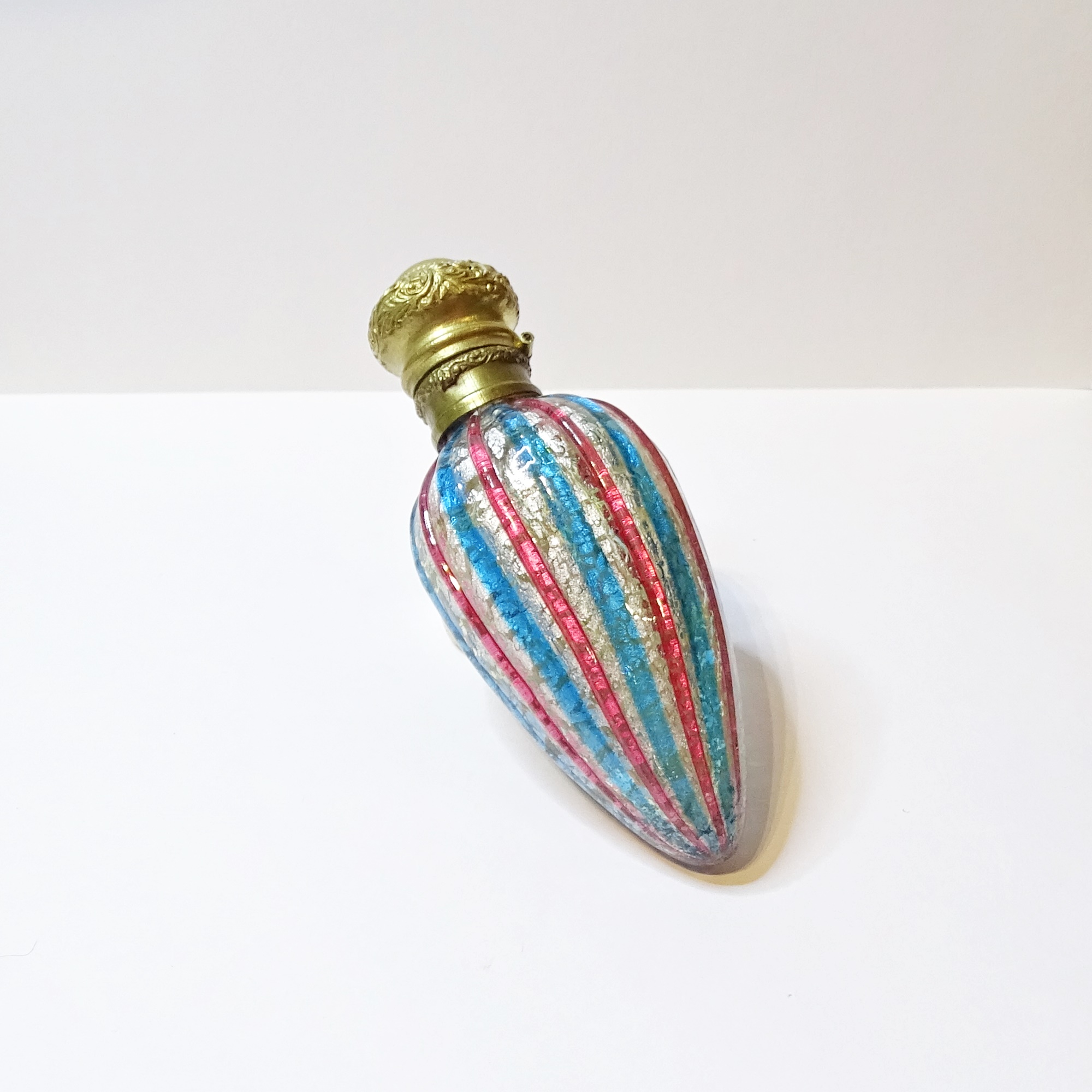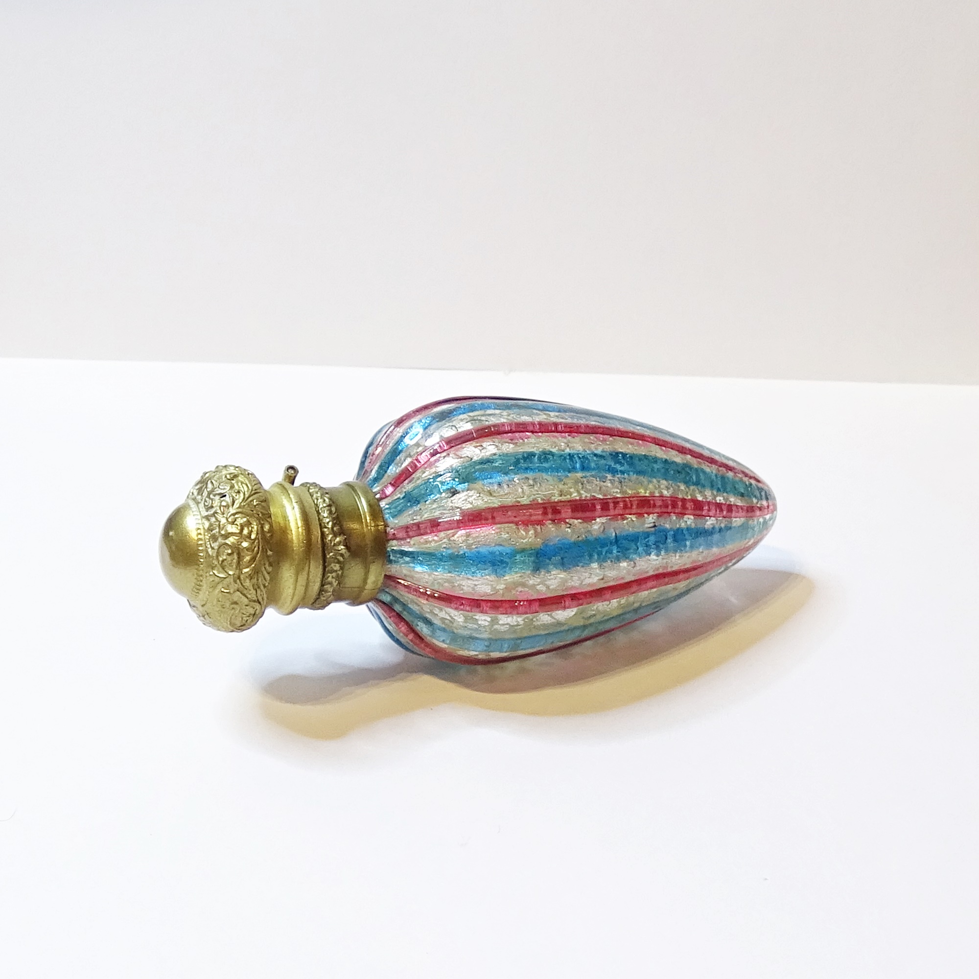 Home » Collection » Drop-shaped scent bottle in Murano glass with red and blue ribs and silver leaf