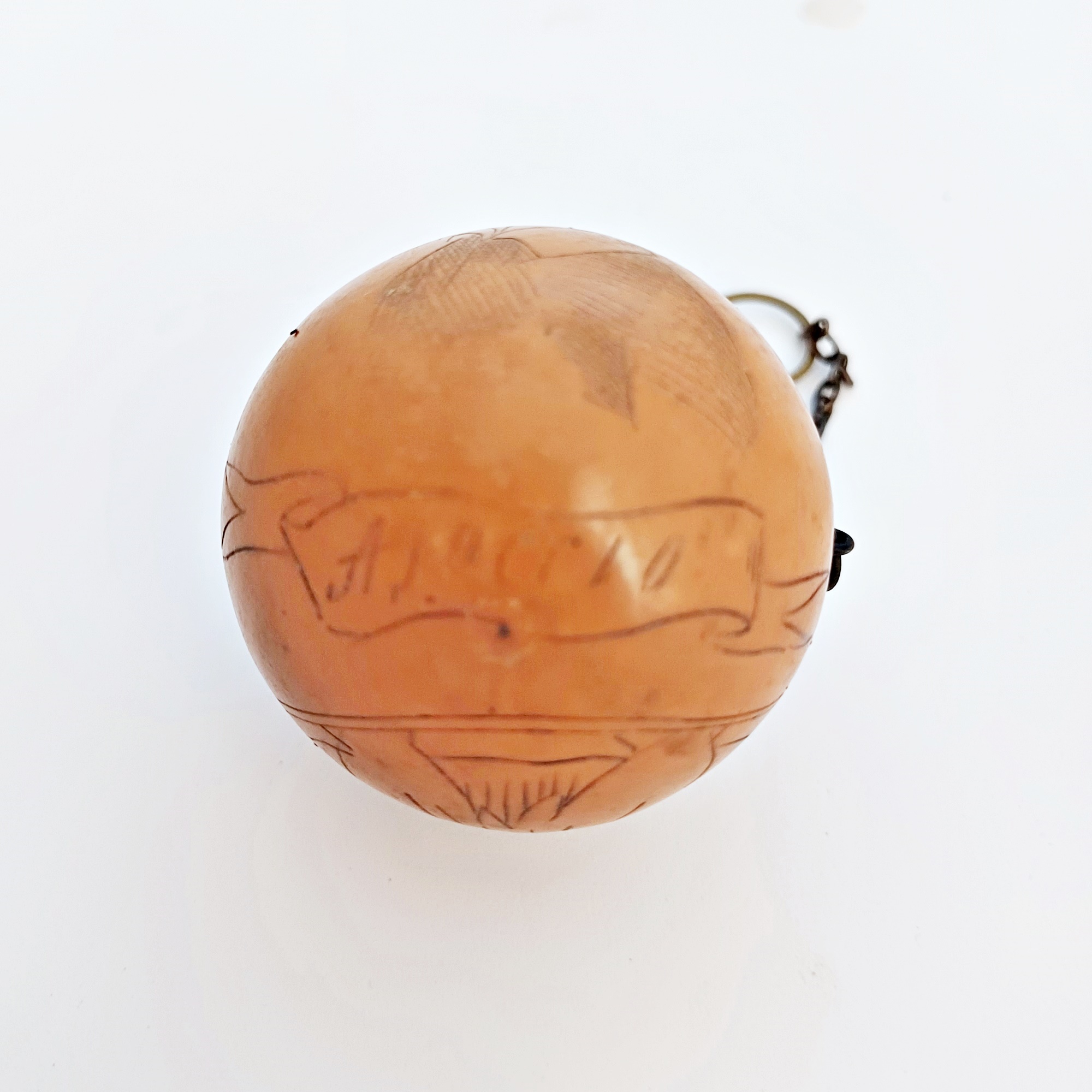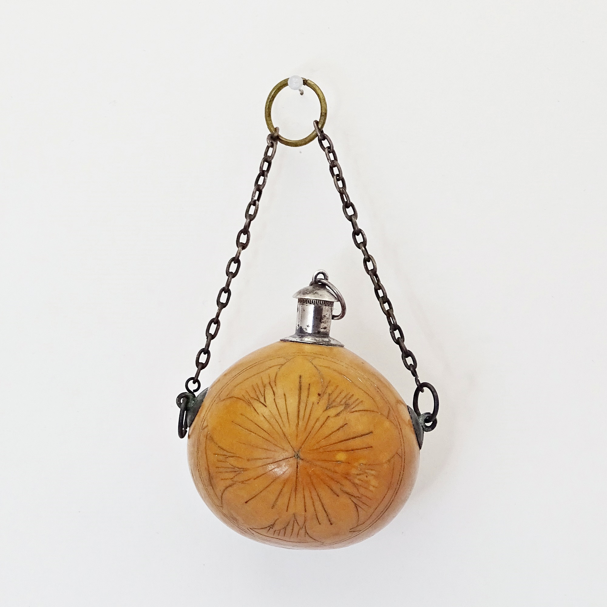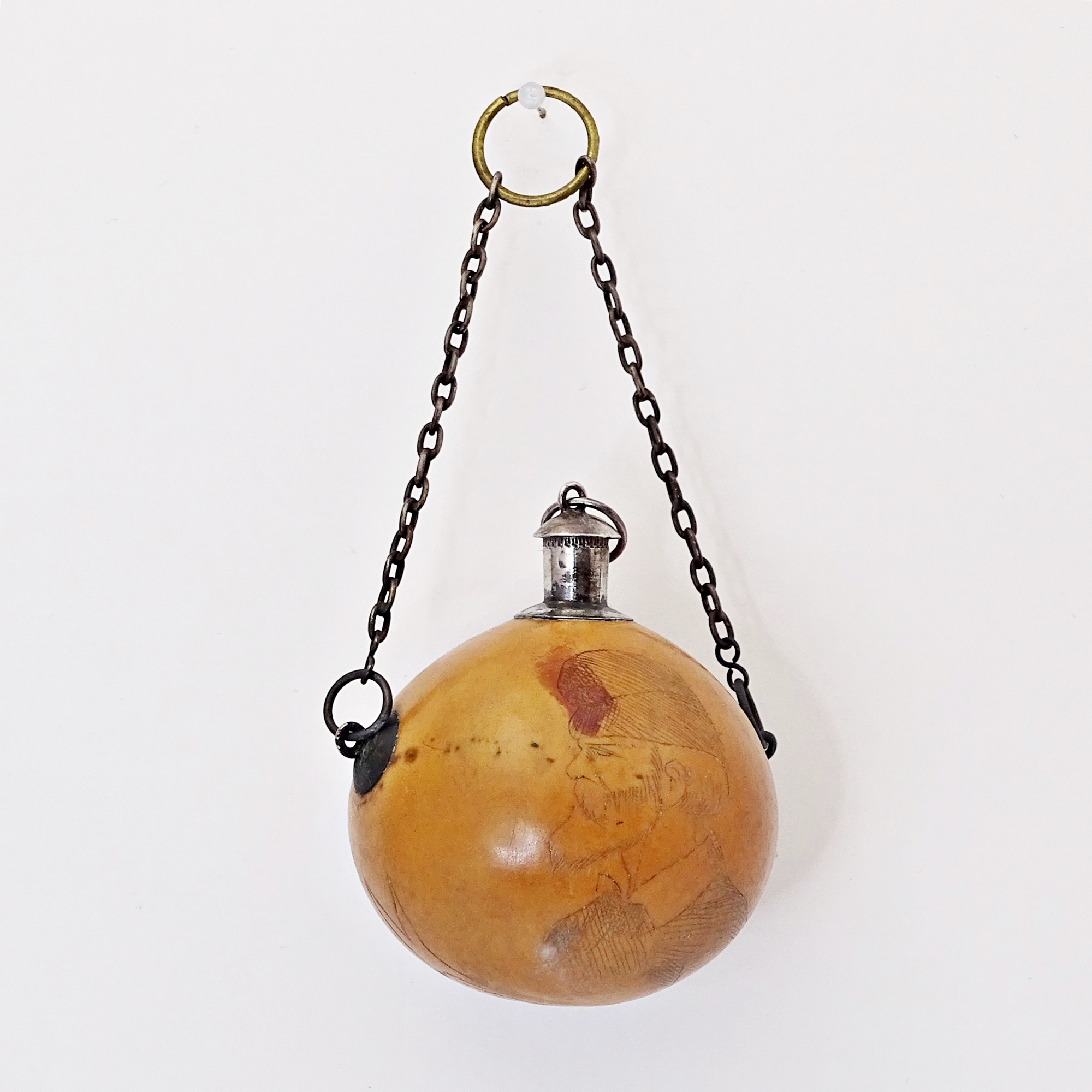 Scent bottle obtained by a dried little pumpkin (Corsican gourd) with two pyrographies: on the front the profile of a man with the characteristic Phrygian cap and the word Ajaccio; on the back a flower with six petals. The neck, the cap with cork and the chain are silver, but the ring seems to be brass.