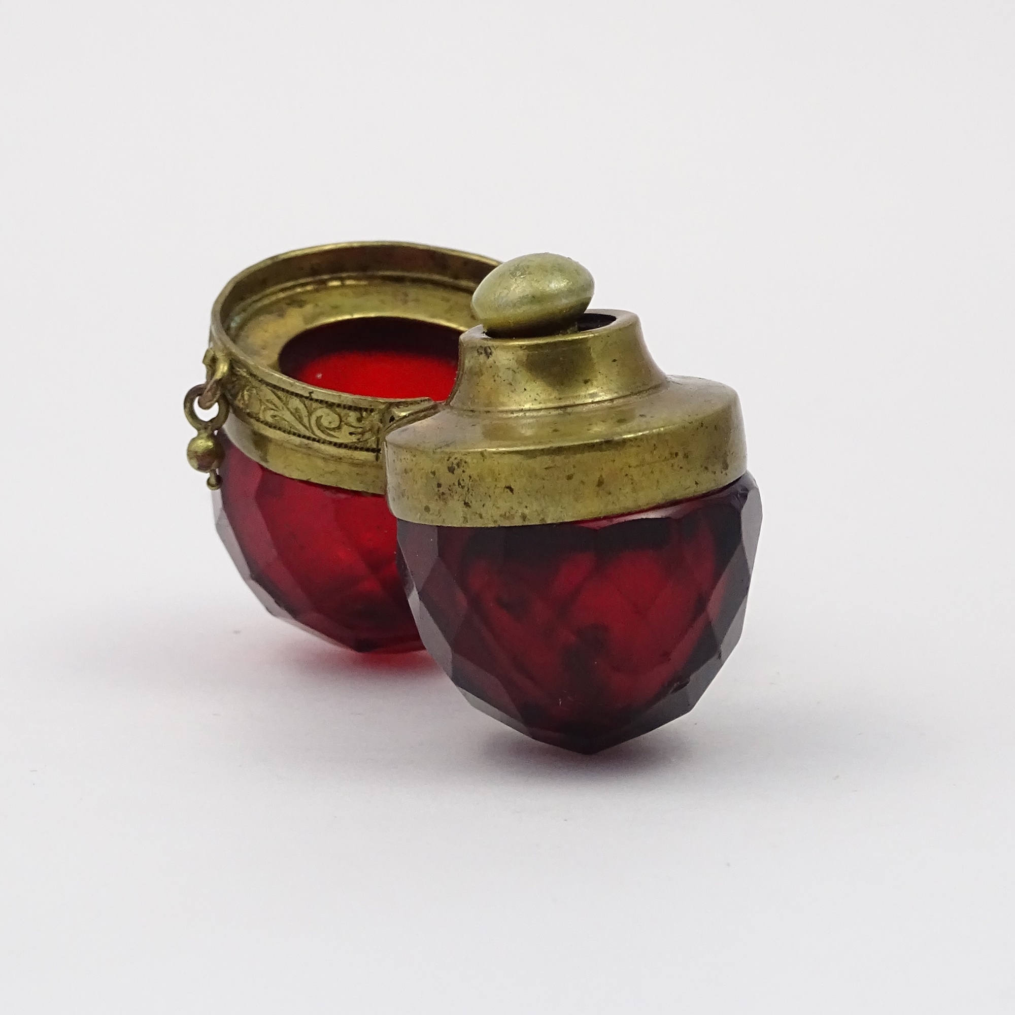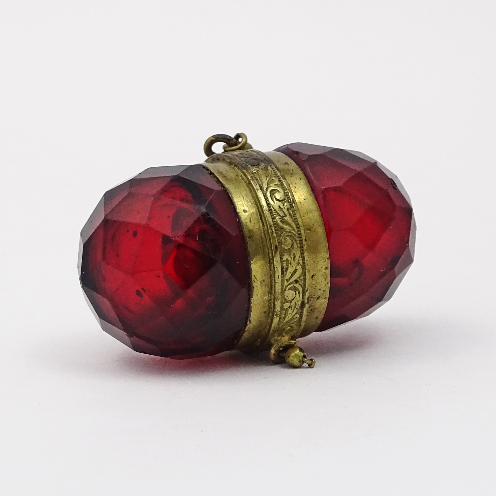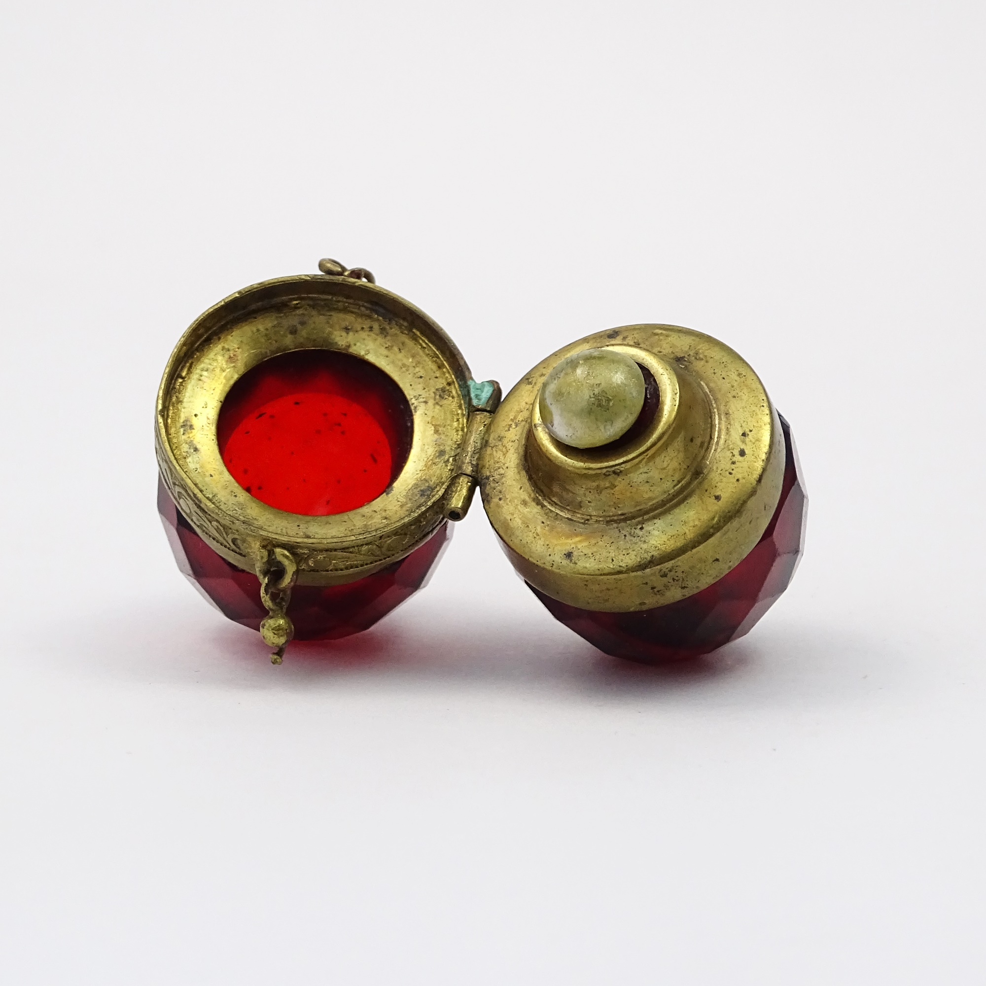 Egg-haped faceted red crystal scent bottle. Hinged closure in bronze dore with loops. It opens to reveal a tiny gold glass stopper.