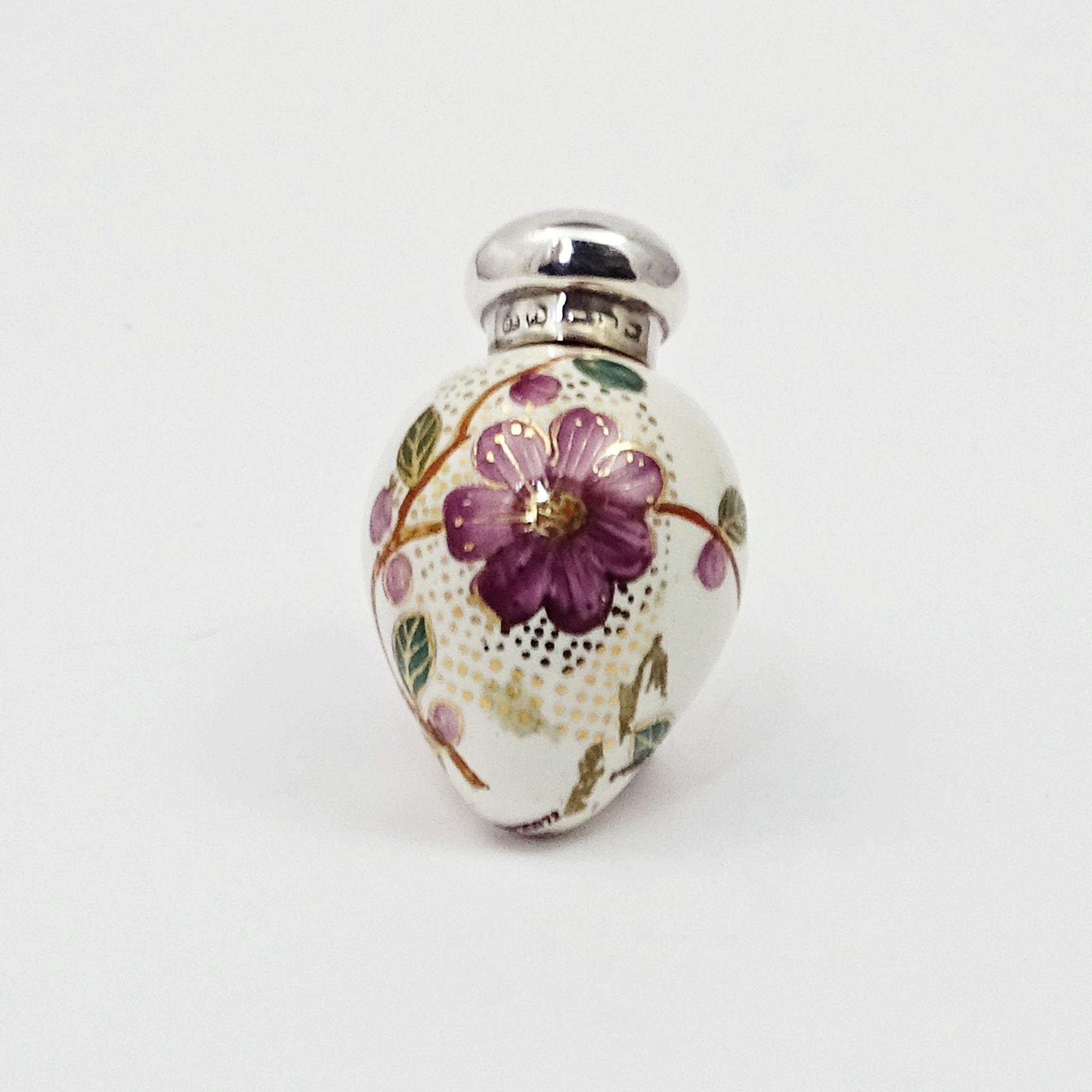 Egg shaped white porcelain scent bottle, painted with a floral decor inspired by Japan. Silver cap, full hallmarked, but city and date illegible, CS FS for Cornelius Saunders & Francis Sheperd, silversmiths.