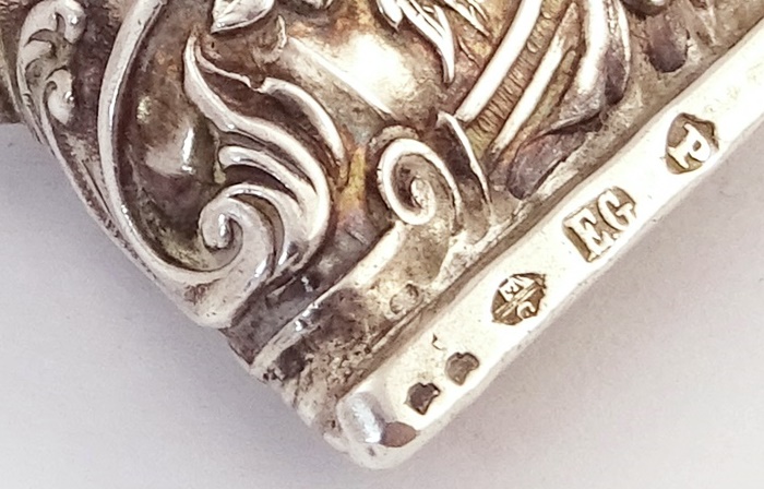 Embossed silver scent bottle in the shape of a tube of paint with a screw cap. In the center a smooth medallion, engraved with the monogram IS. Silver hallmarks not yet identified.