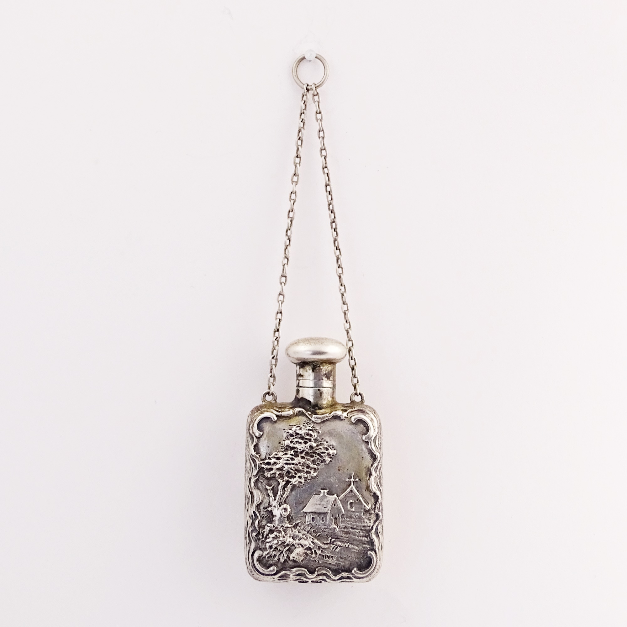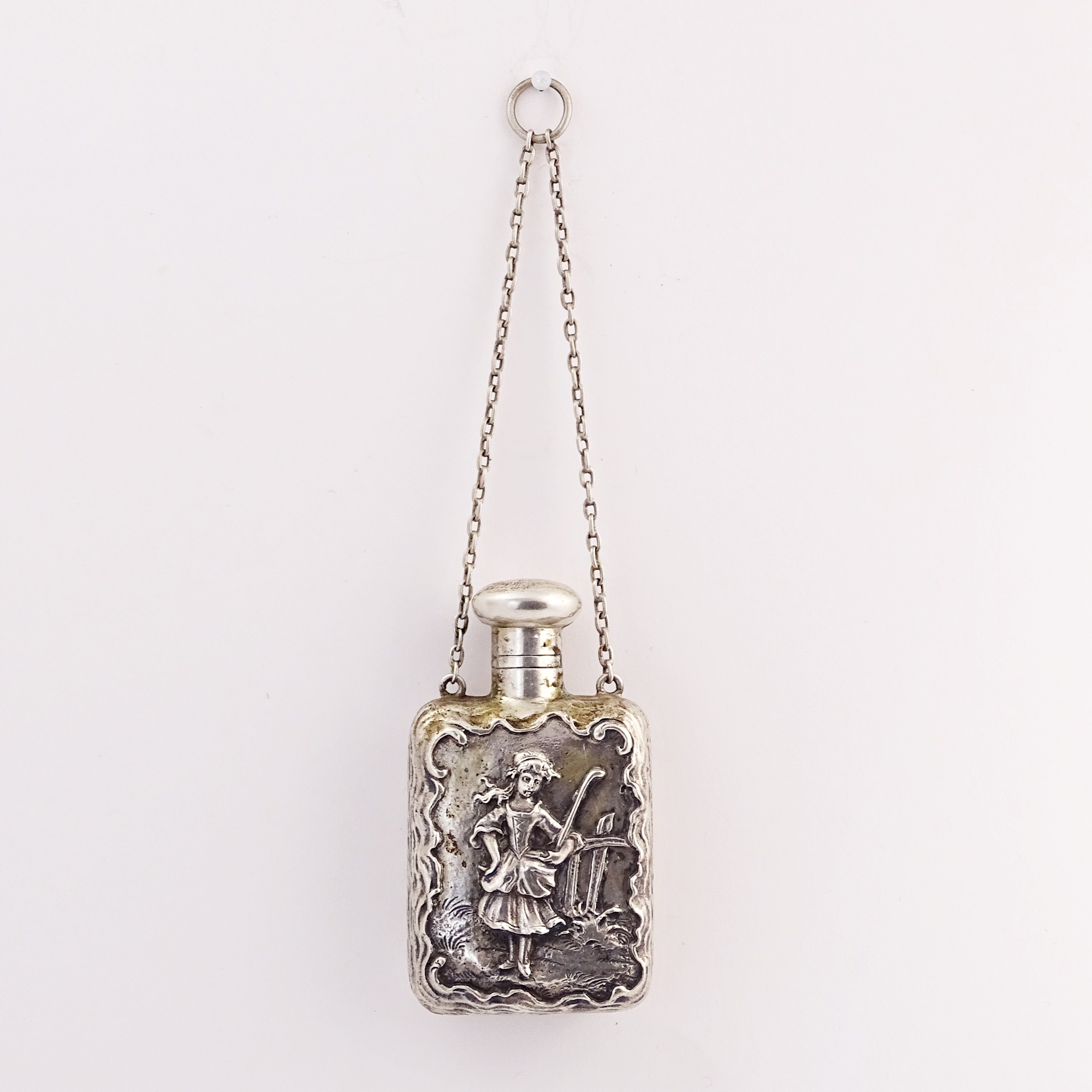Embossed silver scent bottle with rural scenes: a young shepherdess on one side and a landscape on the other one. Screw cap (stuck) and suspension chain. Marks for German silver.