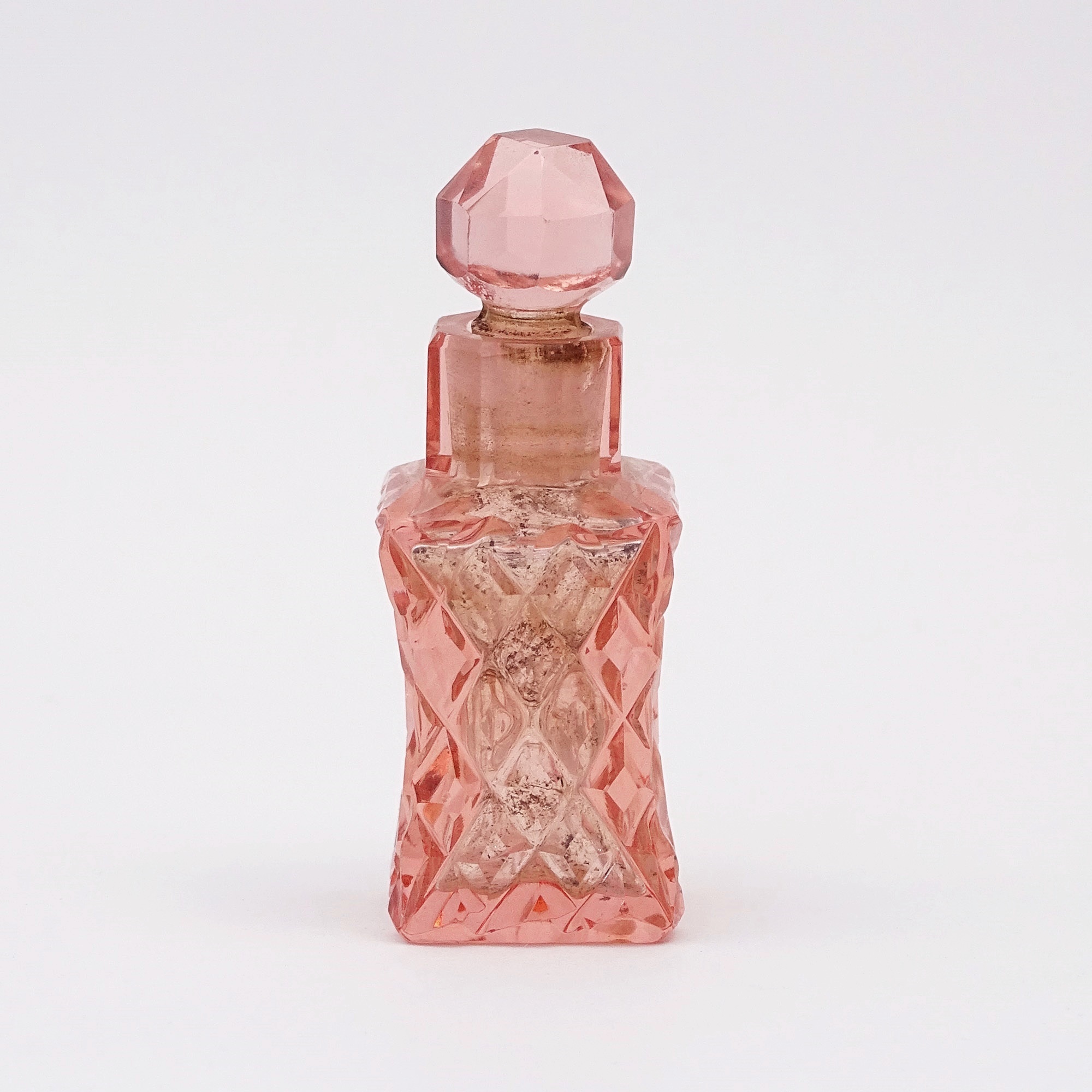 Home » Collection » Faceted glass scent bottle in a vivid pink colour with matching globular cap