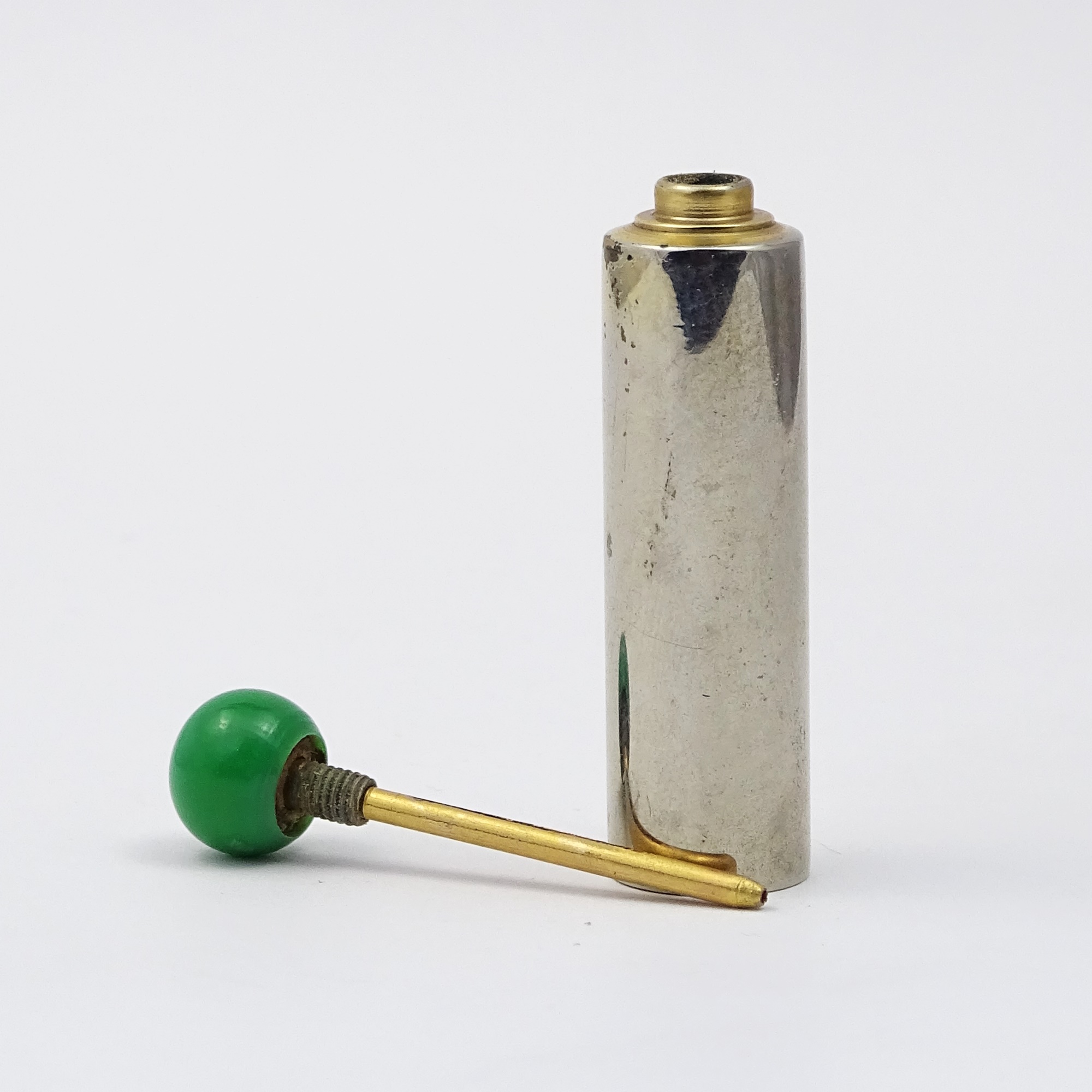 Home » Collection » Smooth cylindrical metal scent bottle with turquoise Bakelite cap