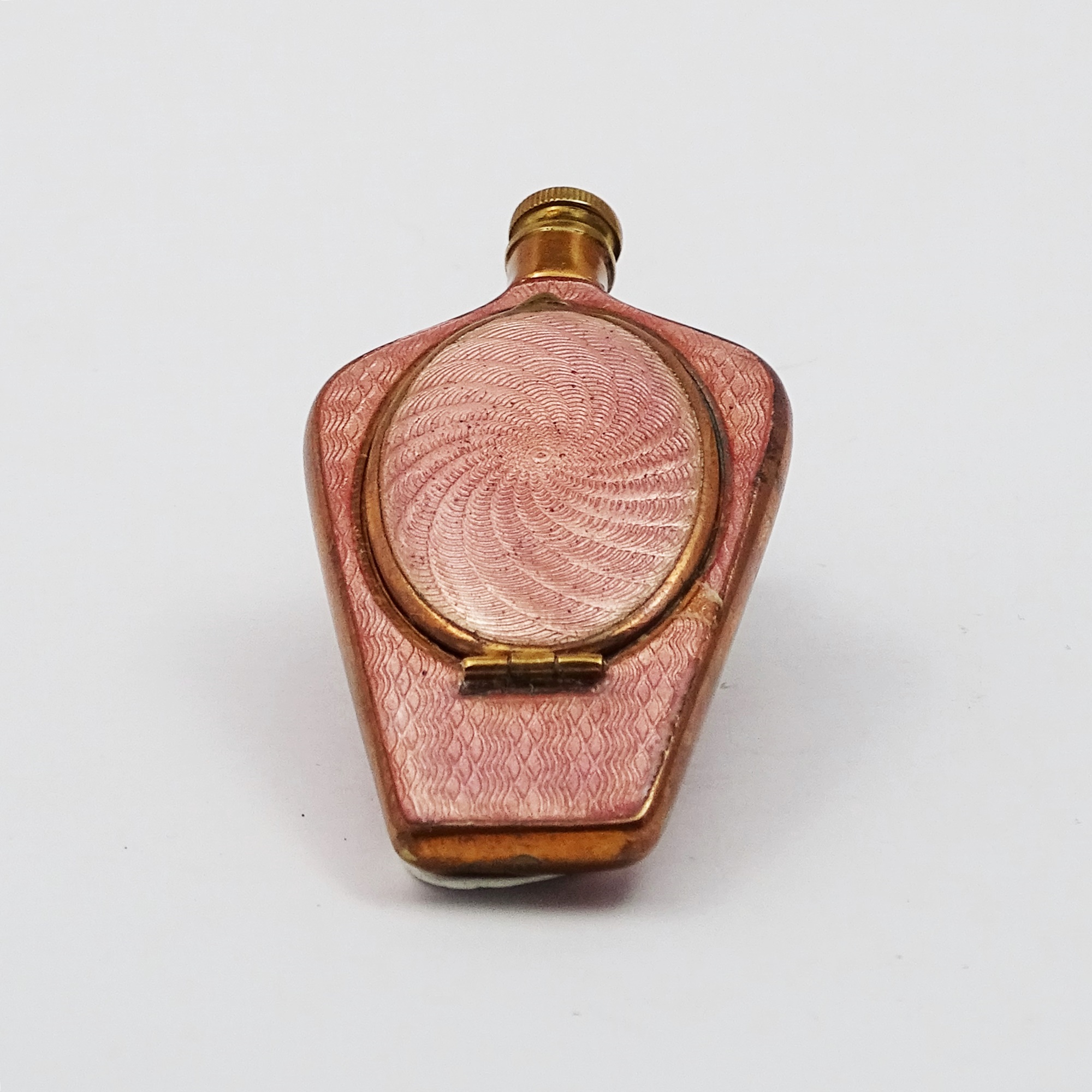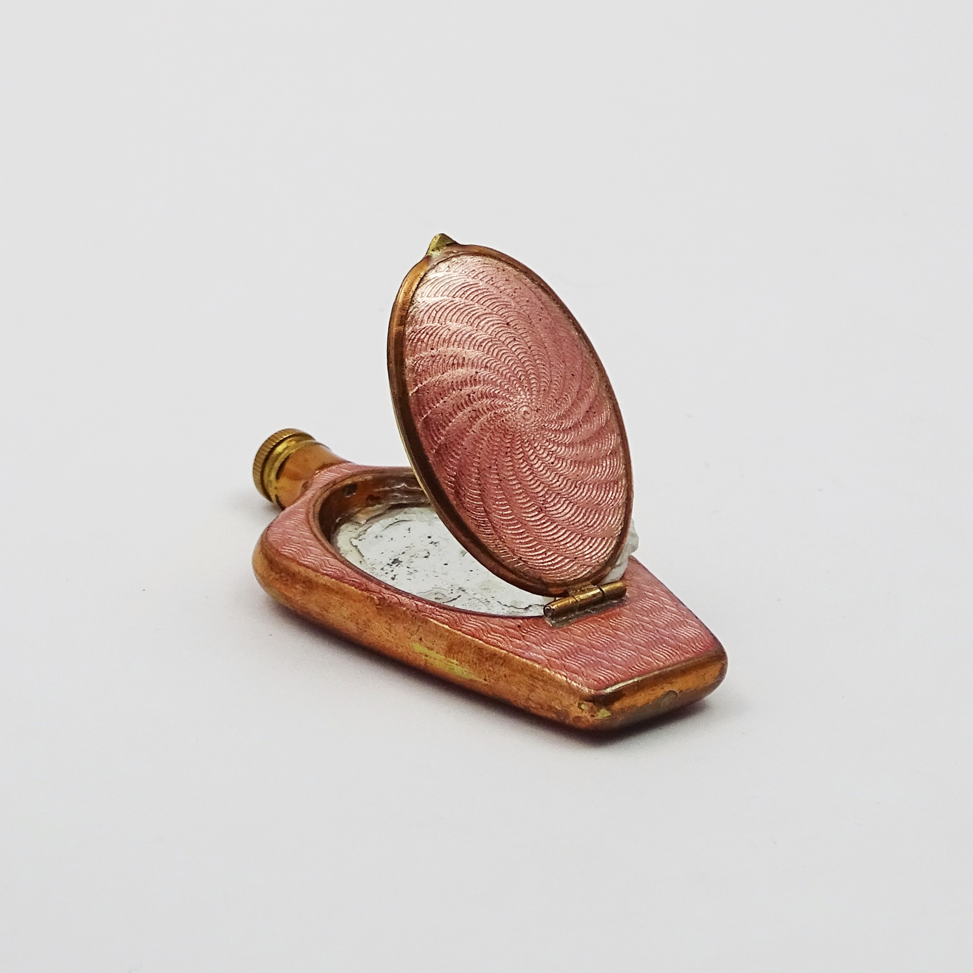 Flat copper bottle covered in antique pink guilloche enamel. The enamel design is different on the hinged lid, where it forms a radial pattern. It opens to reveal an oval mirror and is rimmed with copper. The screw cap is also in copper.