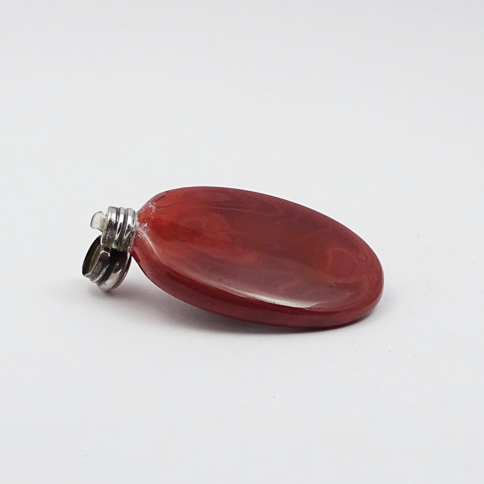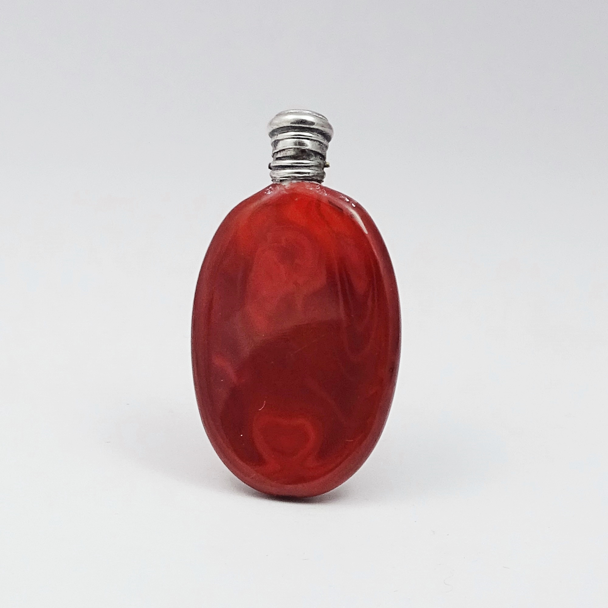 Flat oval scent bottle made in amaranth lithyalin glass, an opaque or translucent marbled glass with a surface like polished gemstones. It was first made by the Bohemian glass artist Friedrich Egermann in 1829, then copied by other Bohemian and French manufacturers. Hinged silver cap with mark.